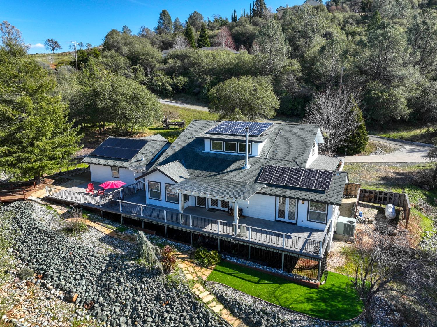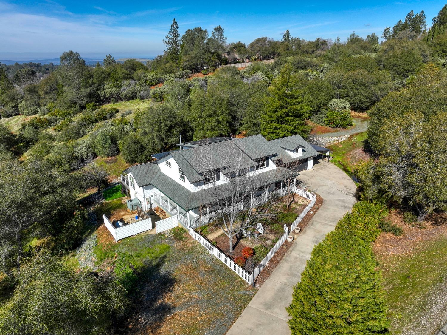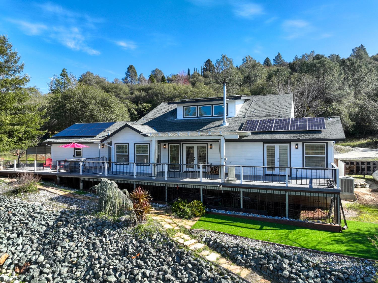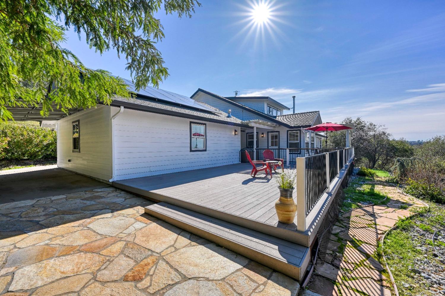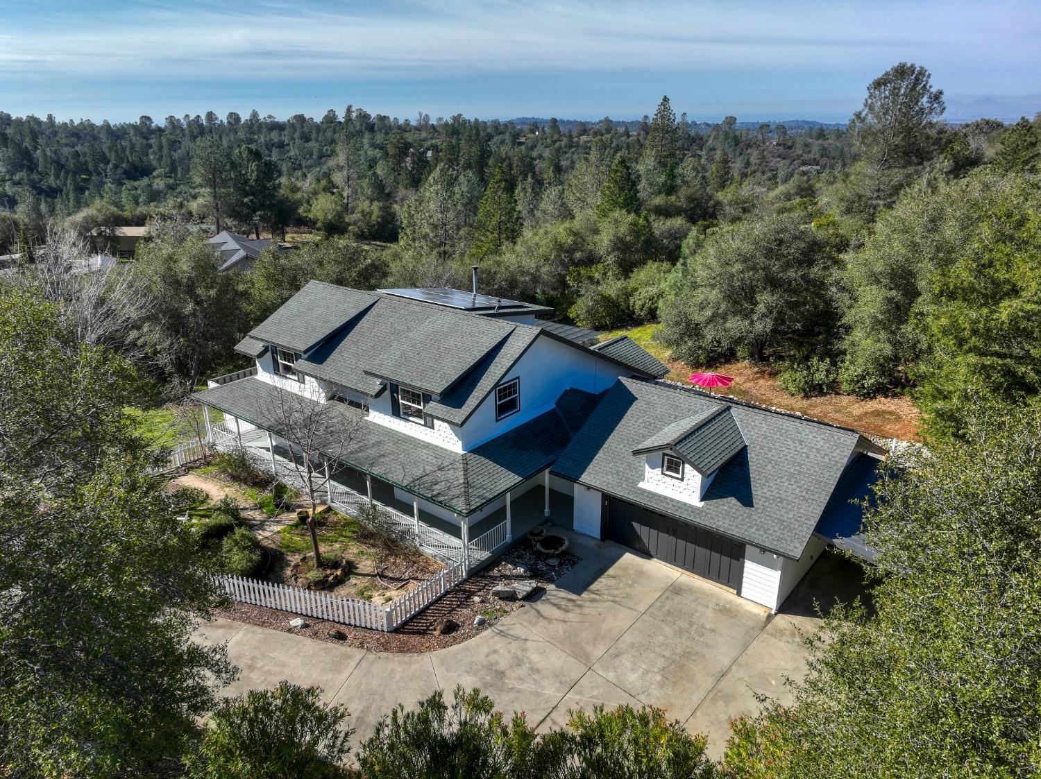 This beautifully remodeled home blends timeless charm with modern updates. A front wrap-around porch with a swing invites you into the light-filled living room, which seamlessly connects to the formal dining area, breakfast nook, and master suite. Two bathrooms feature elegant clawfoot tubs, and contemporary fixtures brighten every space. The master suite offers a cozy seating area, a spacious en-suite bath with a tub and double shower, a walk-in closet, and direct access to the expansive deck. The second bedroom is conveniently located on the main floor. Upstairs, a loft spans the width of the house, with a third bedroom, office area, and full bath. The kitchen features a charming Dutch door, and French doors open to the deck from both the living room and master bedroom. A vaulted ceiling with a statement chandelier creates a stunning focal point, while a firewood stove heats the entire home. Outside, enjoy breathtaking sunsets and twinkling lights of Marysville from the wrap-around deck. The property also offers hiking trails, a potential guest unit building pad, and access to a back road. With owned solar panels, forever views, RV access, this home combines sustainability, style, and comfort.
