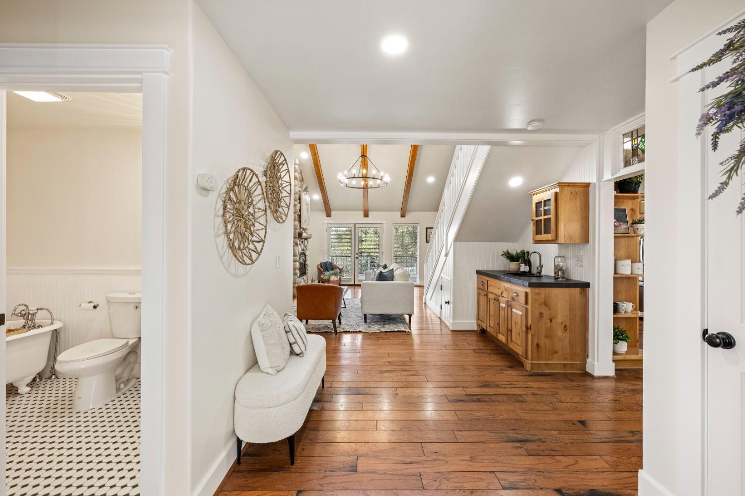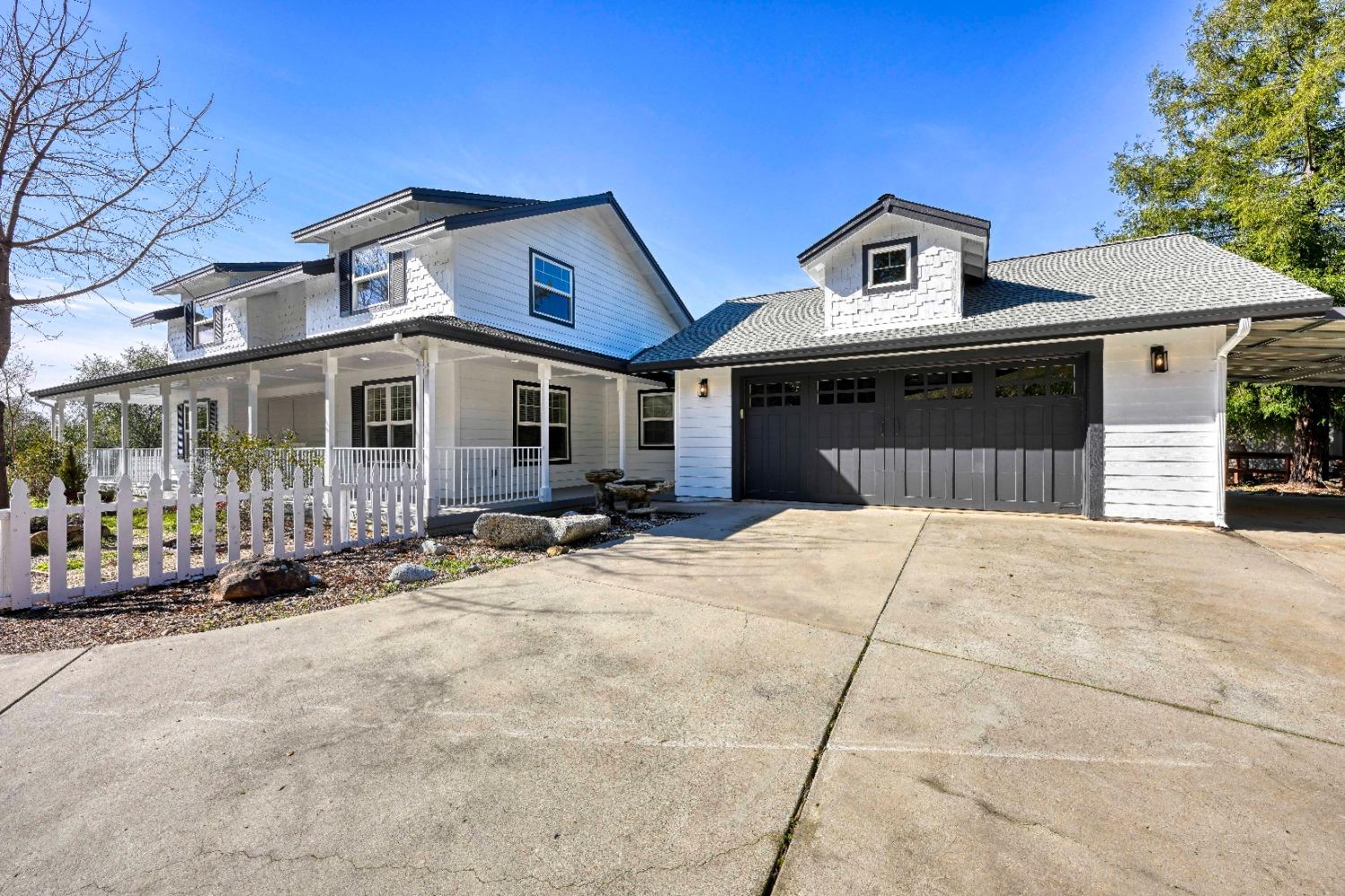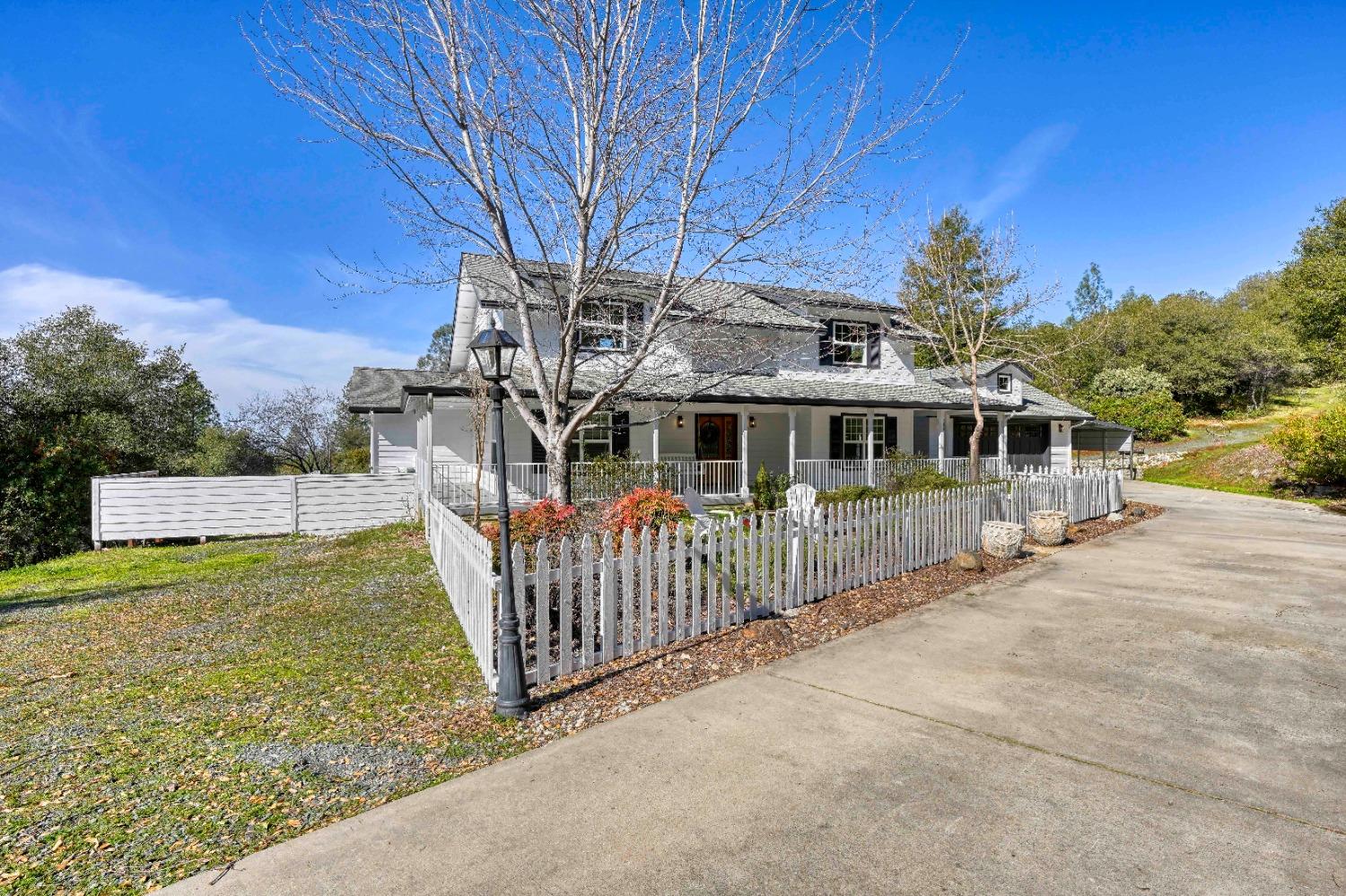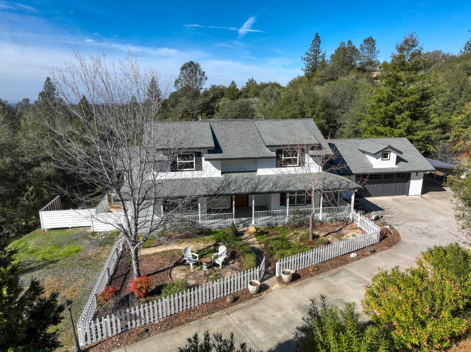 This beautifully remodeled home blends timeless charm with modern updates. A front wrap-around porch with a swing invites you into the light-filled living room, which seamlessly connects to the formal dining area, breakfast nook, and master suite. Two bathrooms feature elegant clawfoot tubs, and contemporary fixtures brighten every space. The master suite offers a cozy seating area, a spacious en-suite bath with a tub and double shower, a walk-in closet, and direct access to the expansive deck. The second bedroom is conveniently located on the main floor. Upstairs, a loft spans the width of the house, with a third bedroom, office area, and full bath. The kitchen features a charming Dutch door, and French doors open to the deck from both the living room and master bedroom. A vaulted ceiling with a statement chandelier creates a stunning focal point, while a firewood stove heats the entire home. Outside, enjoy breathtaking sunsets and twinkling lights of Marysville from the wrap-around deck. The property also offers hiking trails, a potential guest unit building pad, and access to a back road. With owned solar panels, forever views, RV access, this home combines sustainability, style, and comfort.