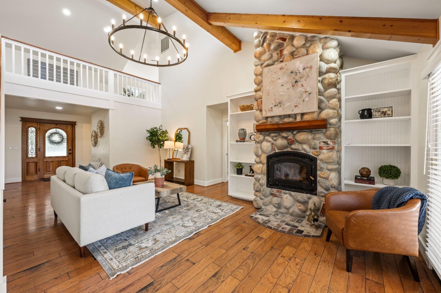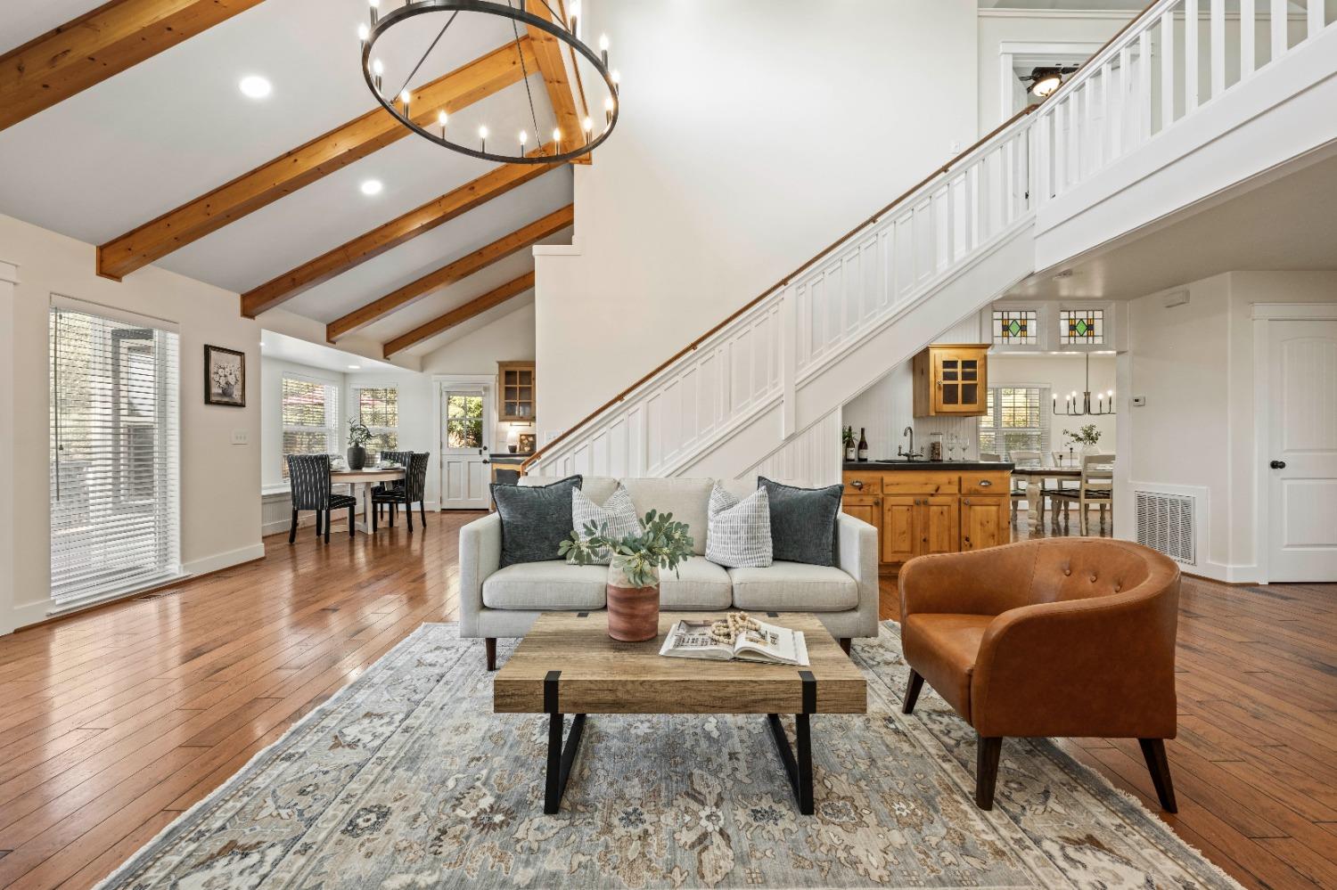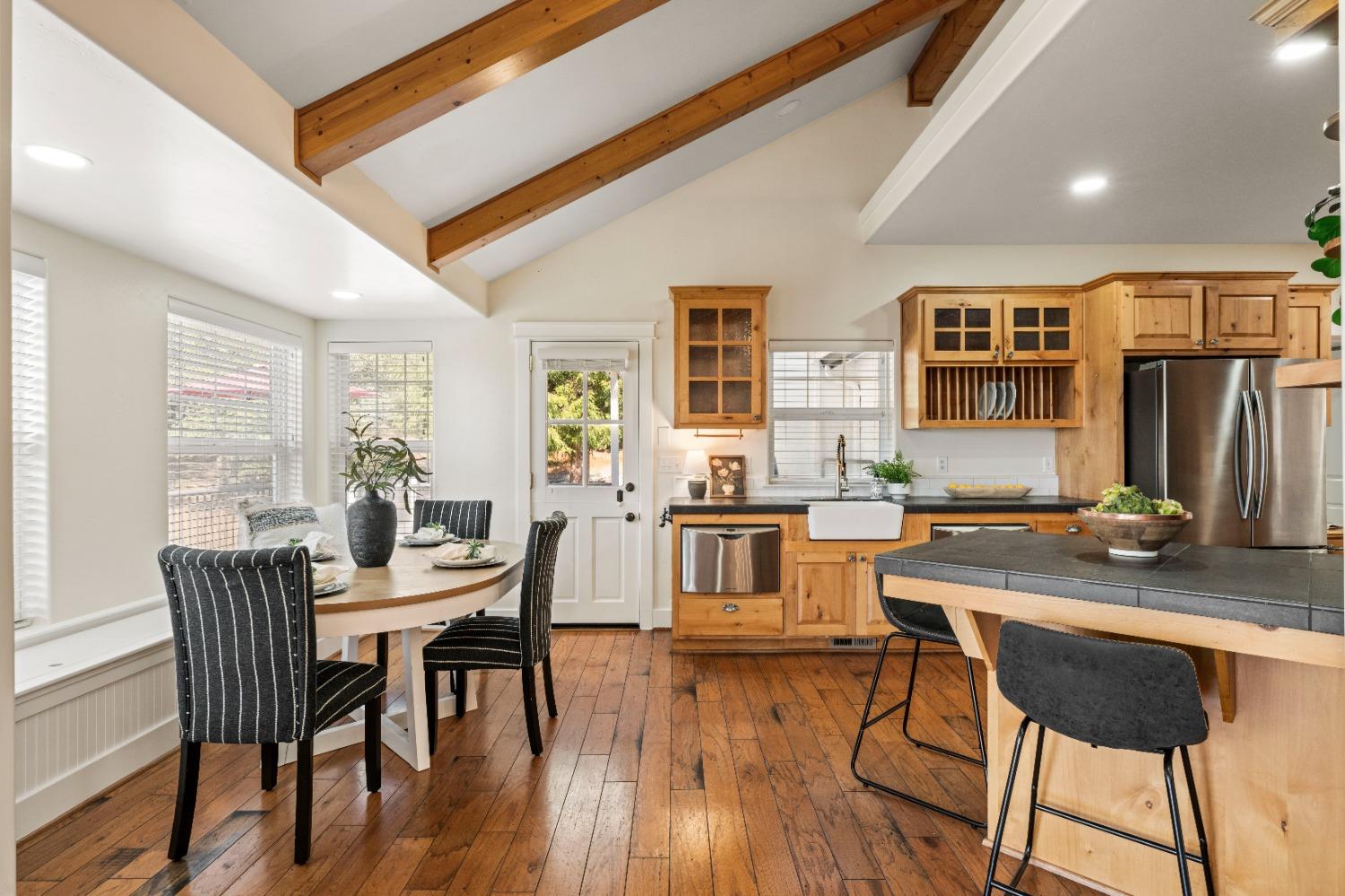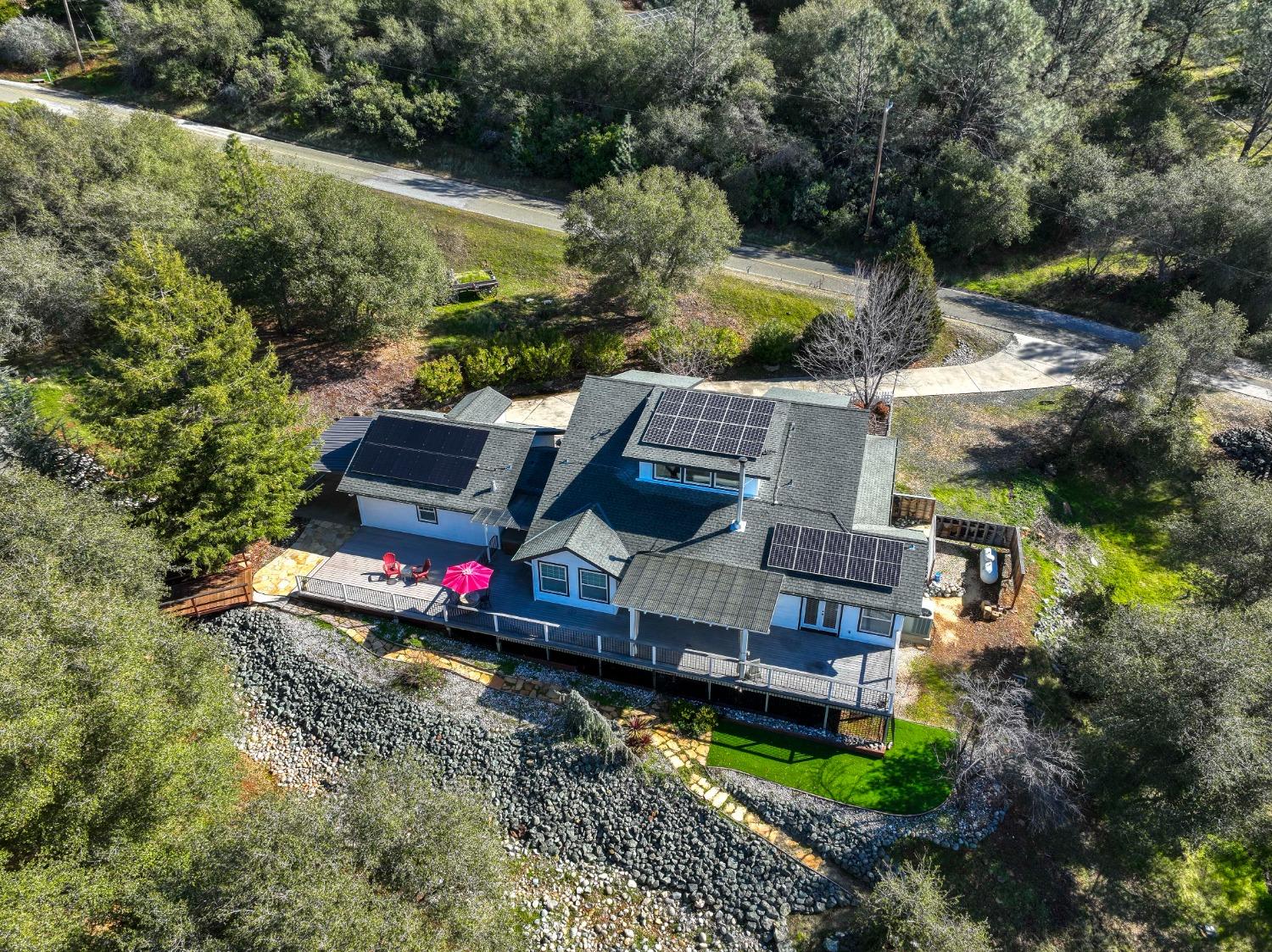 This beautifully remodeled home blends timeless charm with modern updates. A front wrap-around porch with a swing invites you into the light-filled living room, which seamlessly connects to the formal dining area, breakfast nook, and master suite. Two bathrooms feature elegant clawfoot tubs, and contemporary fixtures brighten every space. The master suite offers a cozy seating area, a spacious en-suite bath with a tub and double shower, a walk-in closet, and direct access to the expansive deck. The second bedroom is conveniently located on the main floor. Upstairs, a loft spans the width of the house, with a third bedroom, office area, and full bath. The kitchen features a charming Dutch door, and French doors open to the deck from both the living room and master bedroom. A vaulted ceiling with a statement chandelier creates a stunning focal point, while a firewood stove heats the entire home. Outside, enjoy breathtaking sunsets and twinkling lights of Marysville from the wrap-around deck. The property also offers hiking trails, a potential guest unit building pad, and access to a back road. With owned solar panels, forever views, RV access, this home combines sustainability, style, and comfort.
