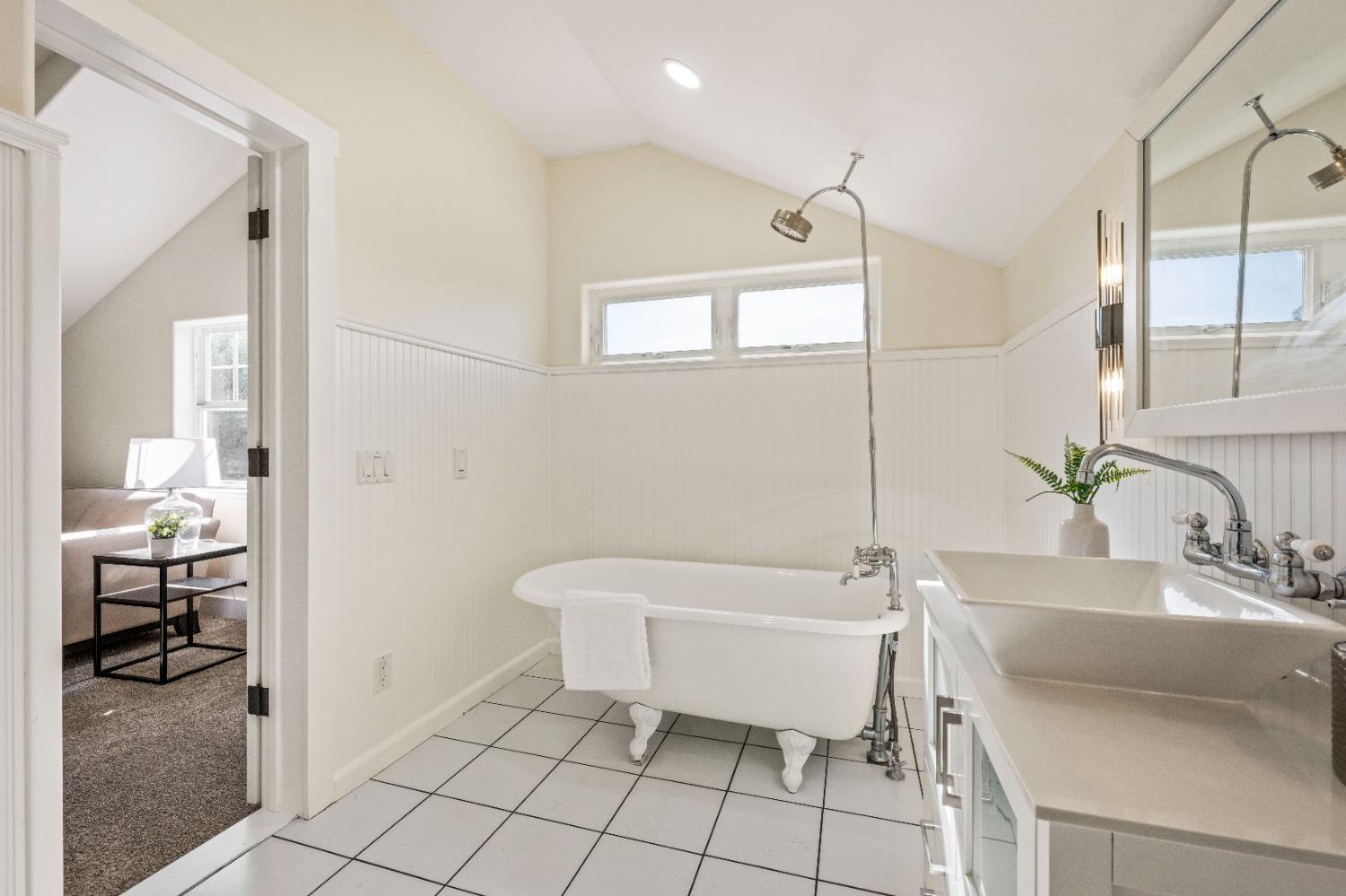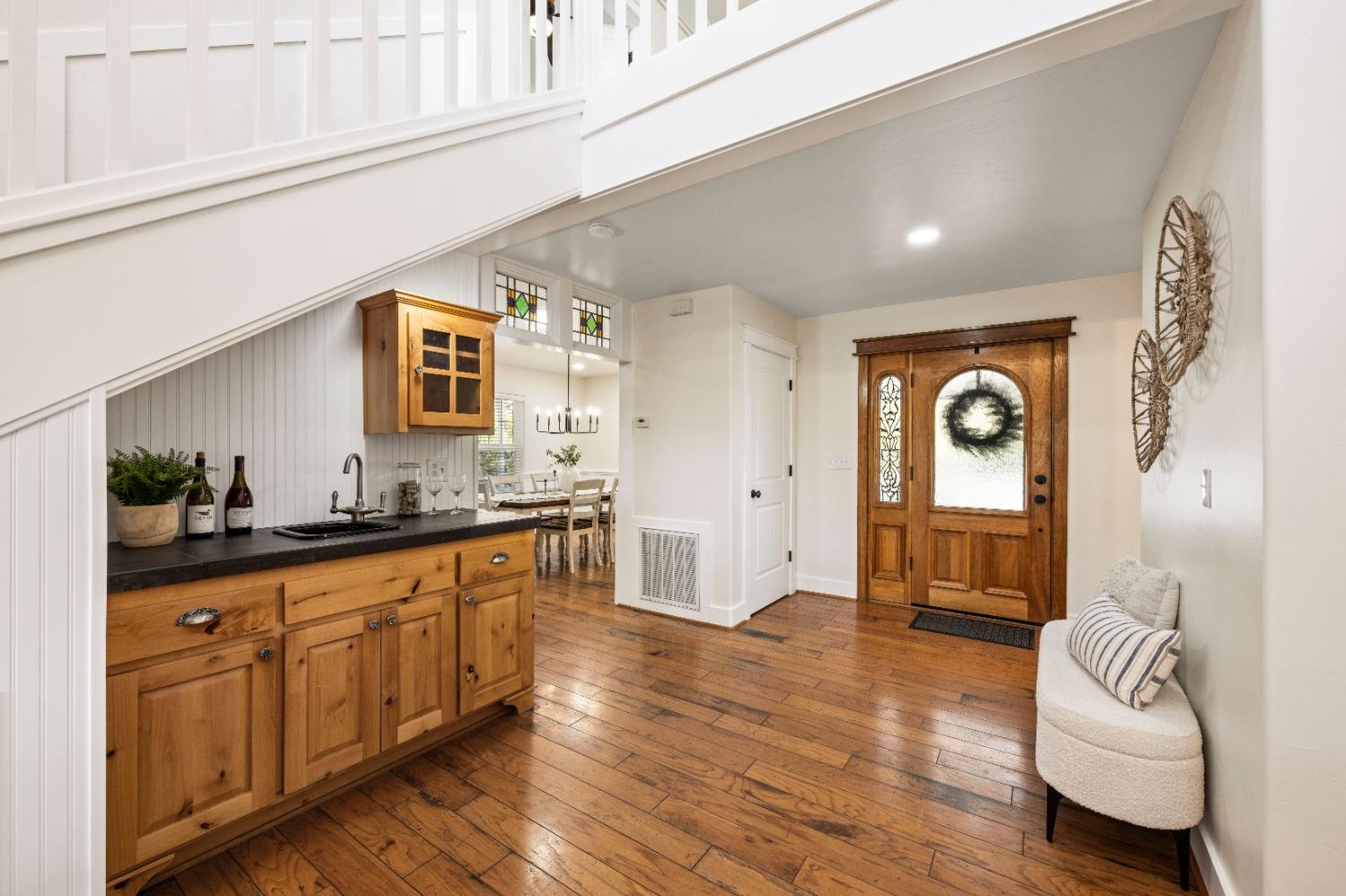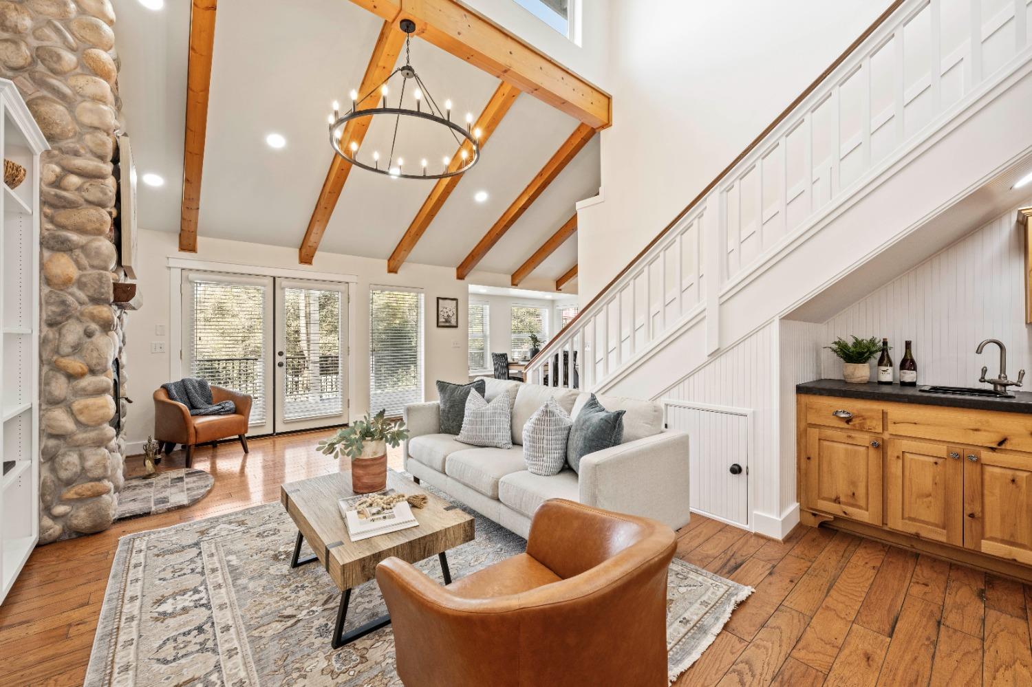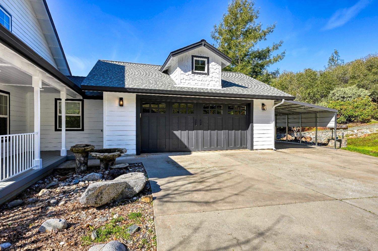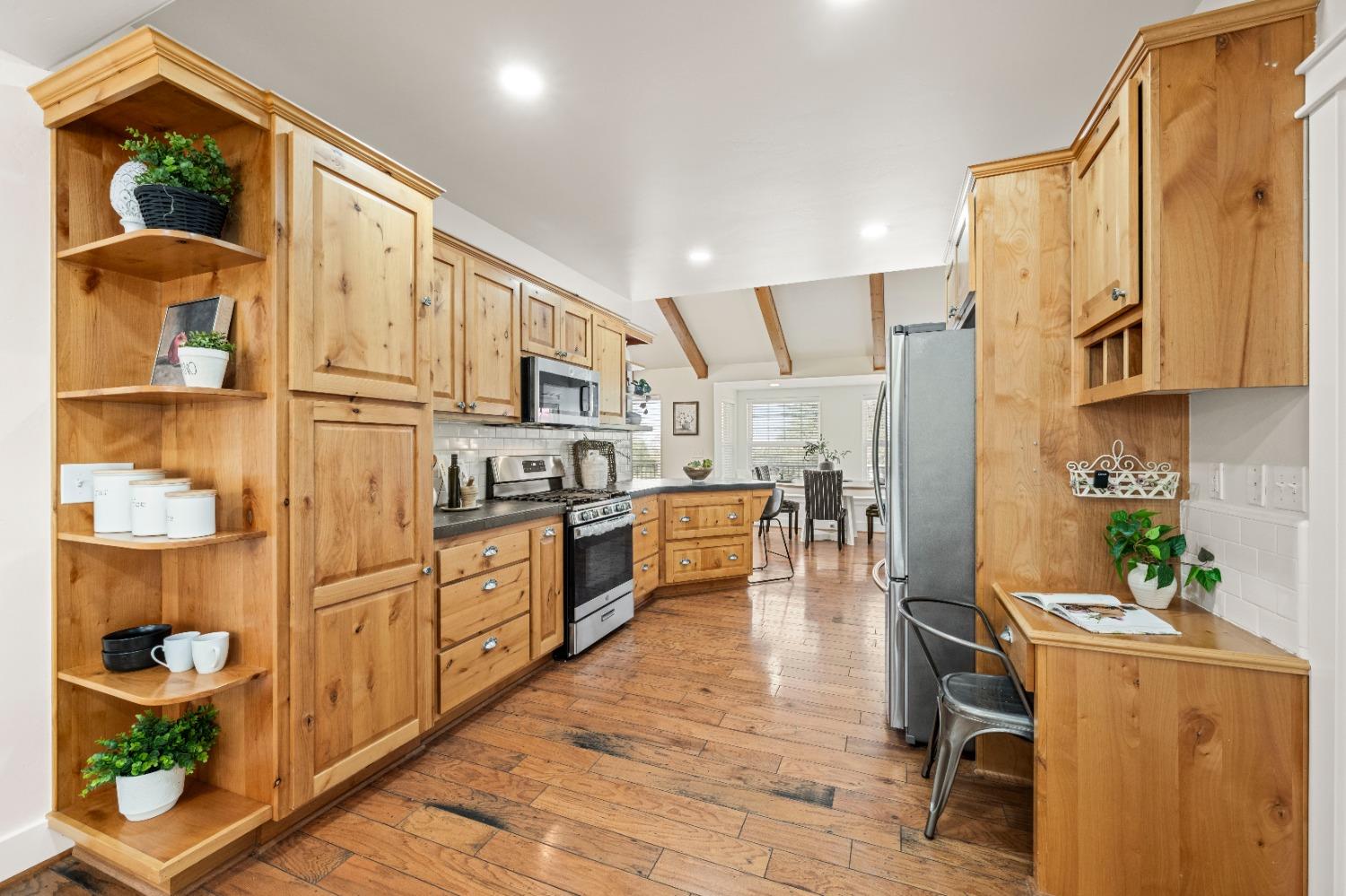 This beautifully remodeled home blends timeless charm with modern updates. A front wrap-around porch with a swing invites you into the light-filled living room, which seamlessly connects to the formal dining area, breakfast nook, and master suite. Two bathrooms feature elegant clawfoot tubs, and contemporary fixtures brighten every space. The master suite offers a cozy seating area, a spacious en-suite bath with a tub and double shower, a walk-in closet, and direct access to the expansive deck. The second bedroom is conveniently located on the main floor. Upstairs, a loft spans the width of the house, with a third bedroom, office area, and full bath. The kitchen features a charming Dutch door, and French doors open to the deck from both the living room and master bedroom. A vaulted ceiling with a statement chandelier creates a stunning focal point, while a firewood stove heats the entire home. Outside, enjoy breathtaking sunsets and twinkling lights of Marysville from the wrap-around deck. The property also offers hiking trails, a potential guest unit building pad, and access to a back road. With owned solar panels, forever views, RV access, this home combines sustainability, style, and comfort.