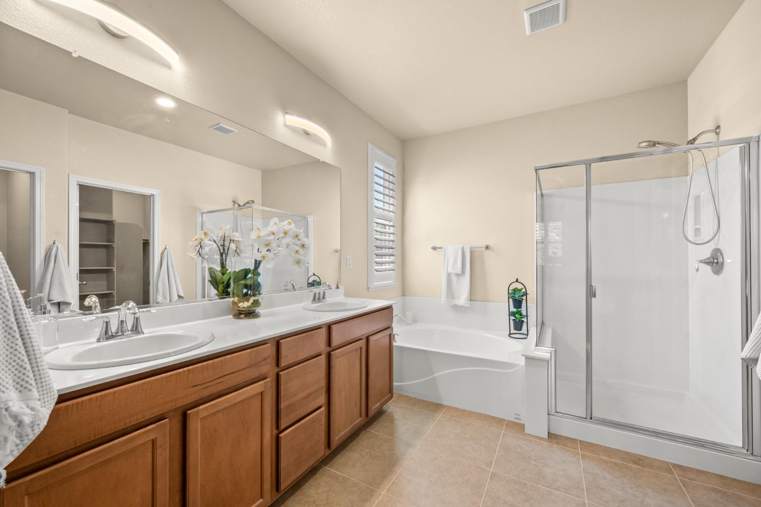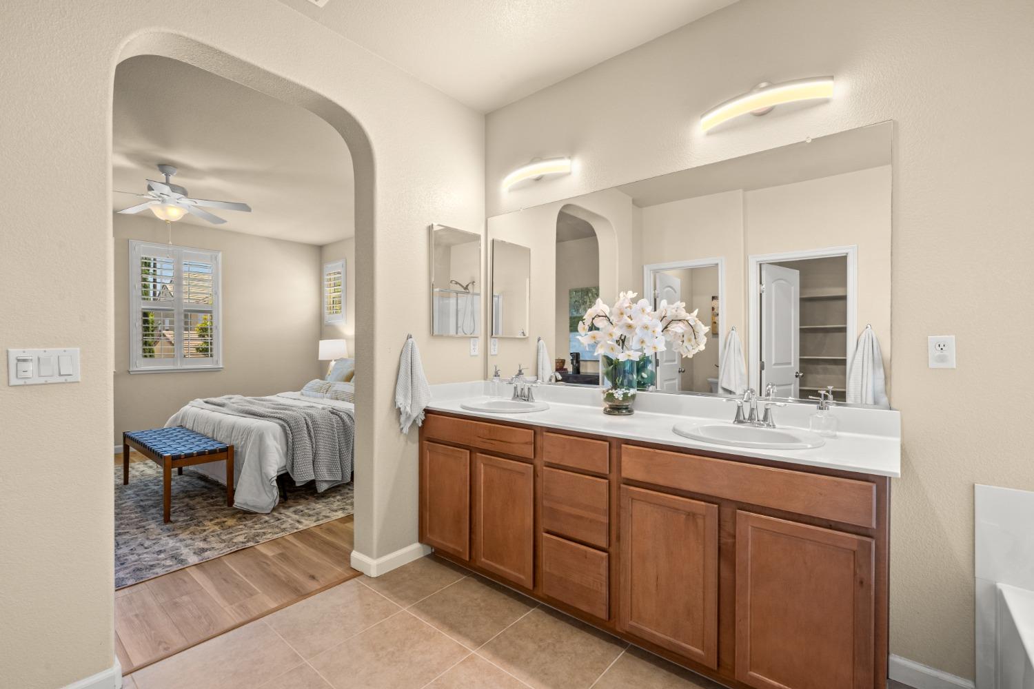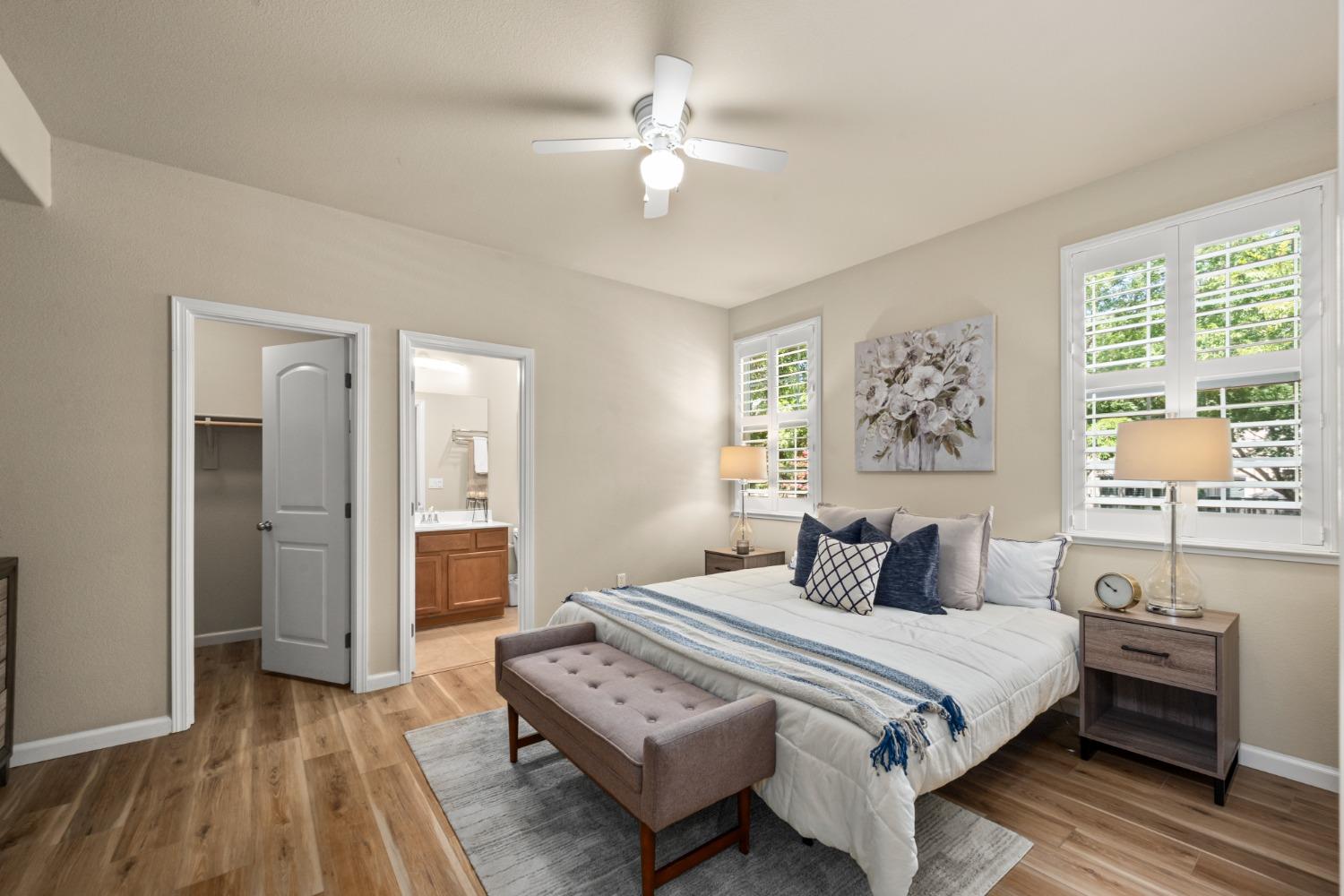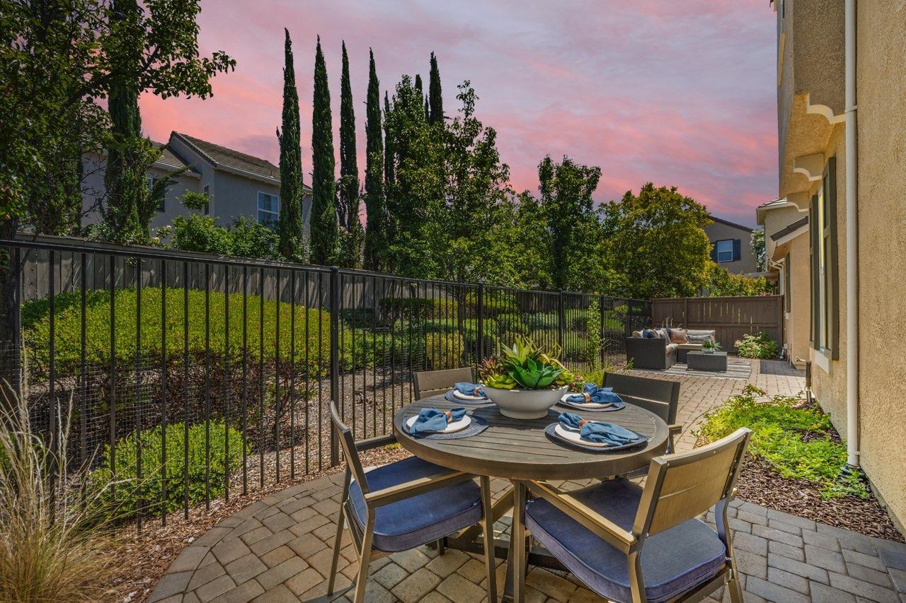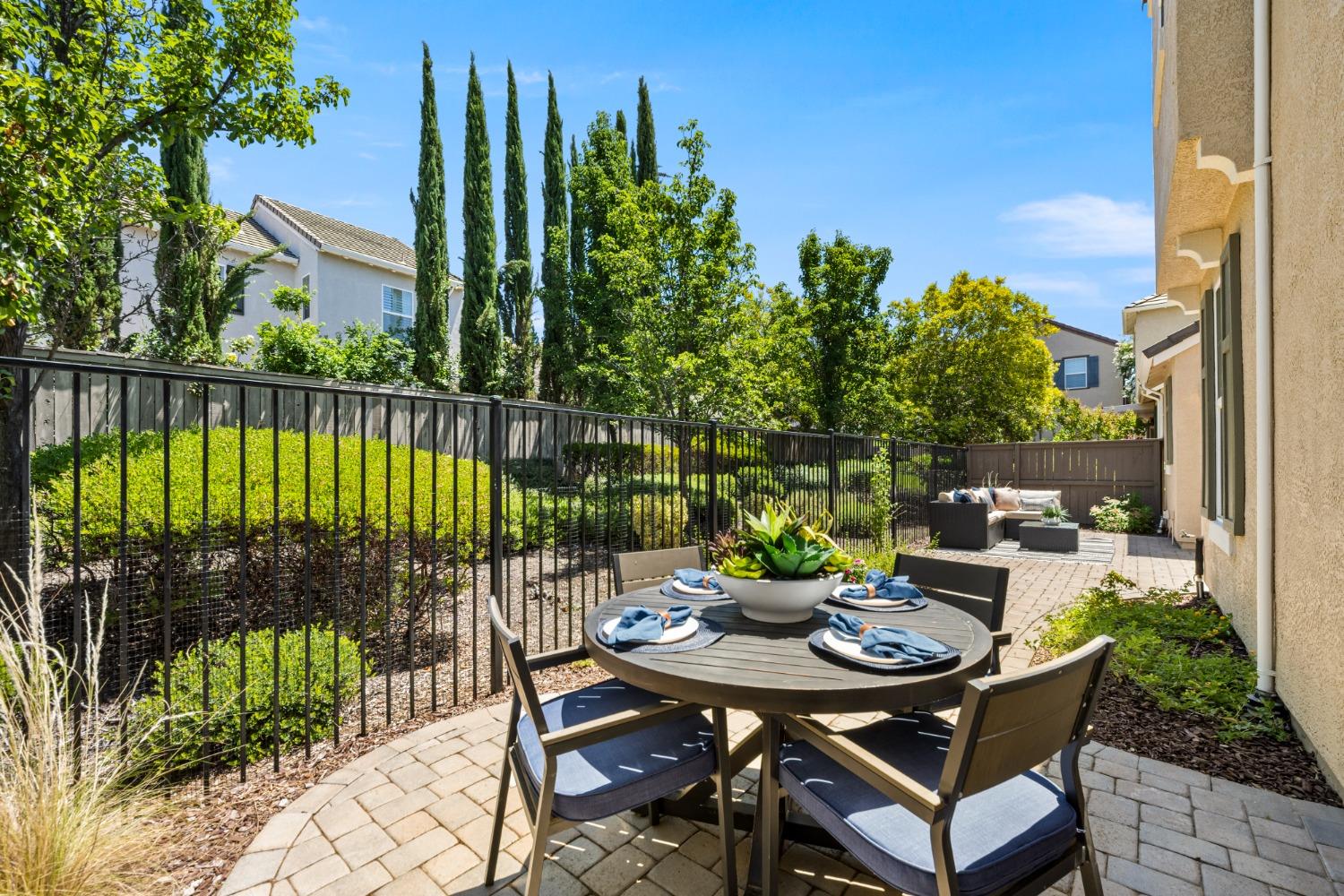 Nestled within the tree-lined streets of the gated community of Villemont, this home offers a tranquil and secure environment, complemented by community amenities including a pool, spa, gym, clubhouse, and park. Upon entering, you'll be greeted by high ceilings that add a sense of spaciousness and sophistication to the home. The layout provides flexible spaces, allowing for seamless adaptation to various lifestyle needs. Its thoughtfully designed floor plan, with primary suites on each floor, creates an opportunity for multi-generational living, catering to diverse family dynamics. The kitchen is a chef's delight with granite countertops, stainless steel appliances, and a layout that opens to both the living area and an inviting eat-in kitchen. The island features bar seating, perfect for casual meals or entertaining guests. Upstairs you will find a generously sized primary suite, 2 additional bedrooms, a laundry room and a loft that presents an ideal setting for an office, home gym, or second living area. With ample storage spaces and large closets, this home ensures organizational ease. Step outside to discover a backyard oasis that doesn't share any fences, and opens to an expansive area of mature landscaping that provides a serene buffer between you and the neighbors.