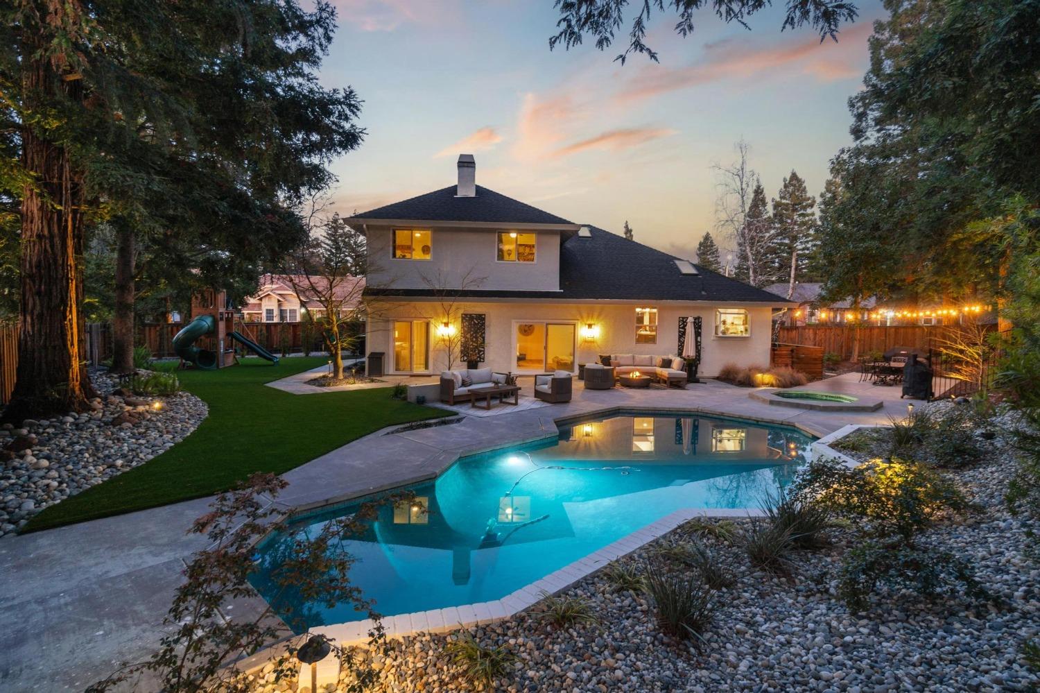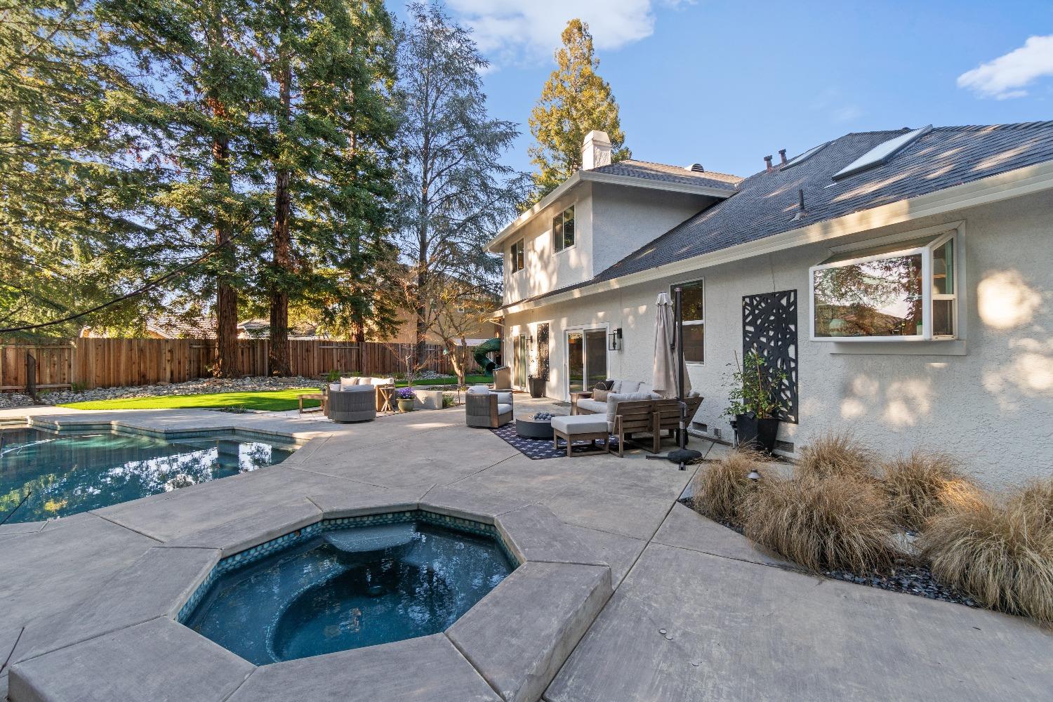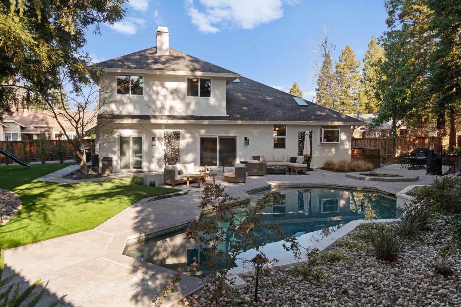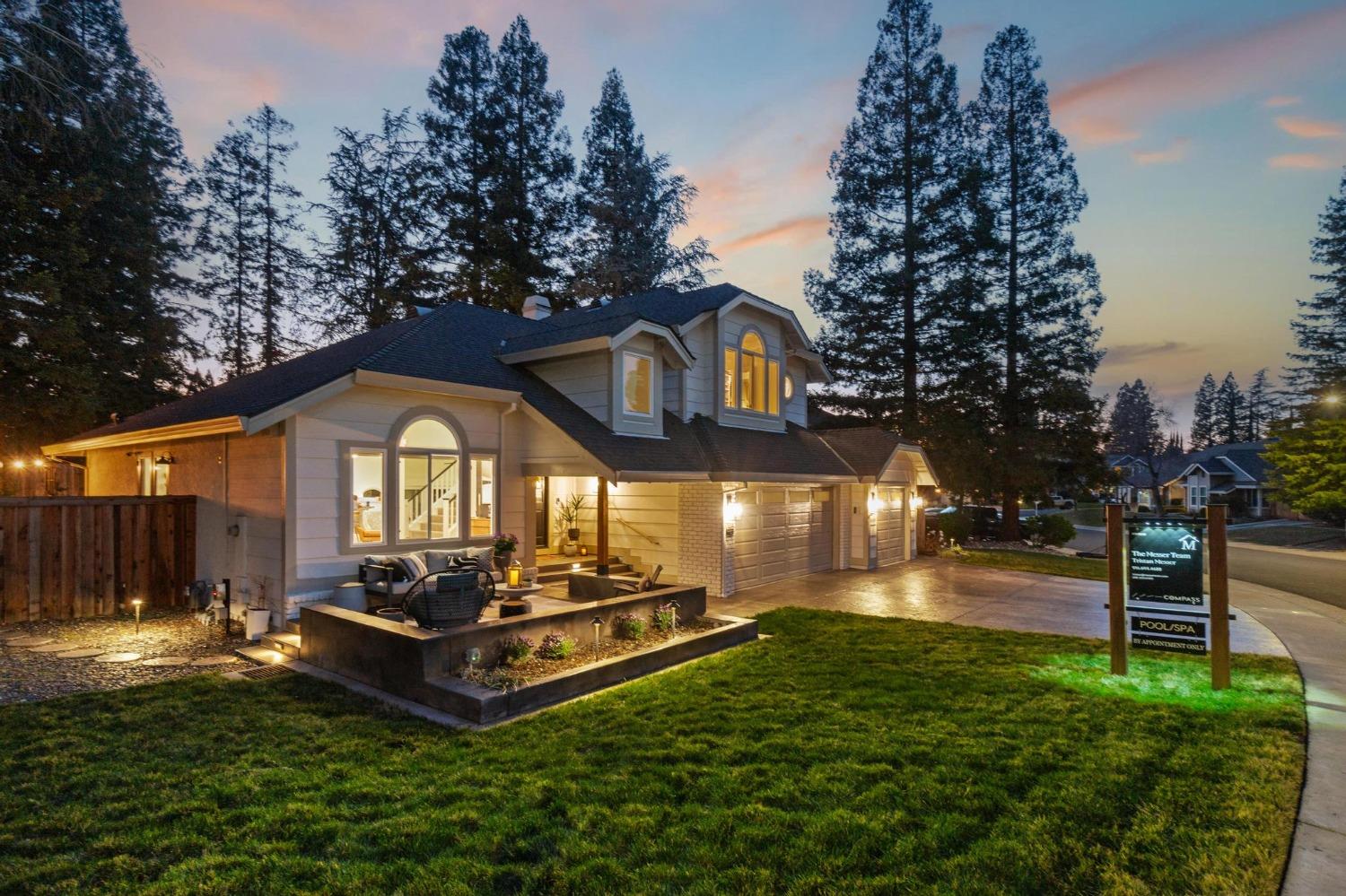 Perfectly positioned on a circular drive on a 1/3 acre lot in the sought after Huntington Oaks neighborhood. Nearly every part of this one-of-a-kind home has been thoughtfully and meticulously updated and remodeled, both inside and out. Elegant sight lines at every turn make it feel like you're living in a vacation home. The show stopper kitchen is completely custom with 10' ceilings and skylight, maple cabinetry and custom-designed pantry, 6-burner gas cooktop, 8' island, quartzite slab counters, designer inspired tile backsplash, bev fridge and more. Drenched in natural light thanks to the many skylights, panel glass doors and an abundance of windows. Upstairs primary suite offers a true retreat with an oversized shower with dual shower heads, furniture piece vanity with dual sinks plus makeup vanity and generously sized walk-in closet. 2 more ample sized bedrooms and a hall bath round out the upstairs. Downstairs provides a remote 4th bedroom and 3rd full bath making it the perfect guest suite or office space. The backyard is an experience. Tahoe-like trees create the backdrop for a professionally designed yard with pool, spa, large turf area, lighting and multiple seating areas. 3 car garage. No HOA or Mello Roos! Properties of this caliber are a rare offering. Make it yours!