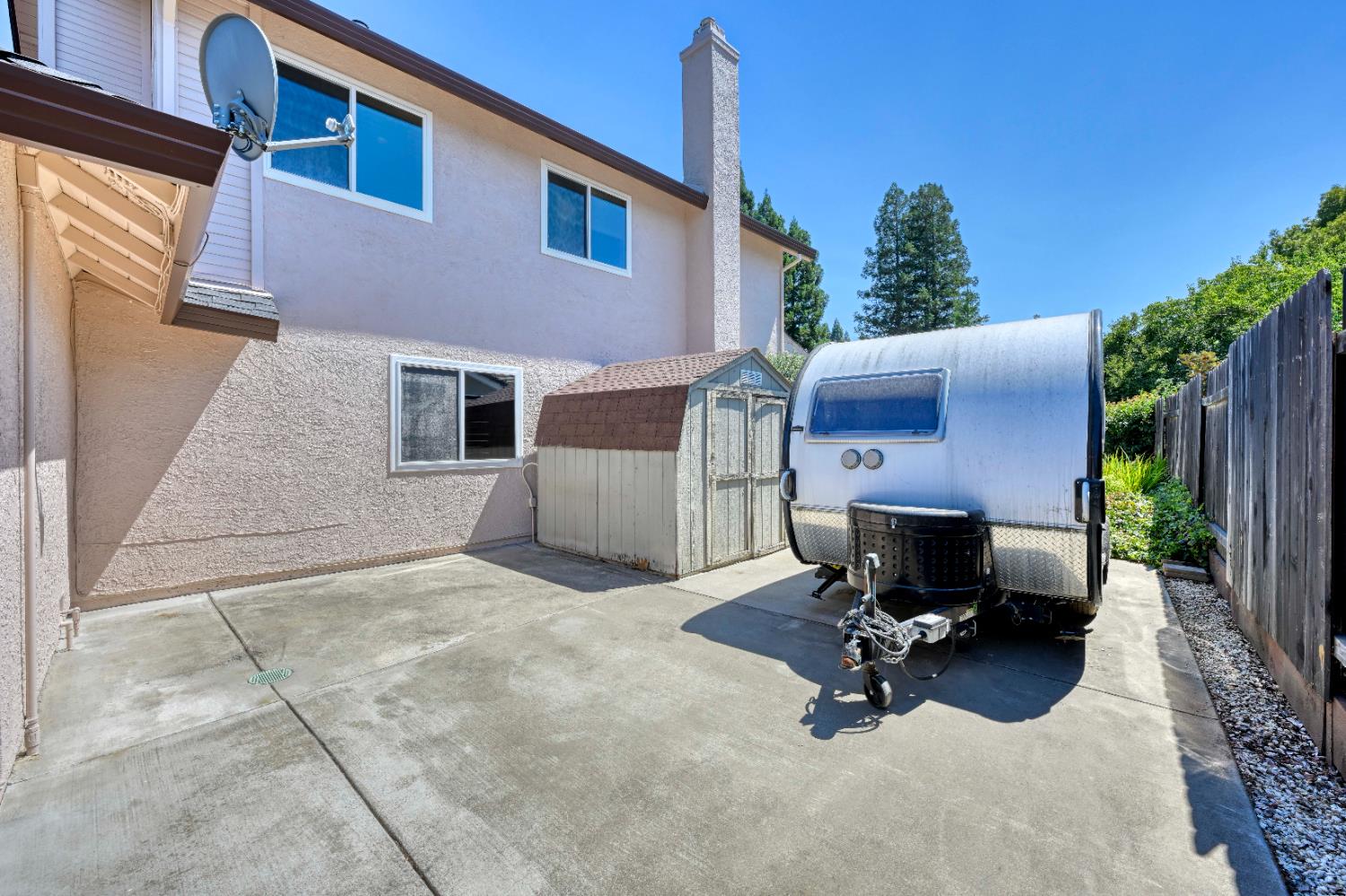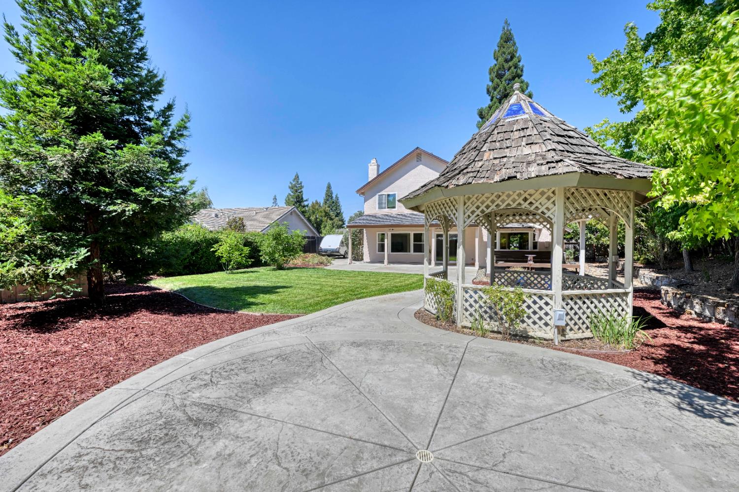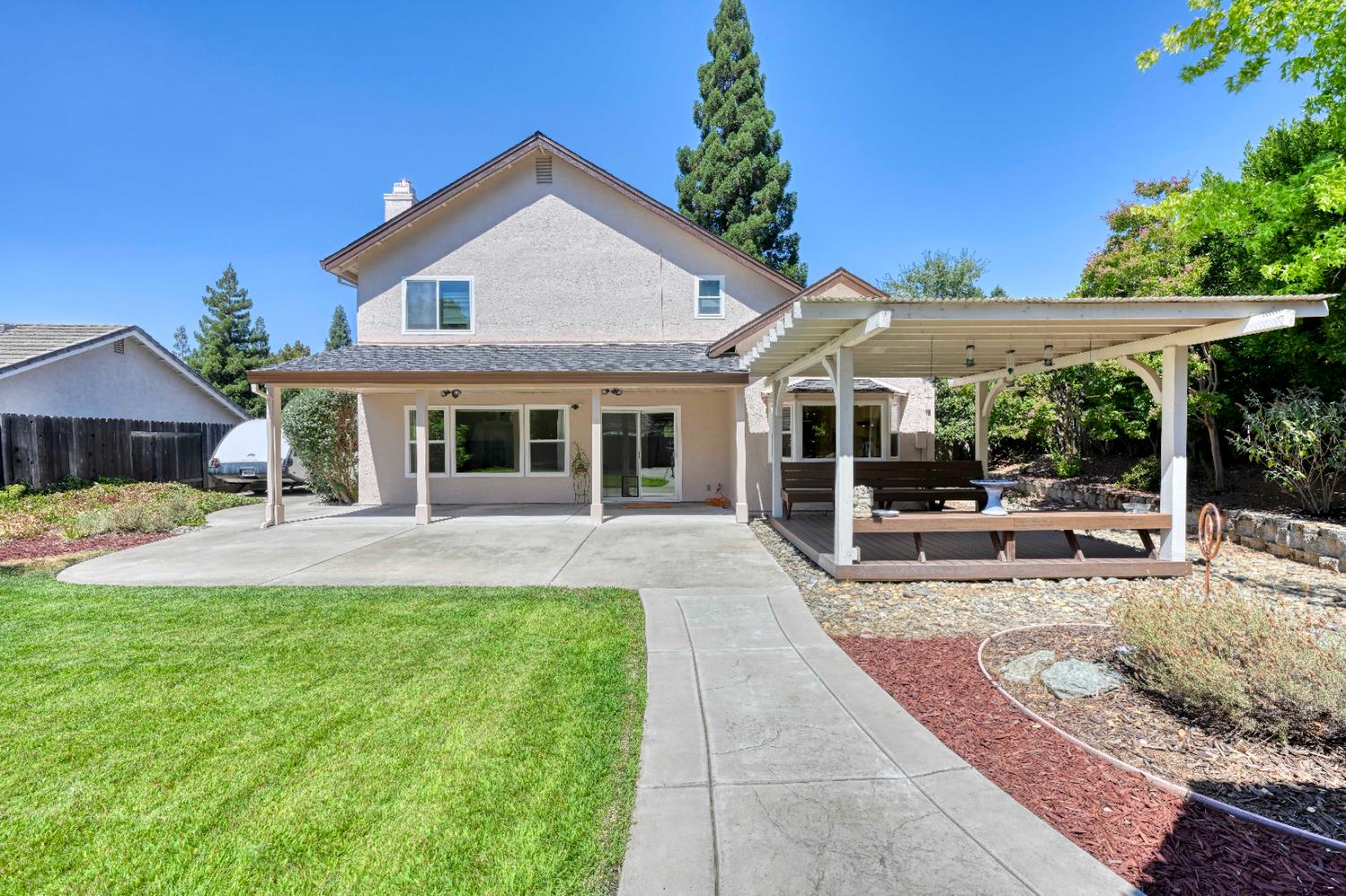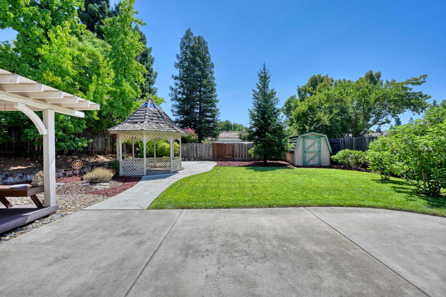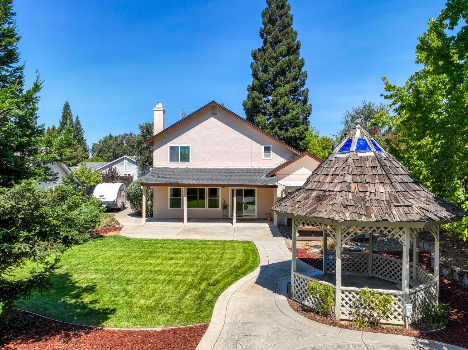 Welcome to Stonegate Village! NO HOA! No Mello-Roos! 2,138 sqft two-story charmer is perfectly located on a redwood tree-lined street The exterior has been freshly painted, Step inside to find a spacious main level with cathedral ceilings, hickory wood flooring, slate and porcelain tile, a cozy family room with fireplace, and windows that fill the home with natural light. Full bedroom & updated bathroom downstairs make a great spot for guests, extended family, or a home office. Kitchen has been gently refreshed, giving buyers the chance to add their own design. Upstairs primary suite has a walk-in closet, updated bath, custom tilework, marble countertop, beautiful custom built modern wood cabinetry, while two additional bedrooms & a full hall bath provide plenty of room for everyone. Outside, the large yard has numerous fruit trees, a covered patio, gazebo, storage shed, and a grassy play area. Bonus: furniture, refrigerator, washer/dryer optional/negotiable with the home! A three-car garage, side access adds even more space for vehicles or hobbies. You can walk to nearby parks, summer concerts, CSD swimming lessons, farmers market,community trails plus all three local schools are ​walking distance. Come see why Stonegate Village is such a sought after neighborhood!