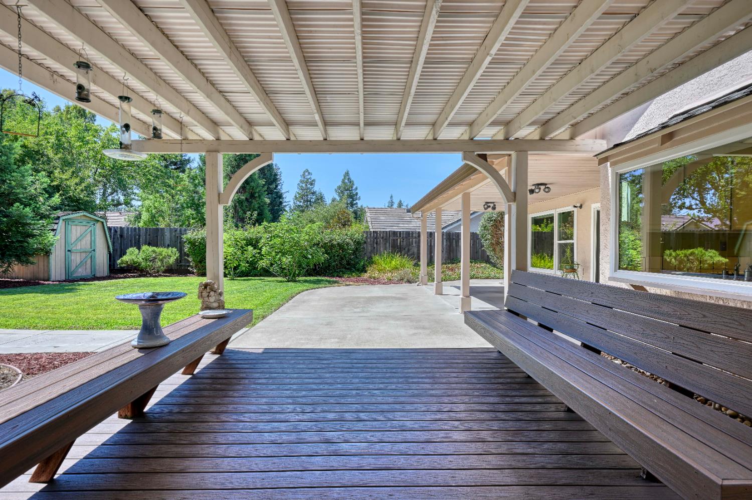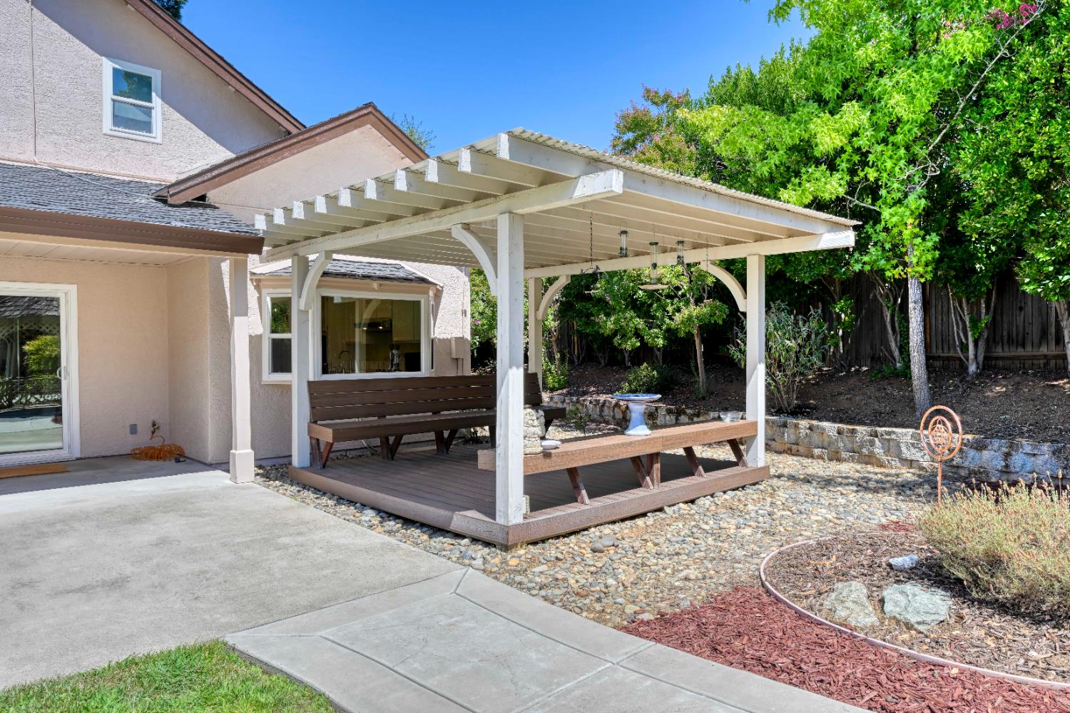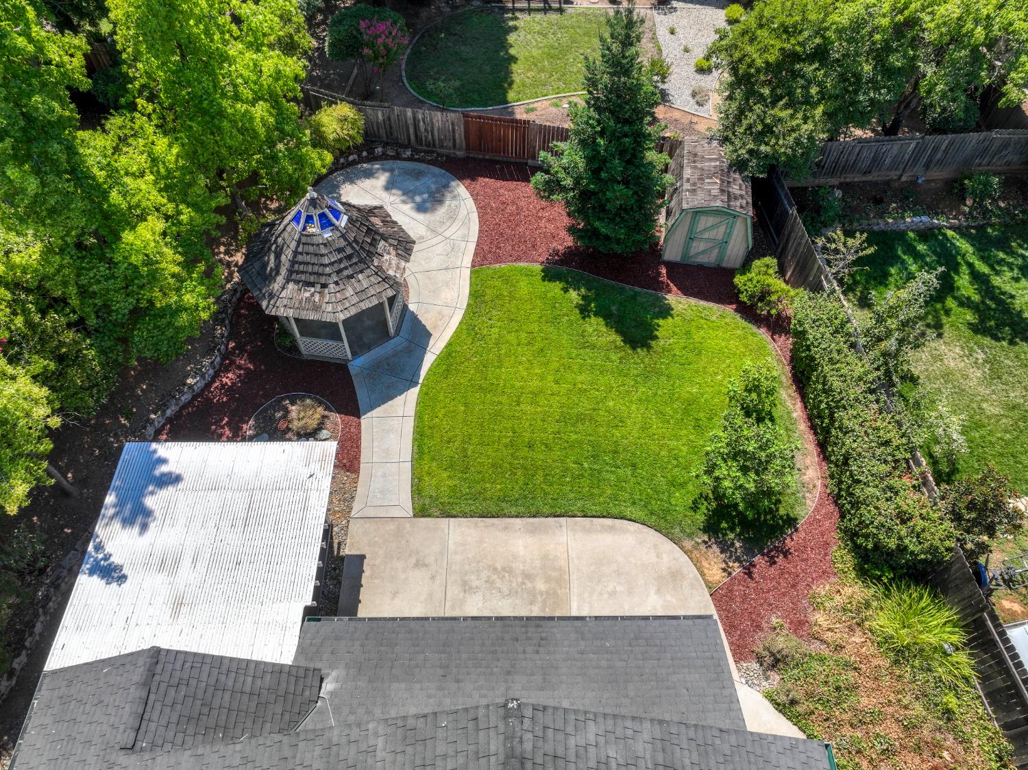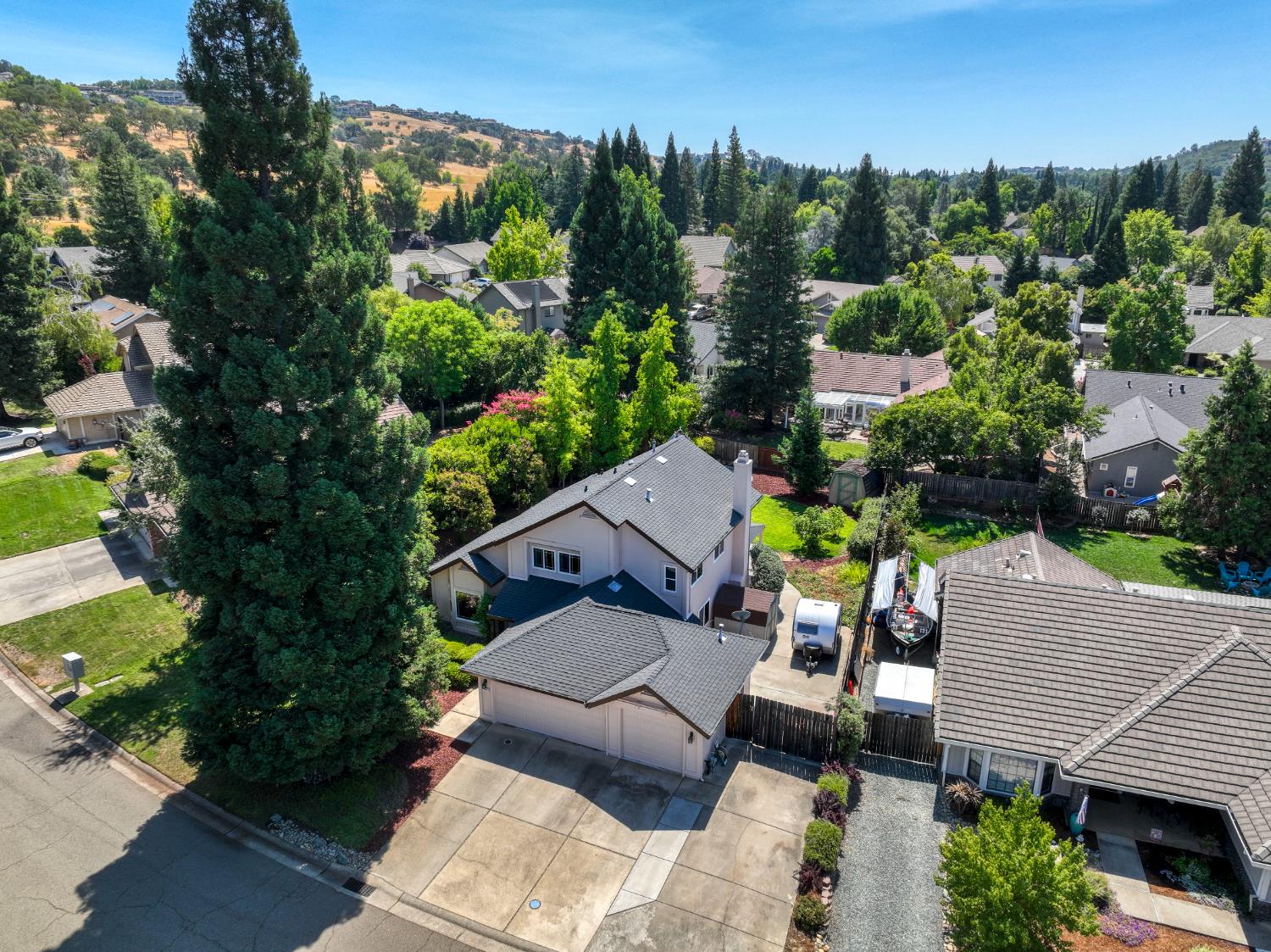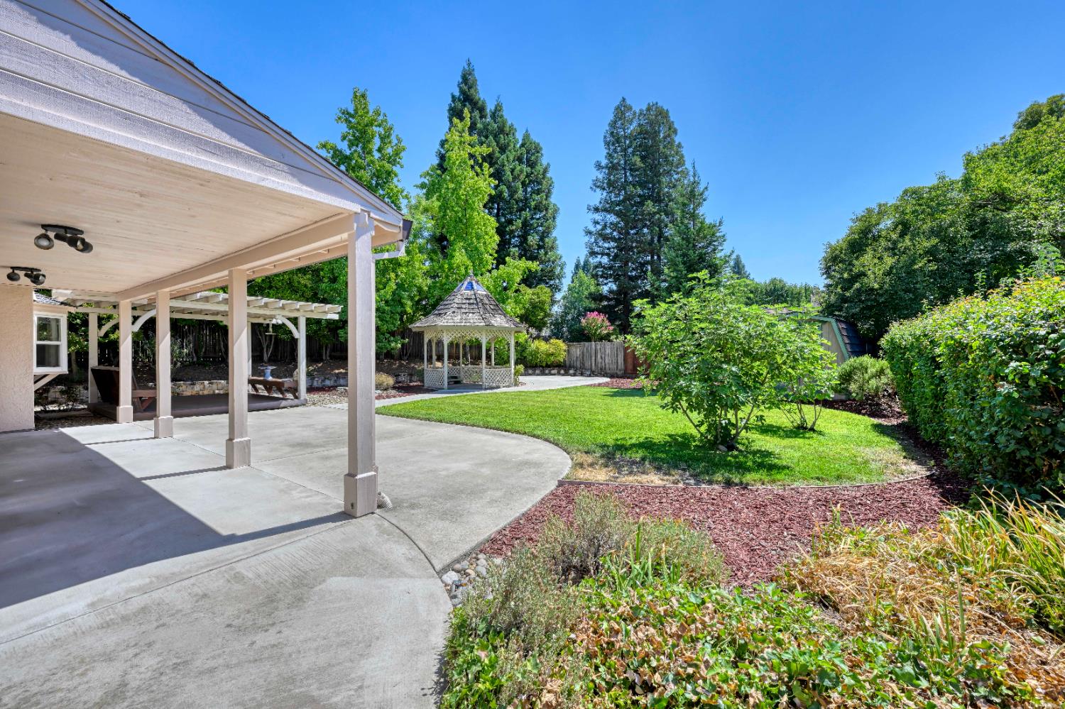 Welcome to Stonegate Village! NO HOA! No Mello-Roos! 2,138 sqft two-story charmer is perfectly located on a redwood tree-lined street The exterior has been freshly painted, Step inside to find a spacious main level with cathedral ceilings, hickory wood flooring, slate and porcelain tile, a cozy family room with fireplace, and windows that fill the home with natural light. Full bedroom & updated bathroom downstairs make a great spot for guests, extended family, or a home office. Kitchen has been gently refreshed, giving buyers the chance to add their own design. Upstairs primary suite has a walk-in closet, updated bath, custom tilework, marble countertop, beautiful custom built modern wood cabinetry, while two additional bedrooms & a full hall bath provide plenty of room for everyone. Outside, the large yard has numerous fruit trees, a covered patio, gazebo, storage shed, and a grassy play area. Bonus: furniture, refrigerator, washer/dryer optional/negotiable with the home! A three-car garage, side access adds even more space for vehicles or hobbies. You can walk to nearby parks, summer concerts, CSD swimming lessons, farmers market,community trails plus all three local schools are ​walking distance. Come see why Stonegate Village is such a sought after neighborhood!