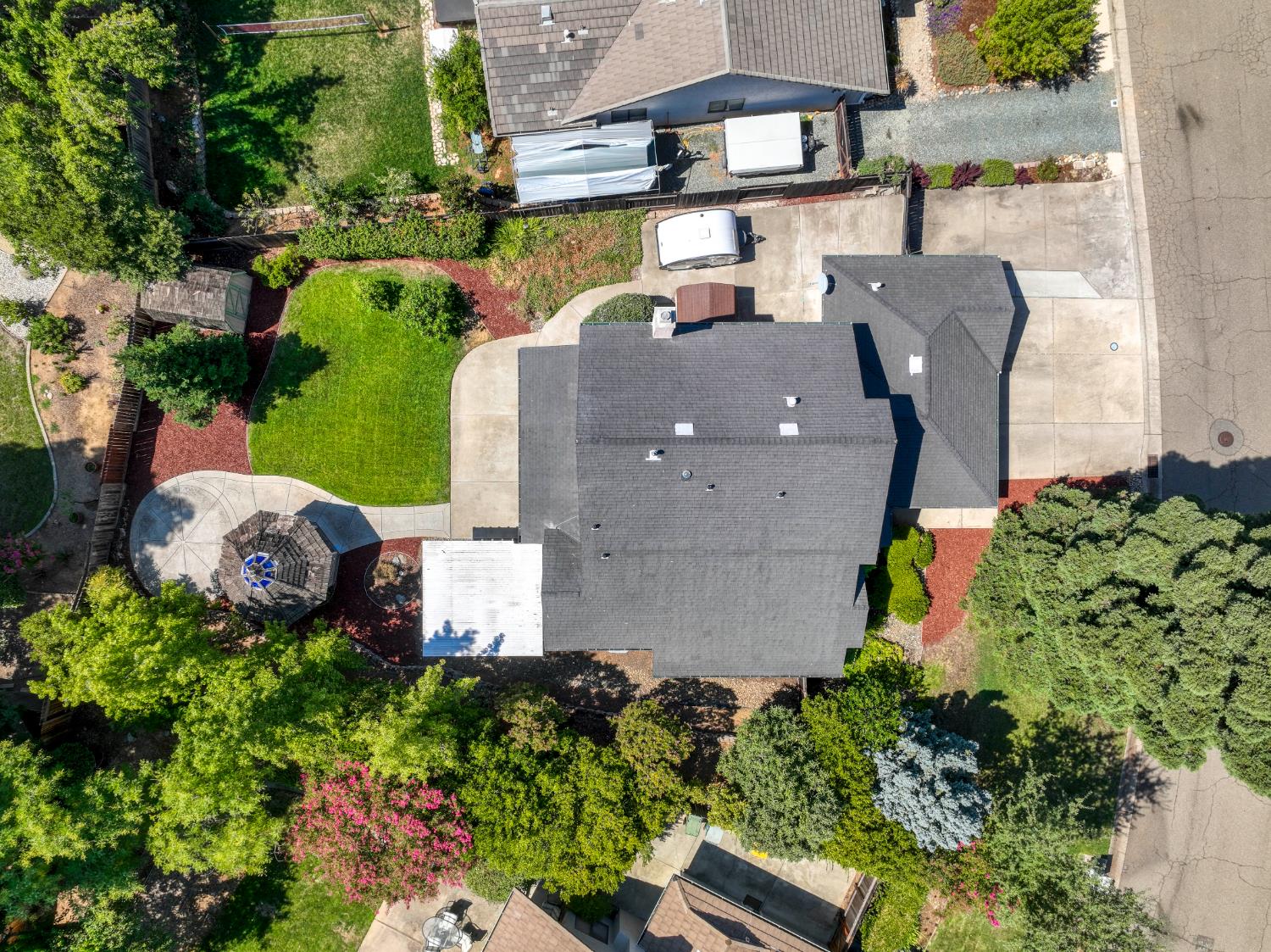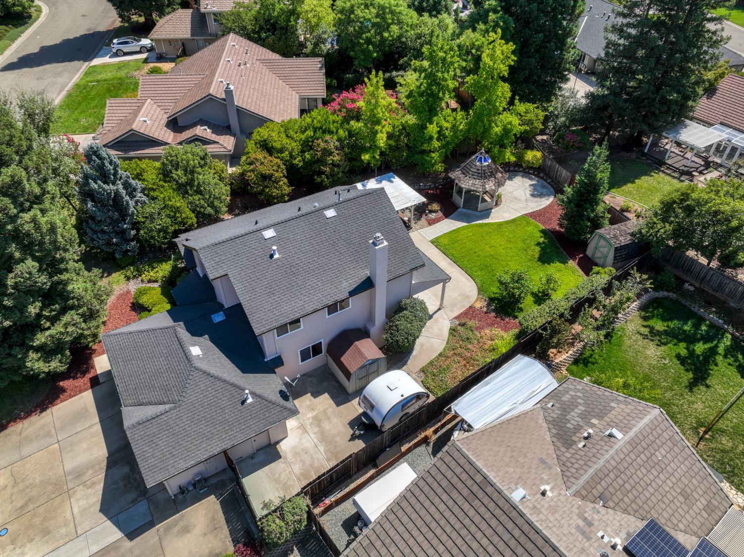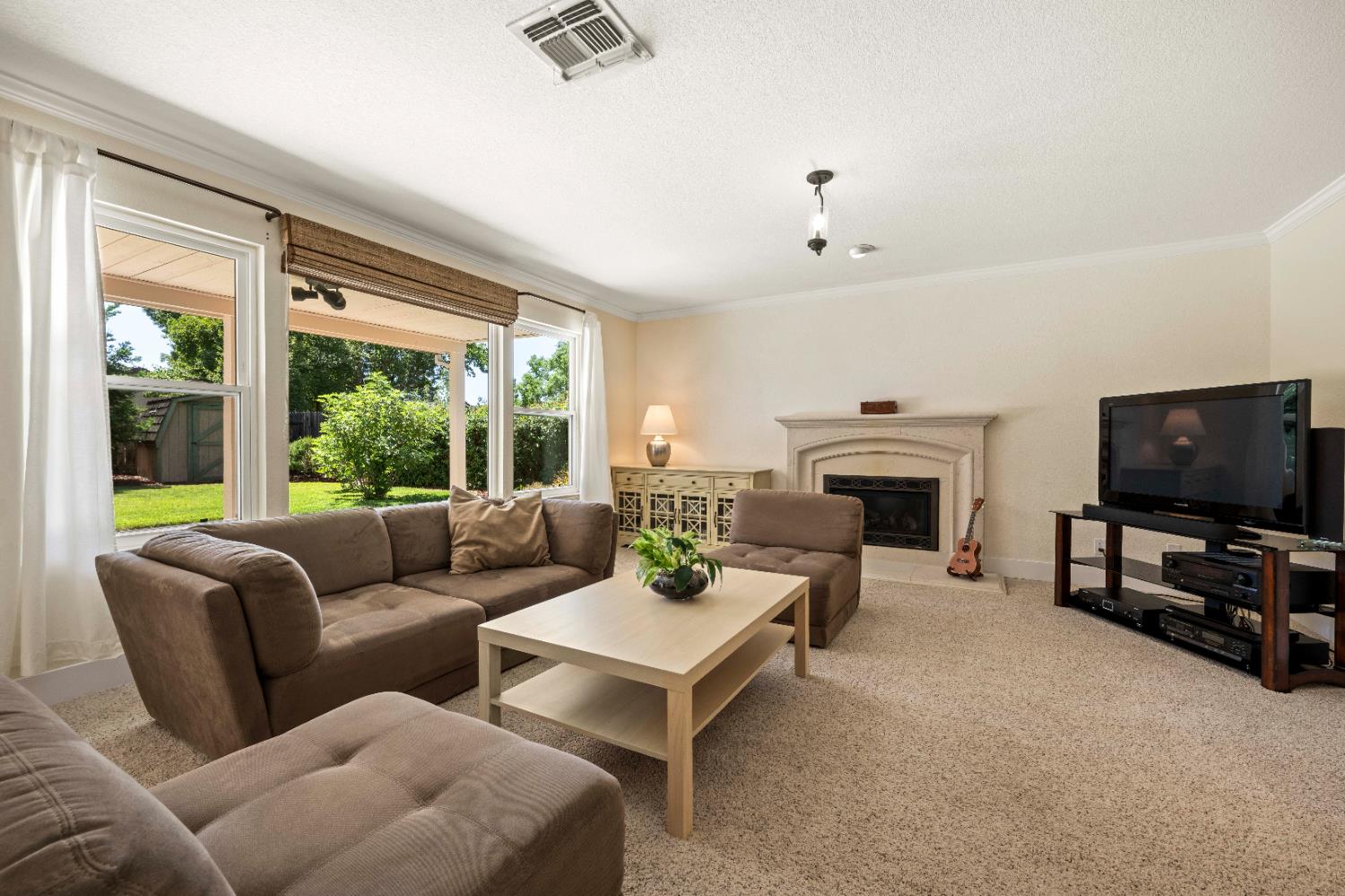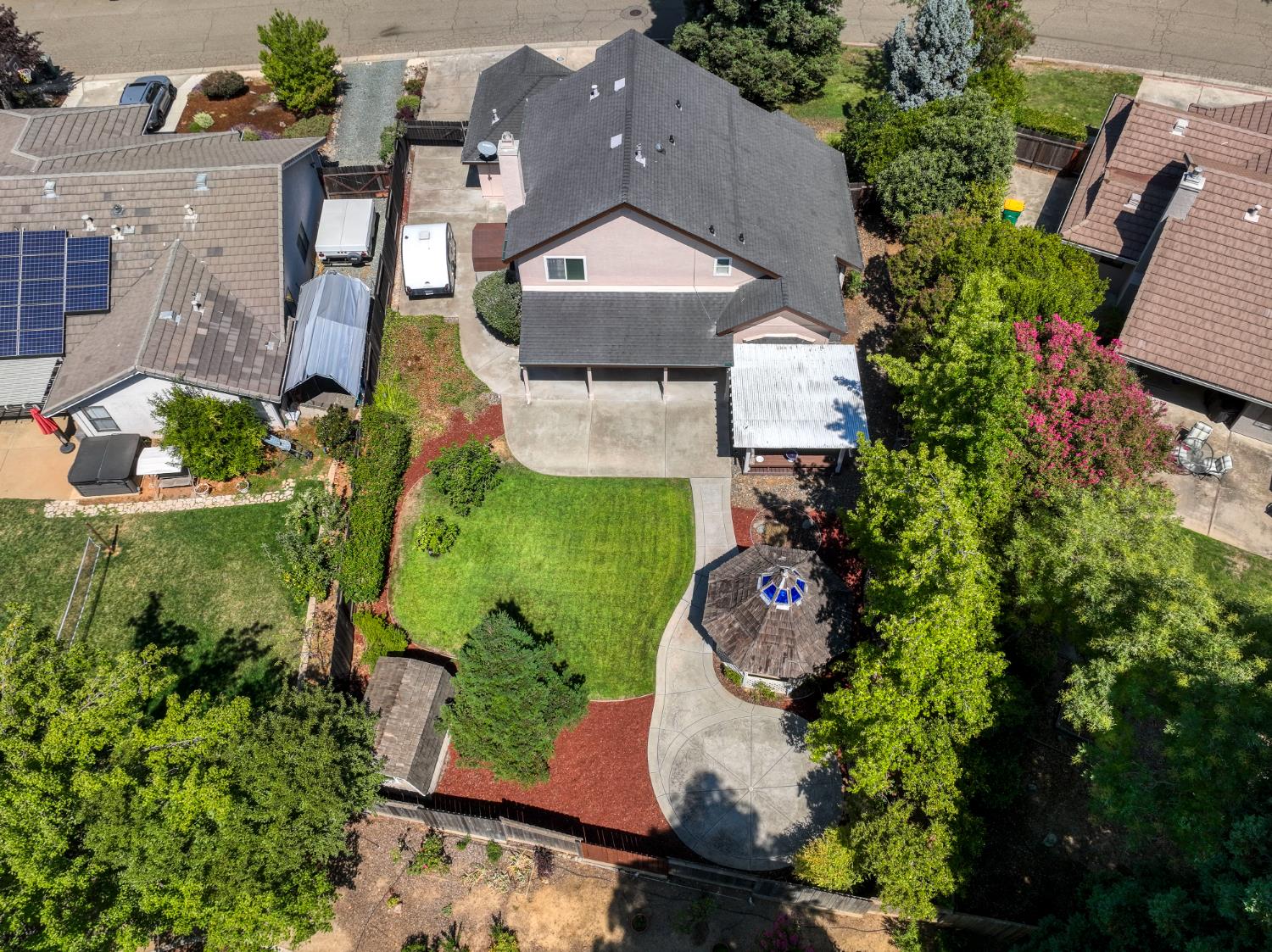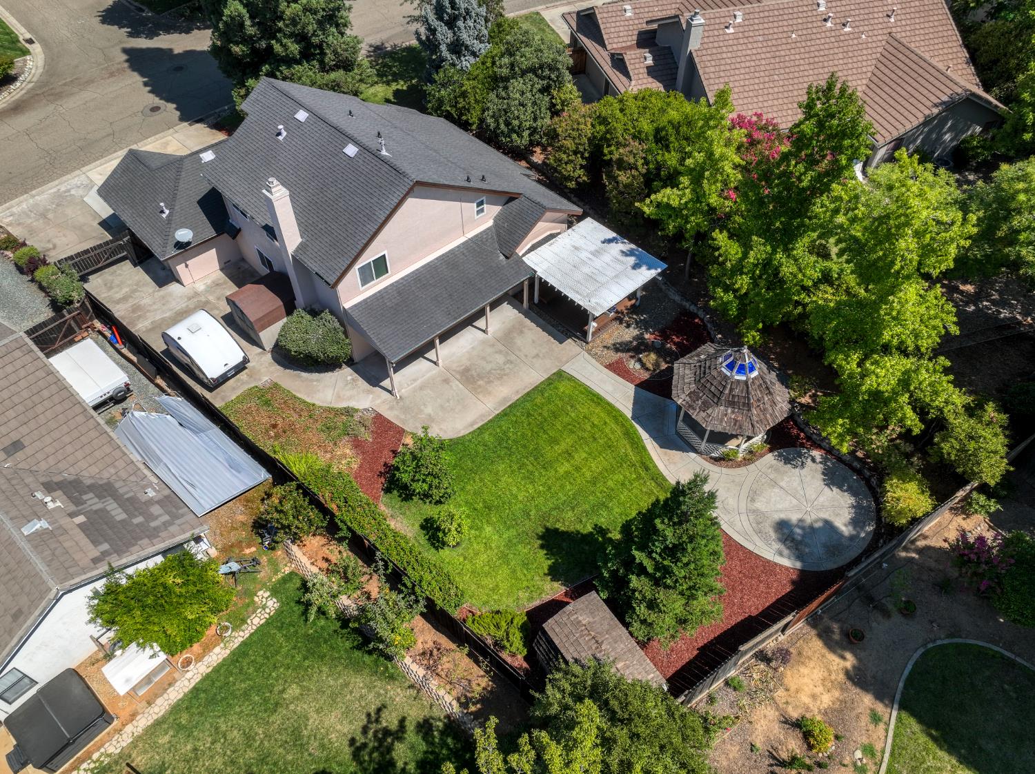 Welcome to Stonegate Village! NO HOA! No Mello-Roos! 2,138 sqft two-story charmer is perfectly located on a redwood tree-lined street The exterior has been freshly painted, Step inside to find a spacious main level with cathedral ceilings, hickory wood flooring, slate and porcelain tile, a cozy family room with fireplace, and windows that fill the home with natural light. Full bedroom & updated bathroom downstairs make a great spot for guests, extended family, or a home office. Kitchen has been gently refreshed, giving buyers the chance to add their own design. Upstairs primary suite has a walk-in closet, updated bath, custom tilework, marble countertop, beautiful custom built modern wood cabinetry, while two additional bedrooms & a full hall bath provide plenty of room for everyone. Outside, the large yard has numerous fruit trees, a covered patio, gazebo, storage shed, and a grassy play area. Bonus: furniture, refrigerator, washer/dryer optional/negotiable with the home! A three-car garage, side access adds even more space for vehicles or hobbies. You can walk to nearby parks, summer concerts, CSD swimming lessons, farmers market,community trails plus all three local schools are ​walking distance. Come see why Stonegate Village is such a sought after neighborhood!