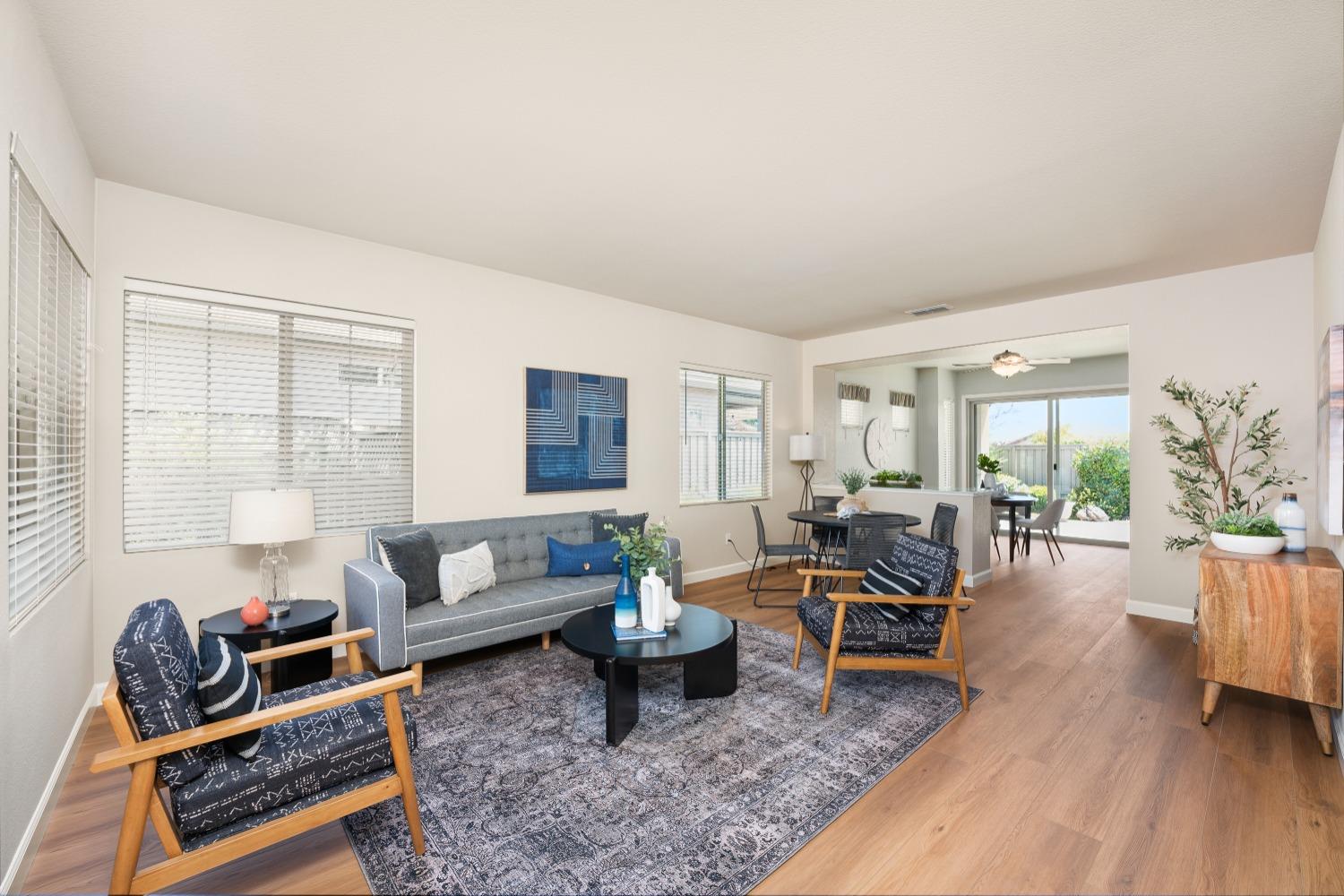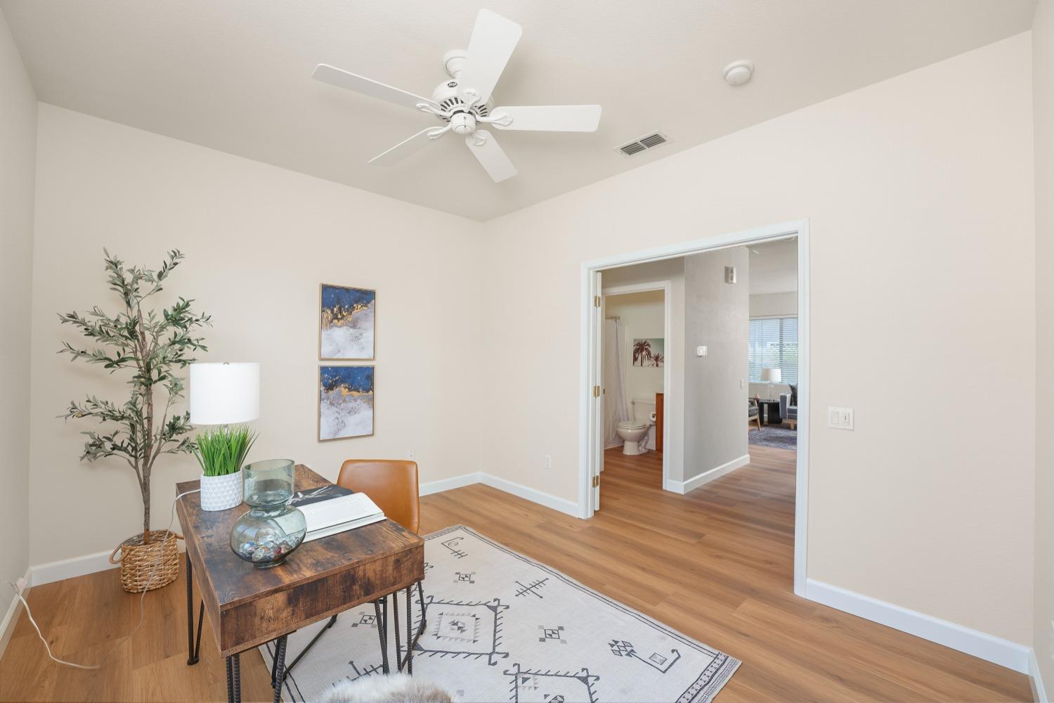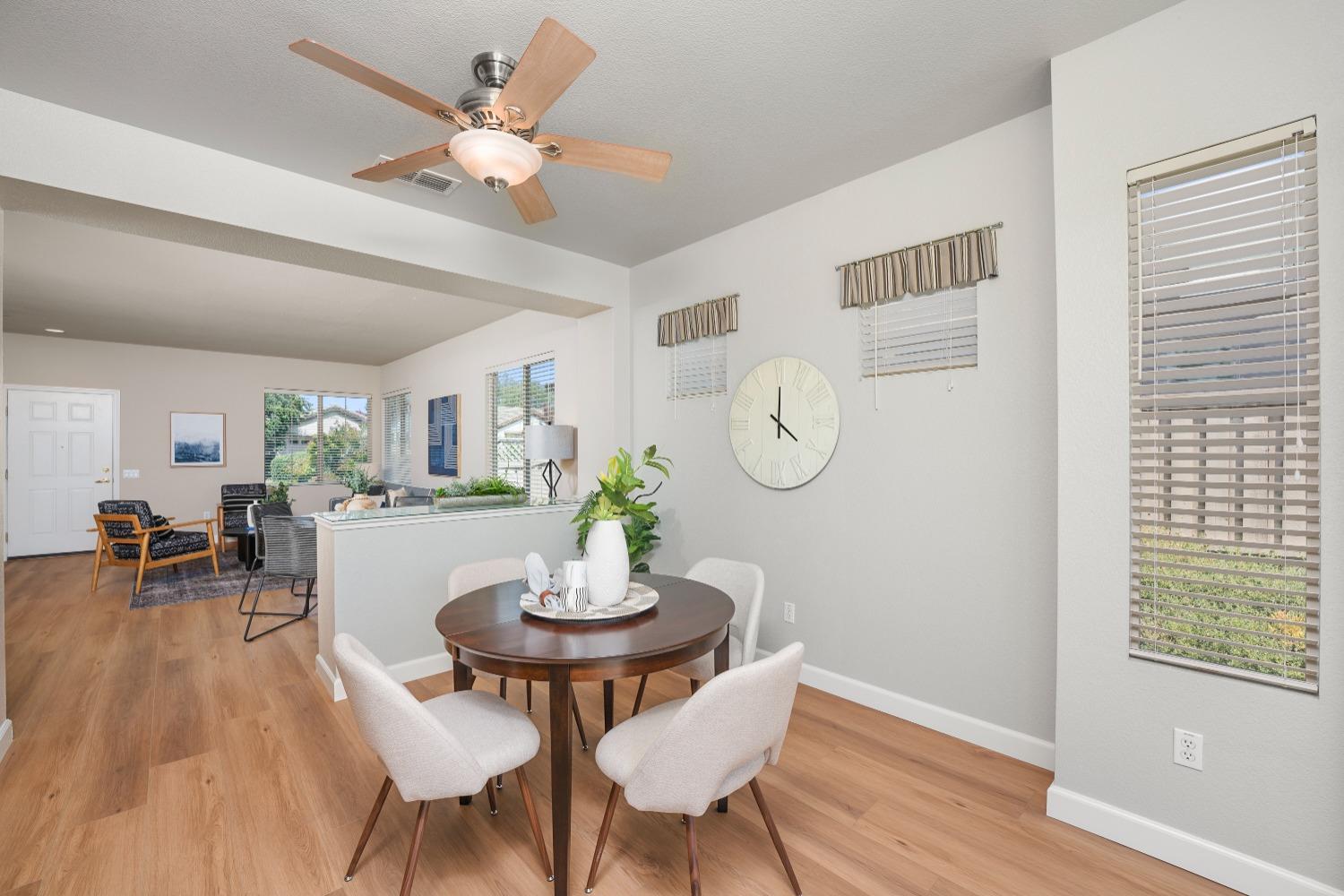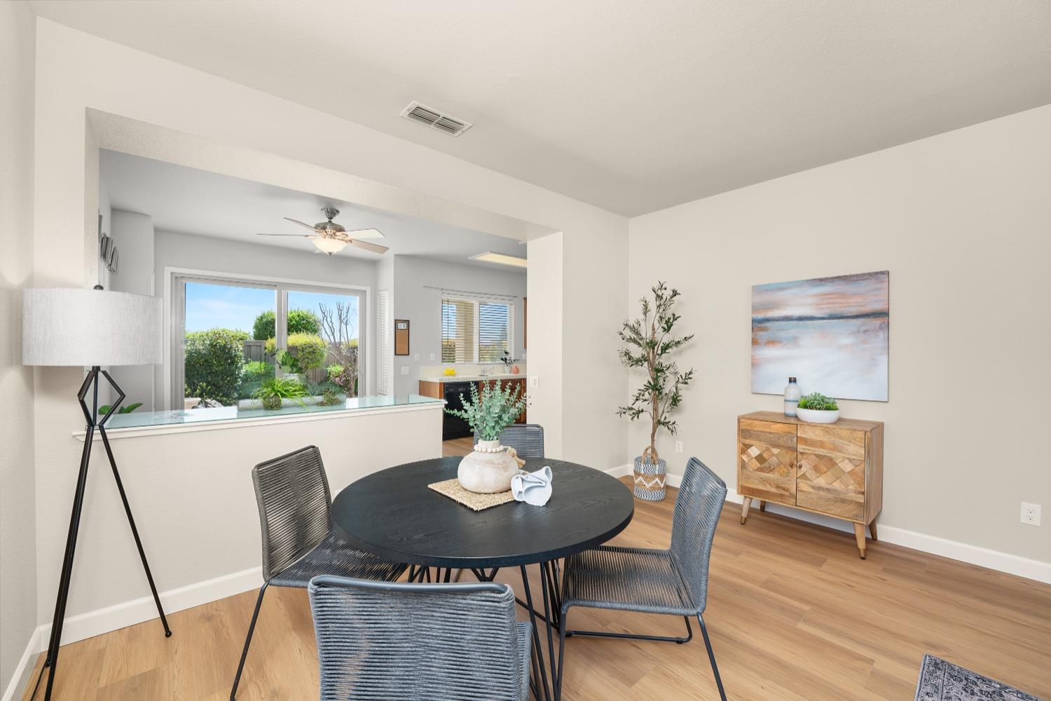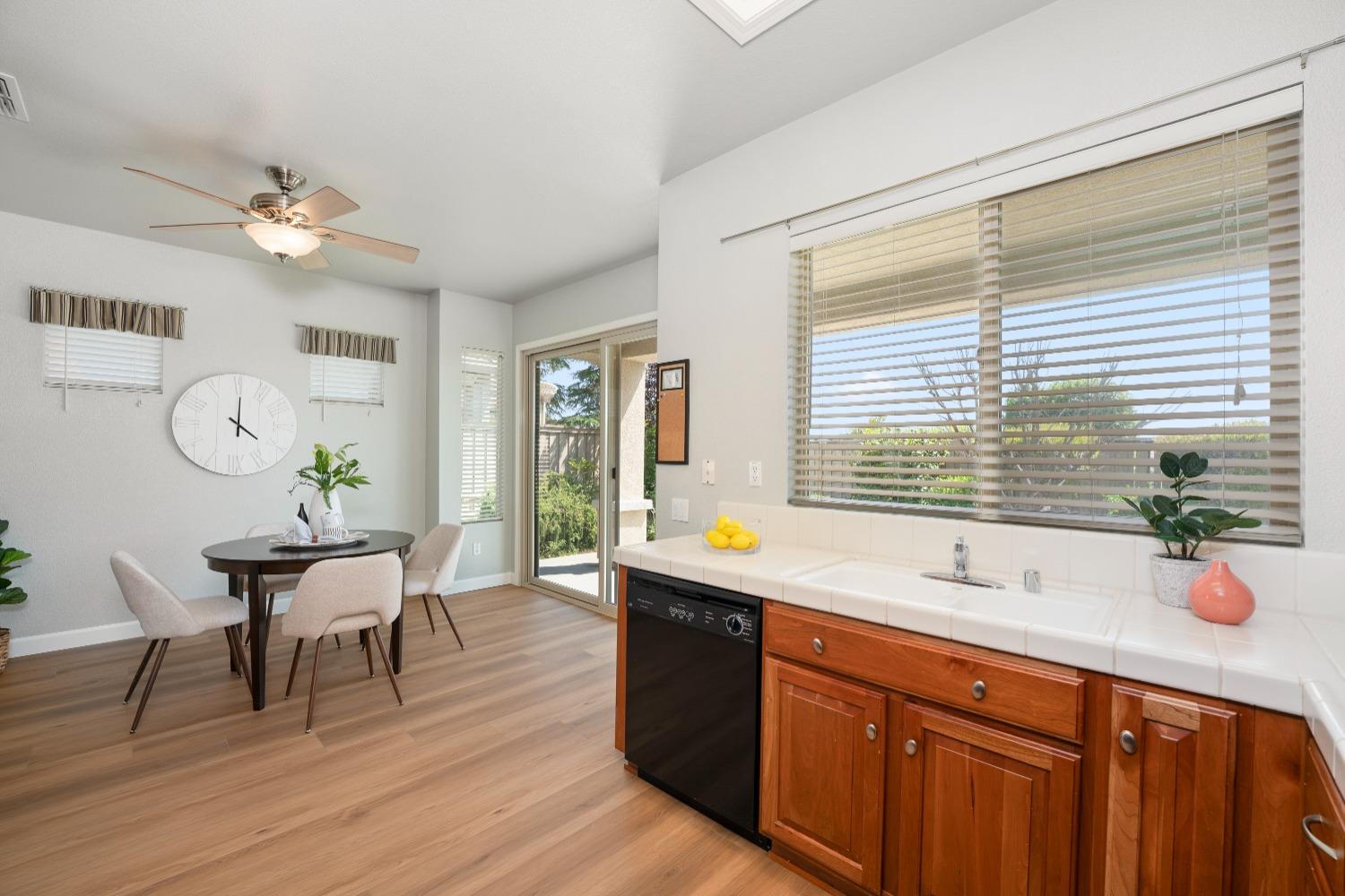 Private, low maintenance, and move in ready! With an interior location, new LVP floors throughout, and fresh interior paint, this high-demand single-level Millpond model makes for the perfect new place to call home. Walk in to an open and inviting living room perfectly sized for gatherings with friends and family or for every day enjoyment. The light and bright kitchen offers a gas cooktop, ample counter space, a charming eat-in breakfast nook, and a garden view window looking out to the serene backyard. At the back of the home, you'll find a sizable primary suite with a large walk-in closet, sitting area, and views of the backyard landscape. The primary bath provides a step in shower with seat and grab bar, plus a suitable vanity with great counter space and storage. Down the hall lies the den, or second bedroom, with double doors and easy access to the second full bath with shower over tub. Step through the back slider to your covered patio. Use the citrus tree to add a fresh taste to your meals, and put your touches on the landscaping to make it come alive. You'll also enjoy an attached 2 car garage with laundry and additional storage. Come experience the active adult 55+ lifestyle featuring two golf courses, pickleball, tennis, bocce, swimming pools, clubhouse and more!