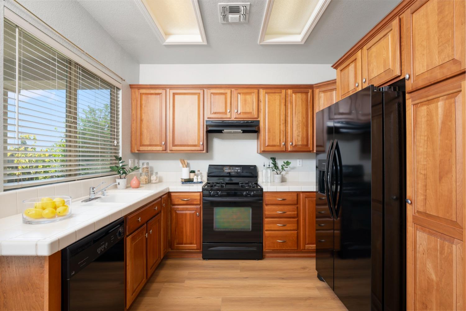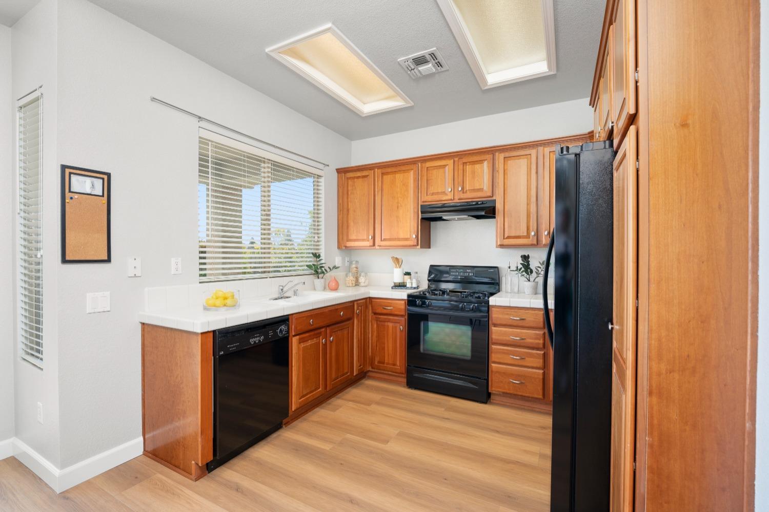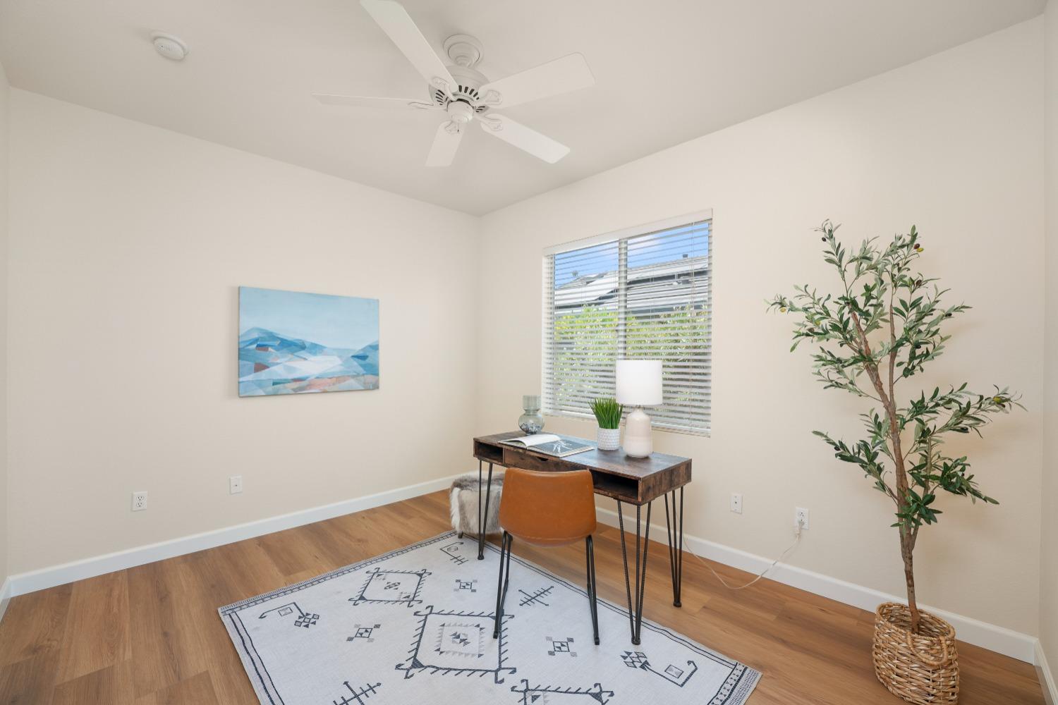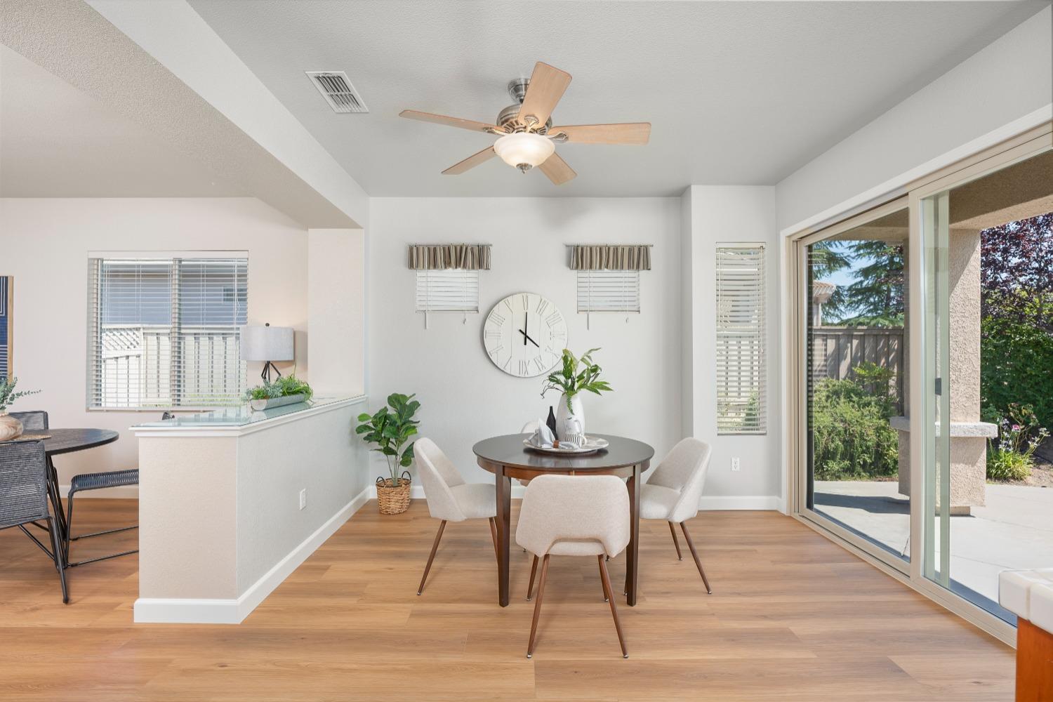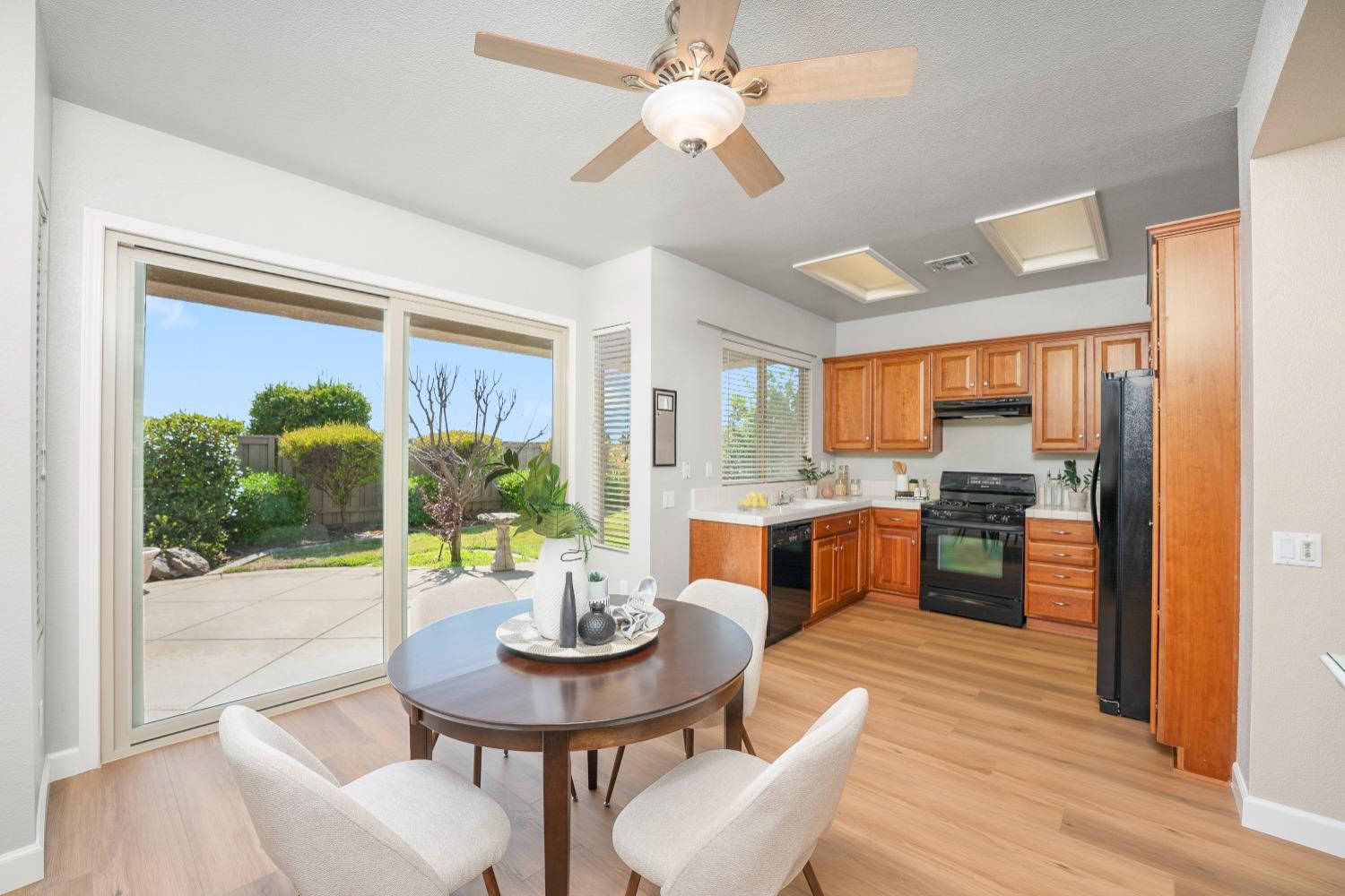 Private, low maintenance, and move in ready! With an interior location, new LVP floors throughout, and fresh interior paint, this high-demand single-level Millpond model makes for the perfect new place to call home. Walk in to an open and inviting living room perfectly sized for gatherings with friends and family or for every day enjoyment. The light and bright kitchen offers a gas cooktop, ample counter space, a charming eat-in breakfast nook, and a garden view window looking out to the serene backyard. At the back of the home, you'll find a sizable primary suite with a large walk-in closet, sitting area, and views of the backyard landscape. The primary bath provides a step in shower with seat and grab bar, plus a suitable vanity with great counter space and storage. Down the hall lies the den, or second bedroom, with double doors and easy access to the second full bath with shower over tub. Step through the back slider to your covered patio. Use the citrus tree to add a fresh taste to your meals, and put your touches on the landscaping to make it come alive. You'll also enjoy an attached 2 car garage with laundry and additional storage. Come experience the active adult 55+ lifestyle featuring two golf courses, pickleball, tennis, bocce, swimming pools, clubhouse and more!
