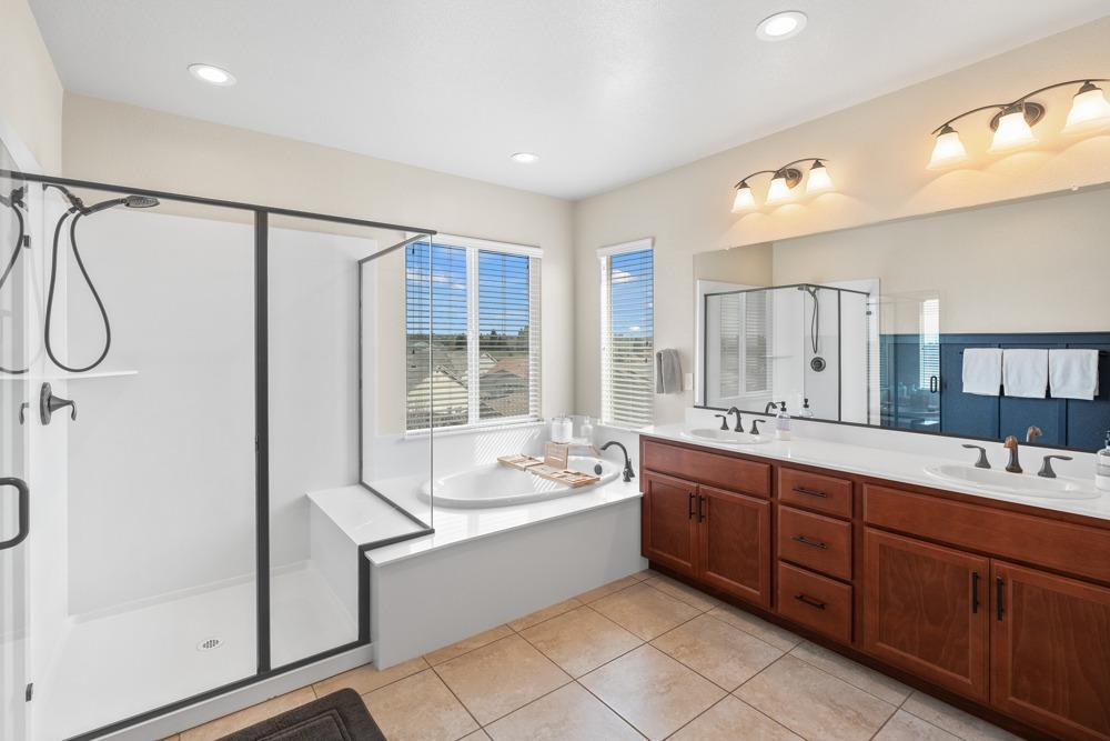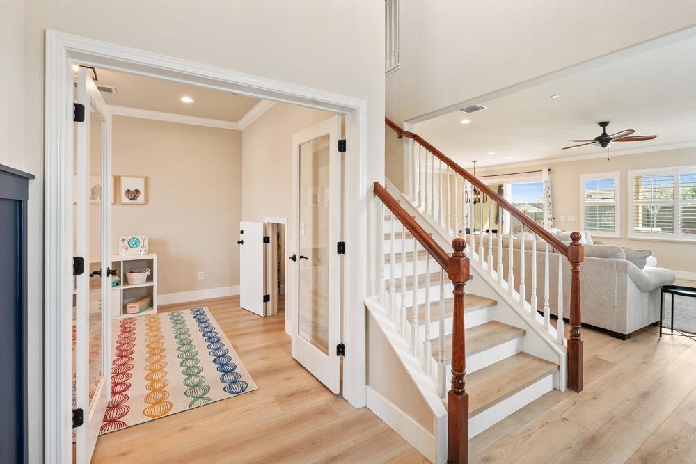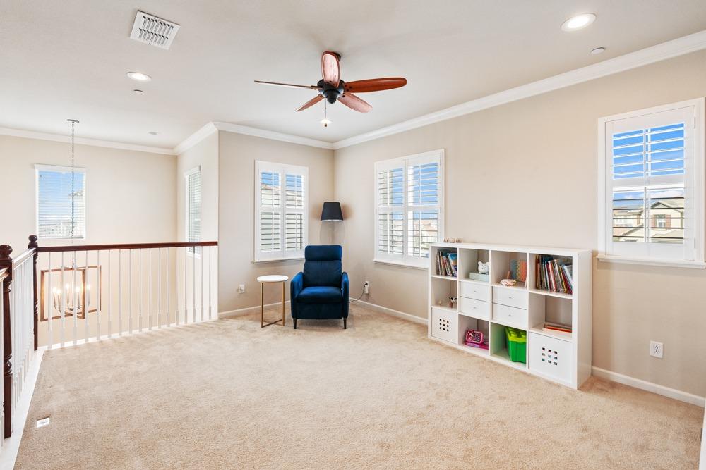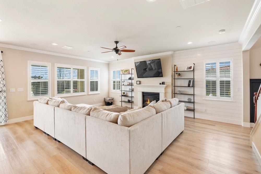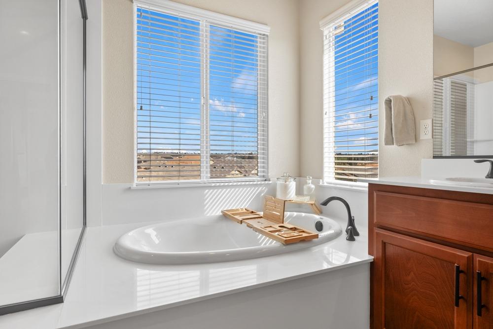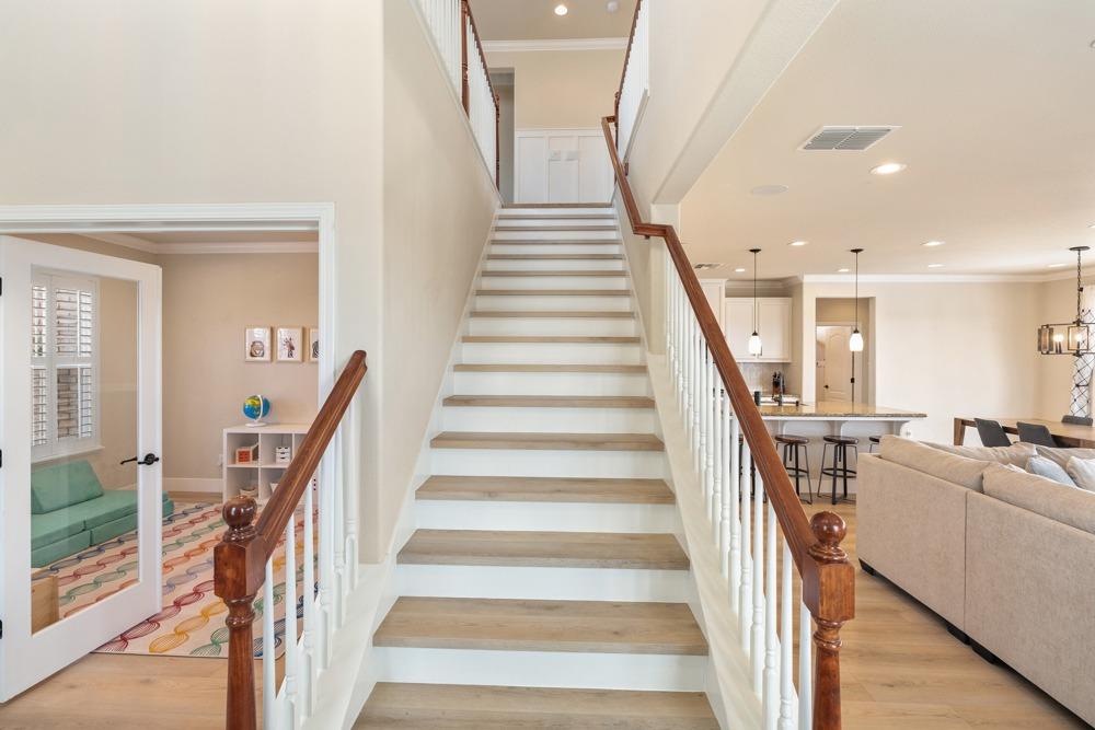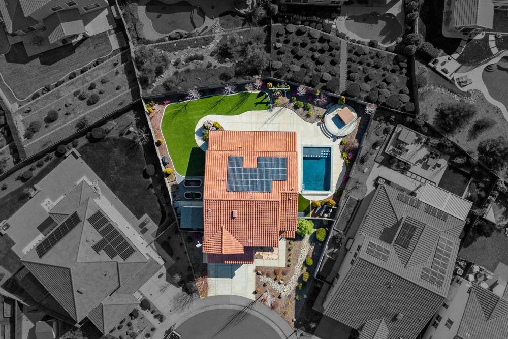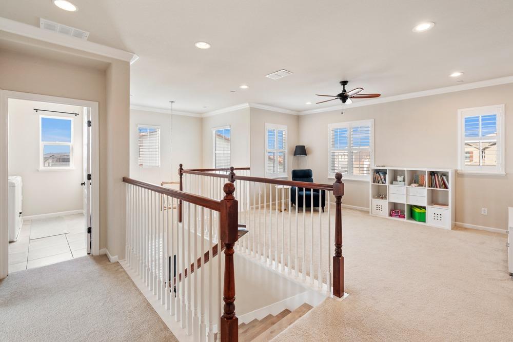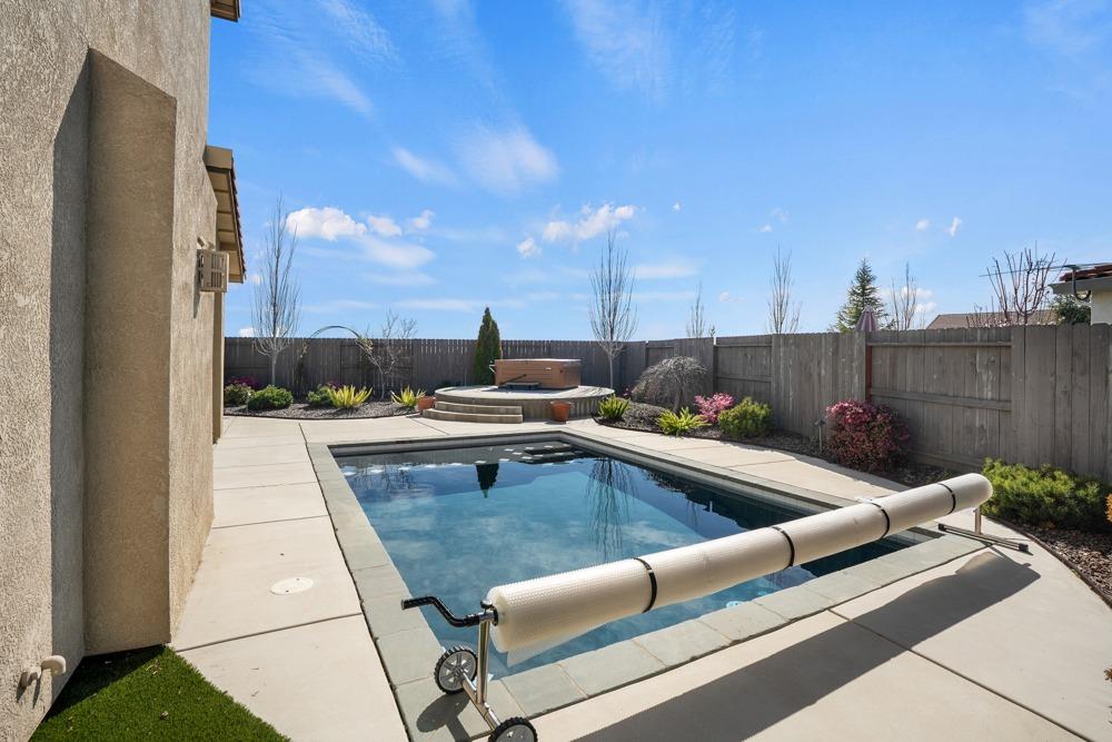 This Whitney Ranch beauty checks all the boxes! From the airy foyer full of natural light, enter the expansive open-plan living/dining/kitchen area, perfect for entertaining friends or quiet family time. On the same level, a room with glass doors makes for an excellent home office or meditation space. An open loft anchors the upstairs level, flanked by the bedrooms. The oversized primary suite overlooks the beautiful resort-like backyard. The laundry is conveniently upstairs as well. Finishes throughout are high-end, including top-of-the-line plantation shutters, luxury vinyl plank flooring, updated bathrooms with stylish tile and stunning crown molding. Outside you will enjoy your own private paradise, with a large covered porch, contemporary swimming pool, spa and raised garden beds. There's a three-car tandem garage equipped with an EV charger, plus owned solar. All this on a serene cul-de-sac in a desirable corner of Rocklin.