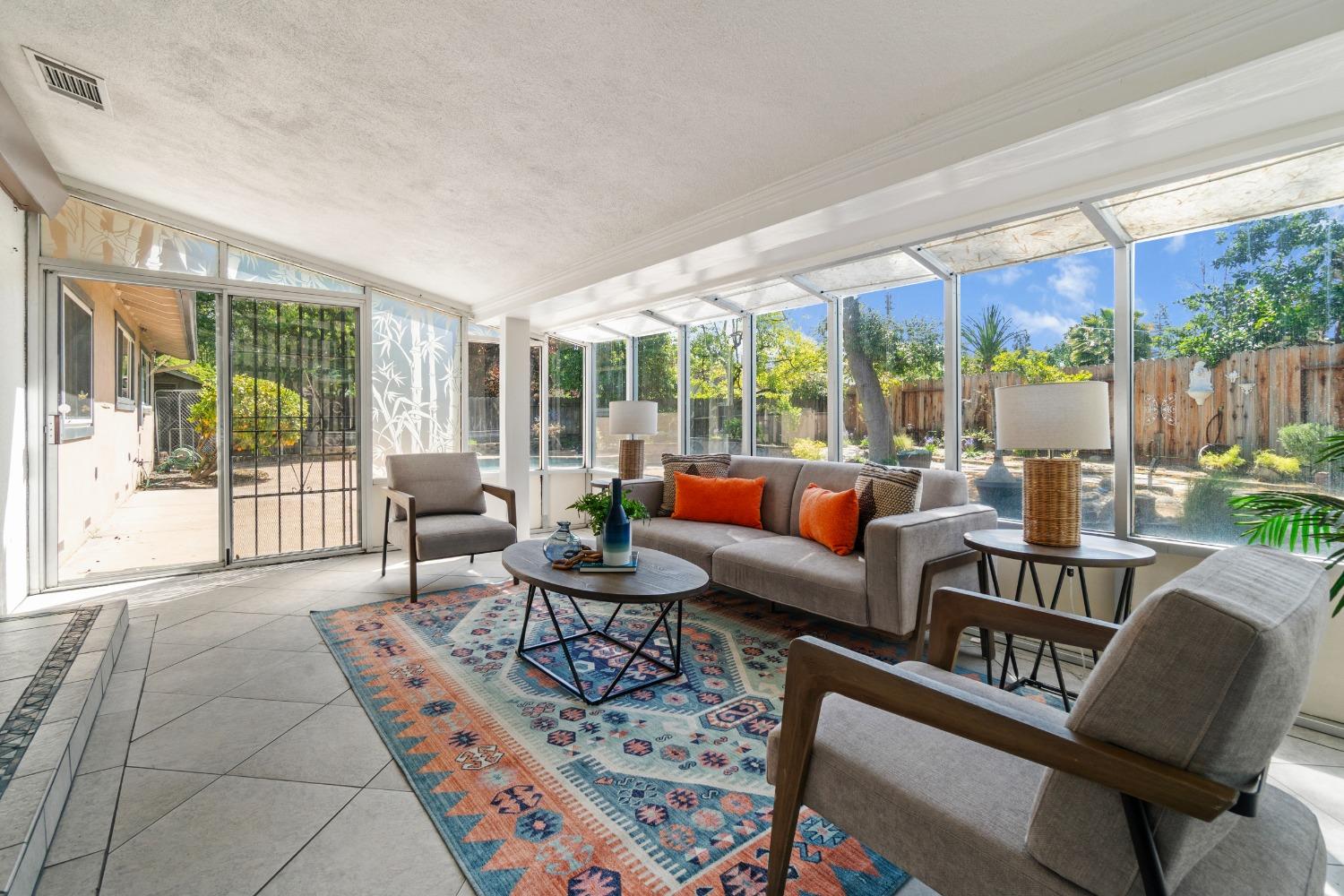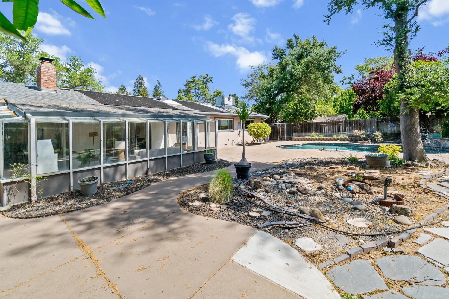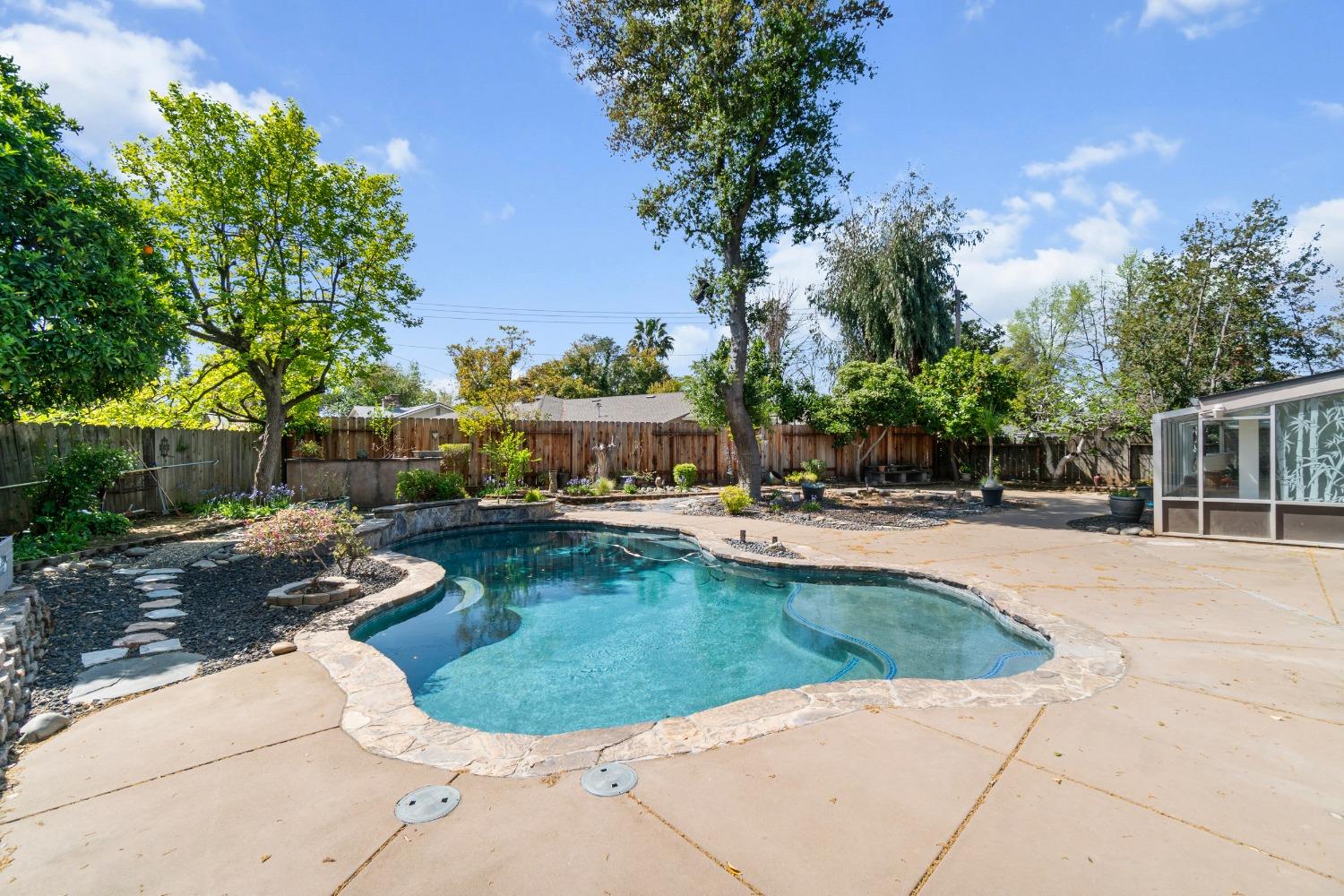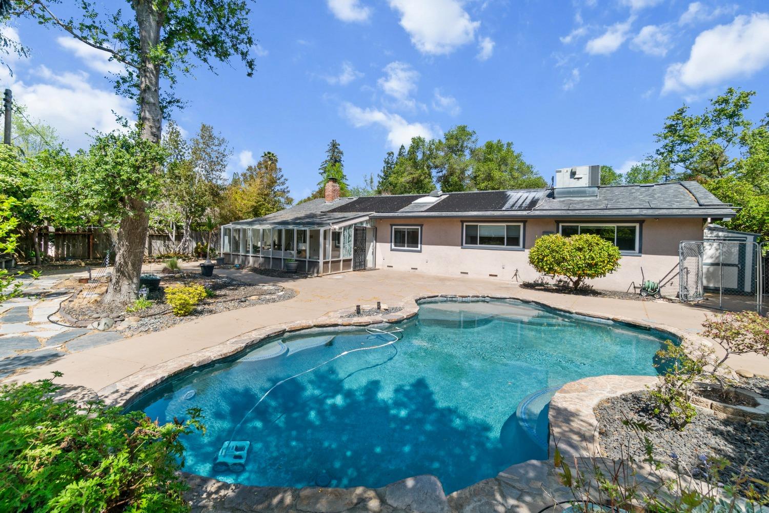 Nestled in a quiet Carmichael neighborhood, this charming ranch style home is the perfect place to call home and kick off your summer. A glistening pool awaits canon balls and floaties with umbrella drinks, while the oversized side yard provides enough space to store all your recreational toys. The private and low maintenance quarter acre lot allows you to lock up and hit the road without worrying about the yard. As you enter the home, the spacious living room and inviting sunroom will draw you in, making you want to kick off your shoes and stay a while. The kitchen is a cooking enthusiast's delight, featuring high-end stainless steel appliances. The primary suite provides a calming view through a beautiful wood-framed window, and offers a custom remodeled ensuite bath. The fully remodeled hall bath is perfect for guests or little ones with a shower over tub. Interior laundry area leads to a third full bath and the attached 2-car garage. Other notable features include newer pool equipment, central A/C, laminate floors, indoor office/flex space off the dining area, sleek electric fireplace insert, fruit trees and more! Perfectly situated near parks, shopping and downtown attractions, this home is an unbeatable combination of tranquility and accessibility. Come make this one yours!