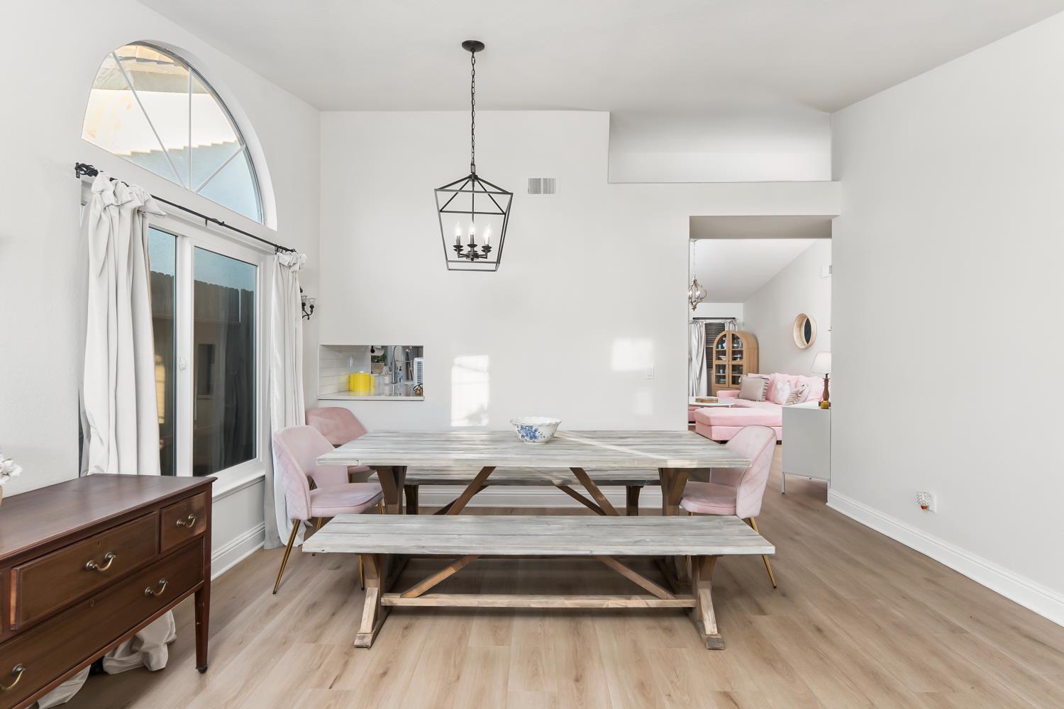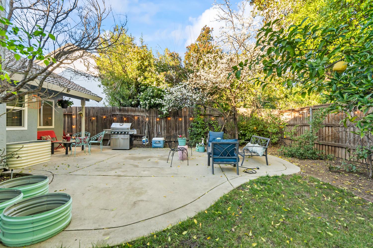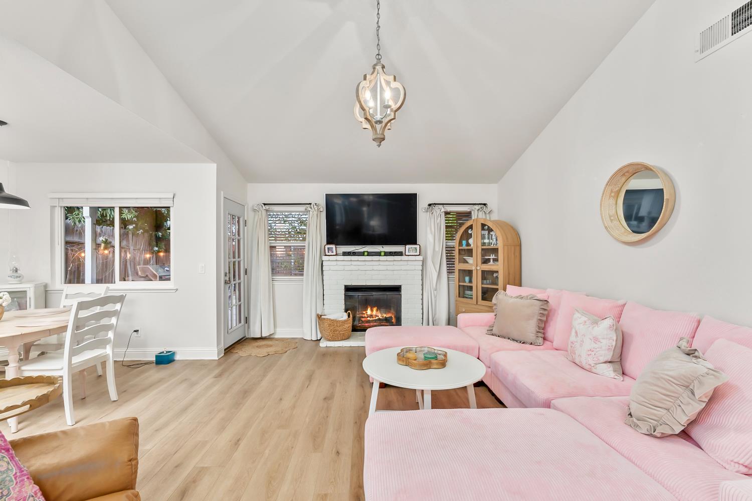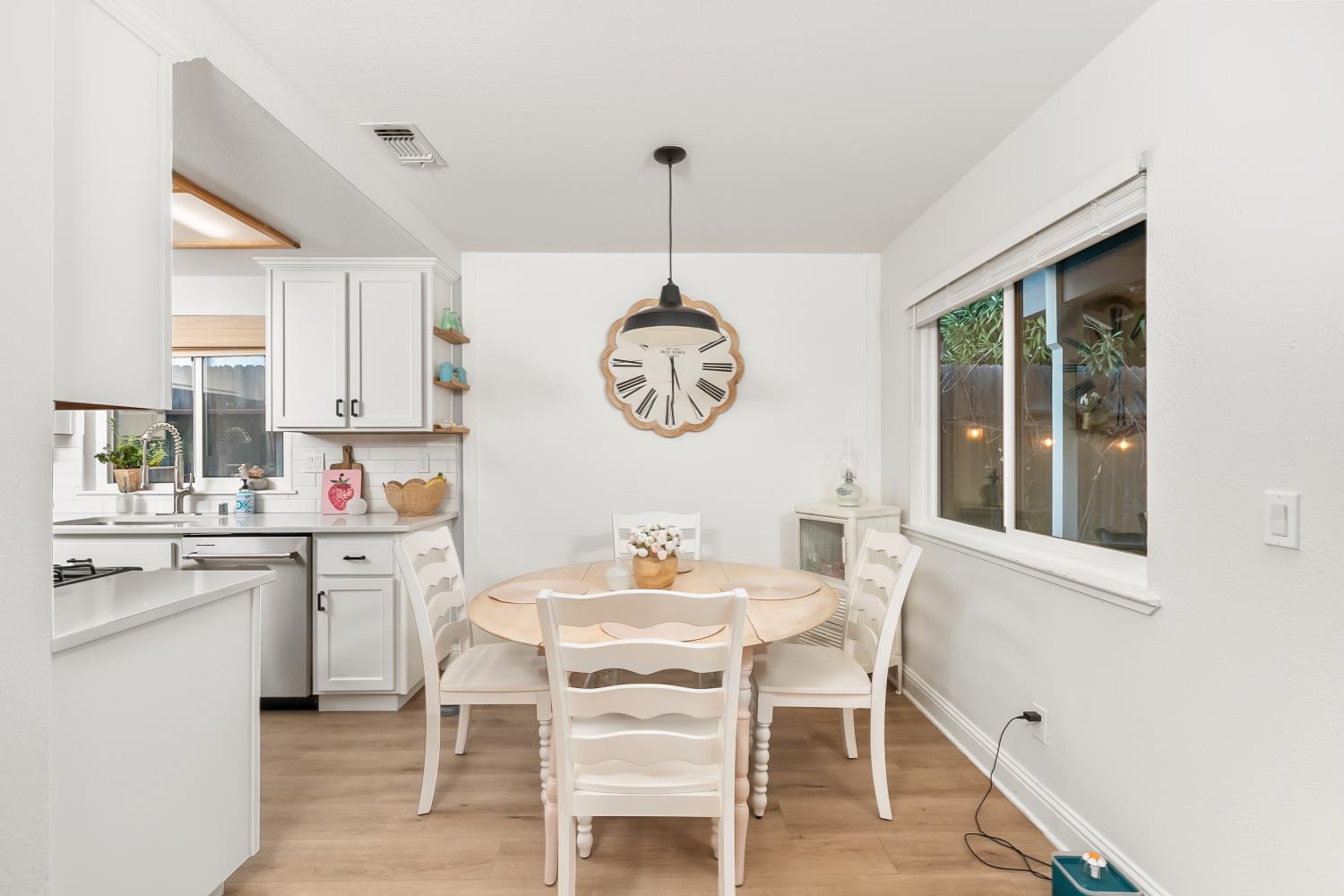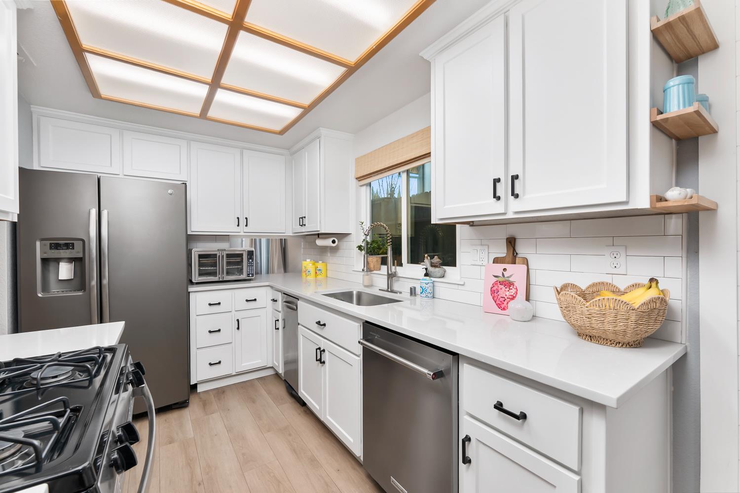 Beautiful curb appeal and manicured landscaping welcome you to this thoughtfully updated 4-bedroom, 2-bath home in the heart of Rocklin. A charming walkway leads to the inviting front entry, setting the tone for what's inside. Step into a light-filled open-concept layout featuring vaulted ceilings, expansive windows and gorgeous luxury plank flooring throughout. The formal living and dining areas feel bright and airy, enhanced by stylish modern light fixtures and abundant natural light. A large sliding glass door and statement arched window create a seamless connection to the backyard. The updated kitchen is both functional and elegant, offering refaced white cabinetry, sleek quartz countertops, stainless steel sink & faucet, dishwasher and fridge. This kitchen features gas range, built in microwave and the recessed panel cabinet doors with updated hardware and a beautifully illuminated ceiling light that adds warmth and character. The adjacent breakfast nook is the perfect spot to enjoy morning coffee with views of the private backyard. The inviting family room centers around a substantial brick fireplace, creating a cozy gathering space ideal for relaxing or entertaining. The spacious primary suite includes a walk-in closet and a private en suite bathroom with updated sink hardware and mirrors. Fresh interior paint throughout makes the home truly move-in ready. Step outside to a lush and private backyard retreat with mature landscaping and multiple fruit trees including plum, lemon, orange, pomelo, and apple perfect for gardeners and entertainers alike. Additional highlights include an indoor laundry room with washer and dryer included, a 2-car garage with a new garage door and a prime location zoned for Rocklin's top-rated schools and within walking distance to shopping and dining.This beautifully maintained home offers comfort, style, and an unbeatable central Rocklin location don't miss your opportunity to make it yours!
