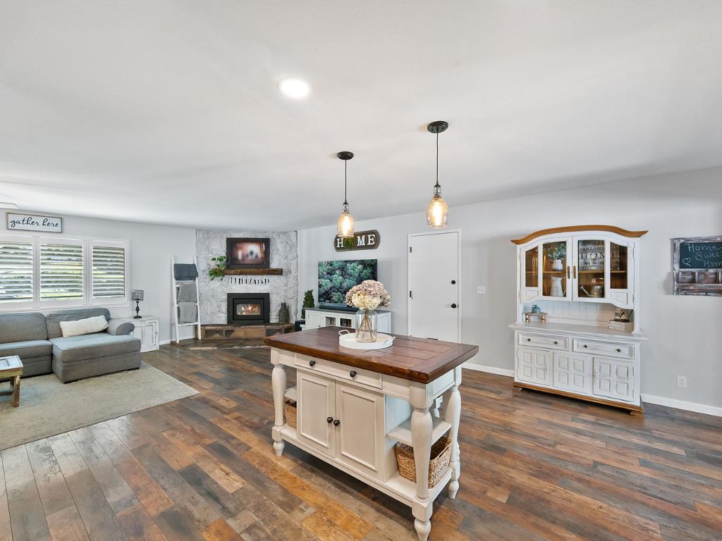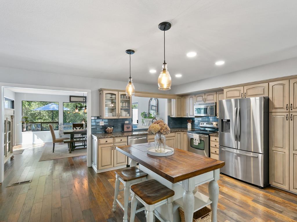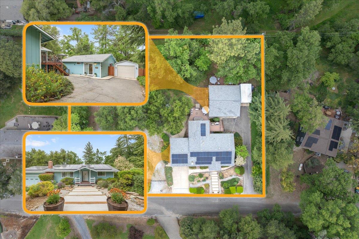 Welcome to this beautifully remodeled property featuring a 3-bed, 2-bath main home and a separate 1-bed, 1-bath Guest House / ADU, ideally located between Placerville, El Dorado Hills, and Folsom Lake in charming Diamond Springs. The main home offers approx. 1,590 sq. ft. upstairs with 2 bedrooms, 2 baths, and an open-concept living area with granite countertops, stainless steel appliances, custom tile backsplash, and a cozy wood-burning stove. A dining area surrounded by windows opens to a wraparound deck with peaceful tree viewsperfect for entertaining or relaxing. Downstairs, a fully permitted 3rd bedroom with private entrance adds 219 sq. ft. of flexible space for guests or home office. The attached 2-car garage (480 sq. ft.) offers laundry hookups and extra storage. The detached single-story Guest House / ADU adds approx. 815 sq. ft. with its own driveway, 1-car garage, granite kitchen, custom fireplace, central HVAC, and deck with built-in BBQ. Fully owned solar, RV parking, chicken coop (hens included), and walkability to shops, trails, breweries, and nearby lakes make this the perfect blend of country comfort and El Dorado County convenience.