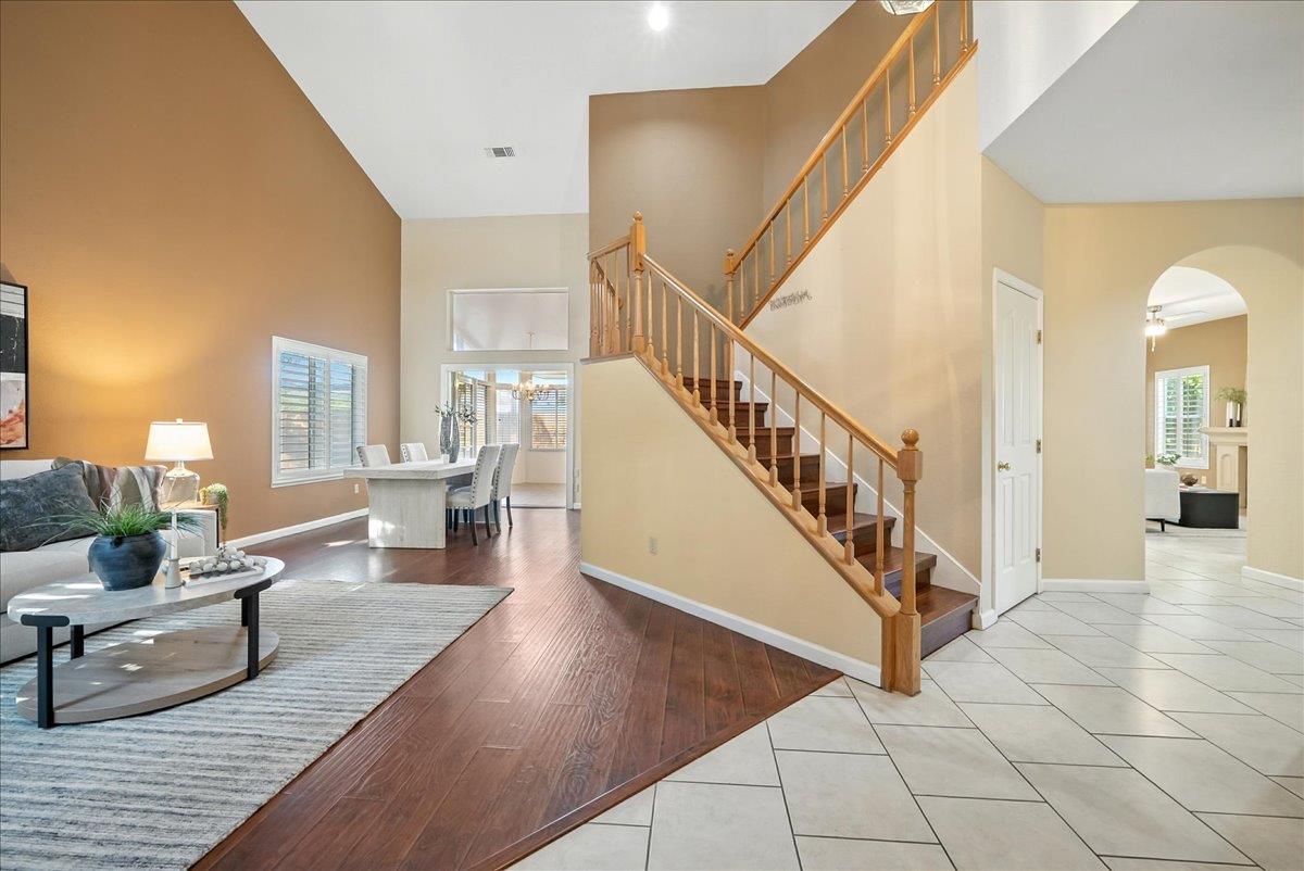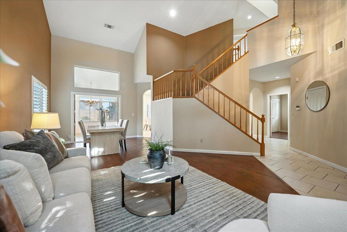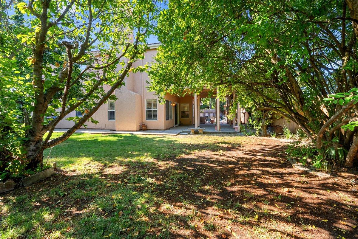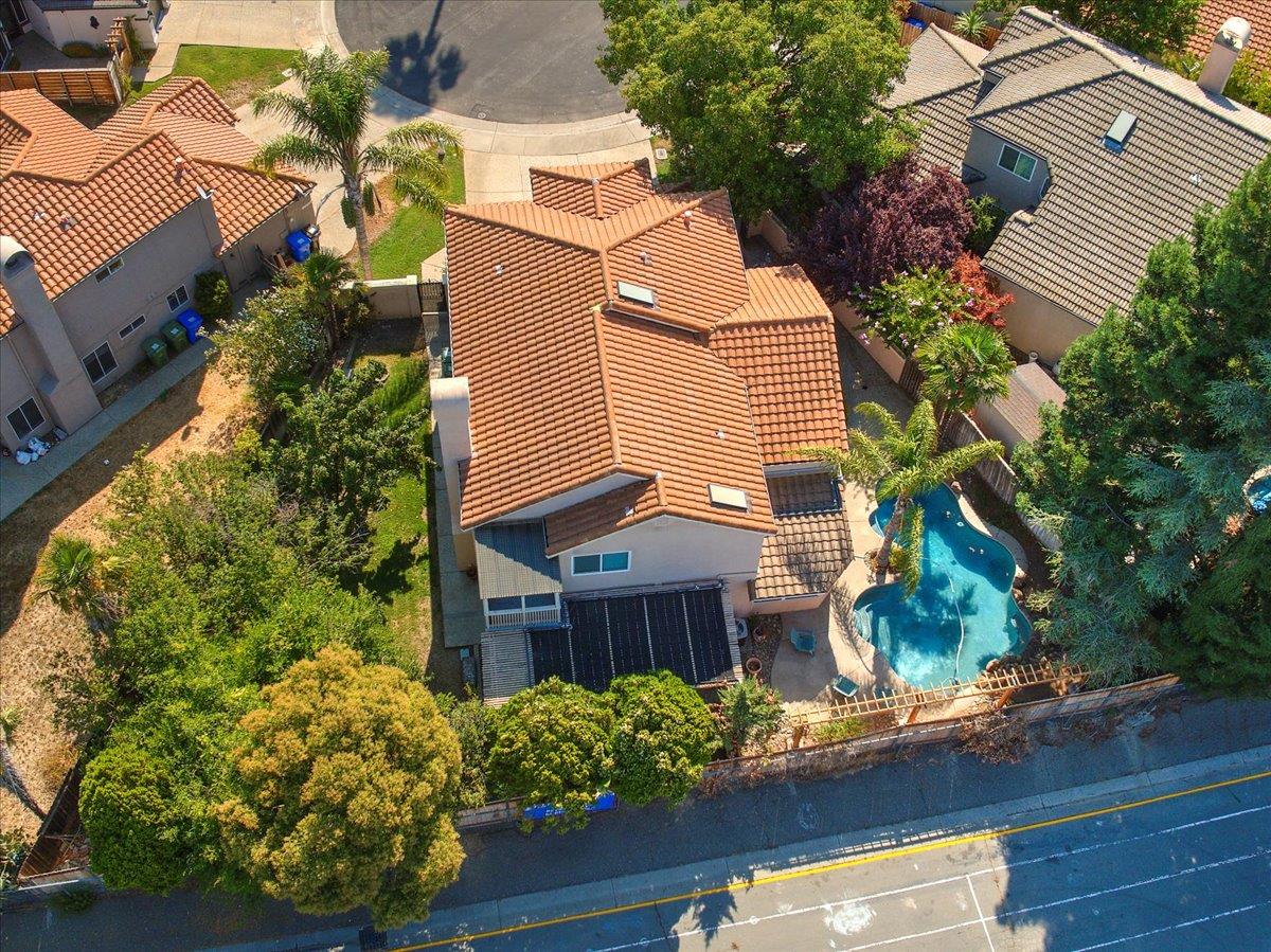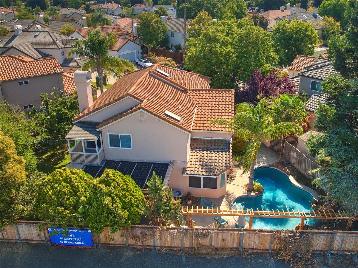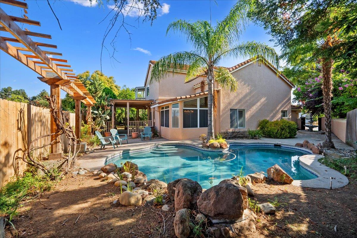 Tucked at the end of a court with no rear neighbor, this home offers the space, updates and location you've been looking for! A welcoming grand entry with soaring ceilings sets the tone, leading to a thoughtful layout with both formal and casual living areas. The great room style kitchen opens to the family room and an eat-in nook, creating an easy flow for daily life and entertaining. Enjoy generous amounts of counter space, SS appliances, updated cabinets and sleek quartz countertops. A bedroom and renovated full bath on the main level offer flexibility for guests or multigenerational living, plus you'll find a versatile flex space off the formal dining area, perfect for a home office, gym, playroom, or creative studio. Upstairs, the spacious primary suite invites you to unwind with raised ceilings, sitting area and great natural light. The tastefully updated ensuite bath offers a stall shower, soaking tub, dual vanities, walk-in closet and skylight. 3 more bedrooms plus a full bath with double sinks and shower over tub round out upstairs. Enjoy the lifestyle provided by the private backyard with a sparkling pool, lawn area, and fruit trees. 3-car garage, central air and a prime location close to amenities too! Come make this one yours!