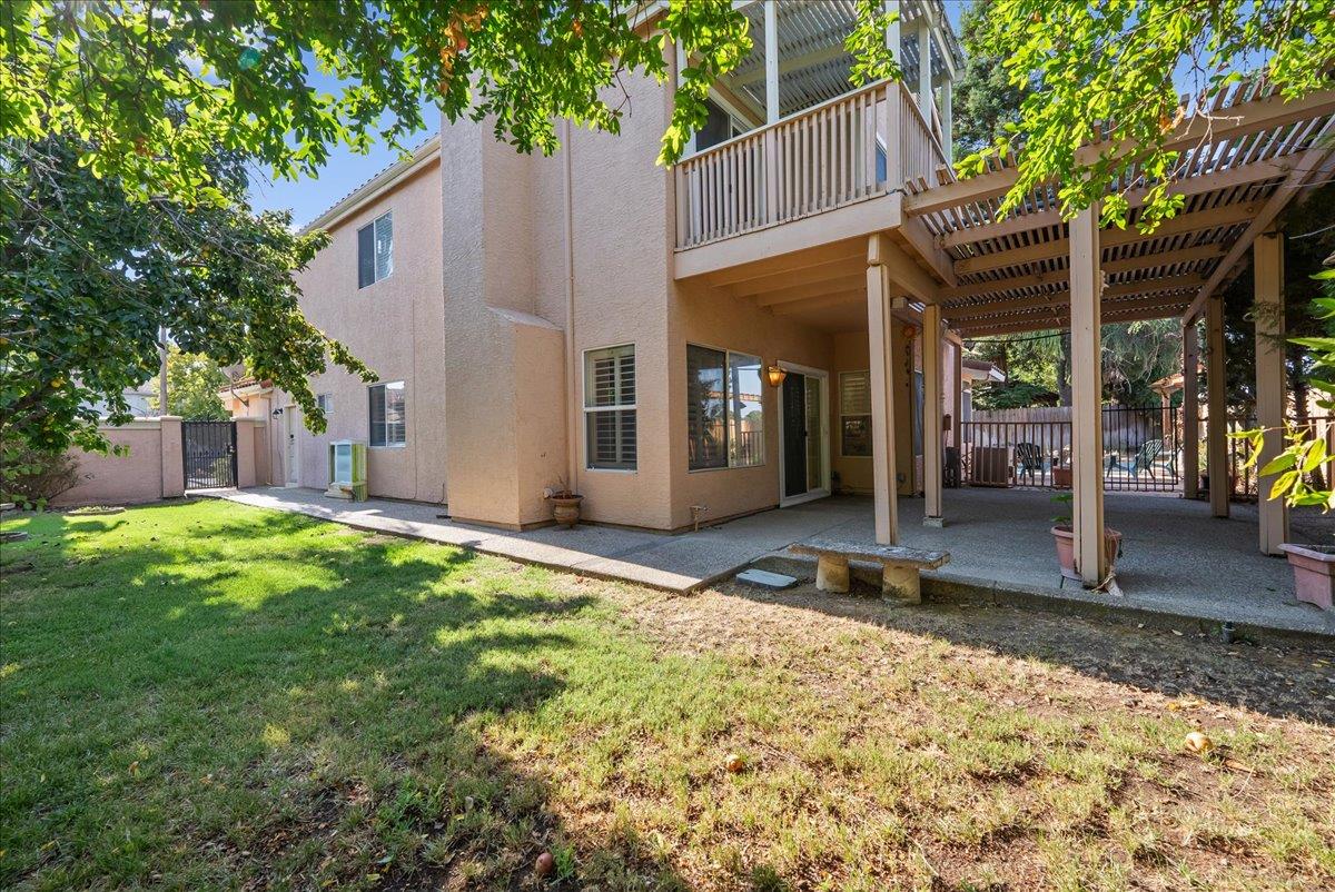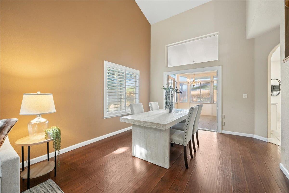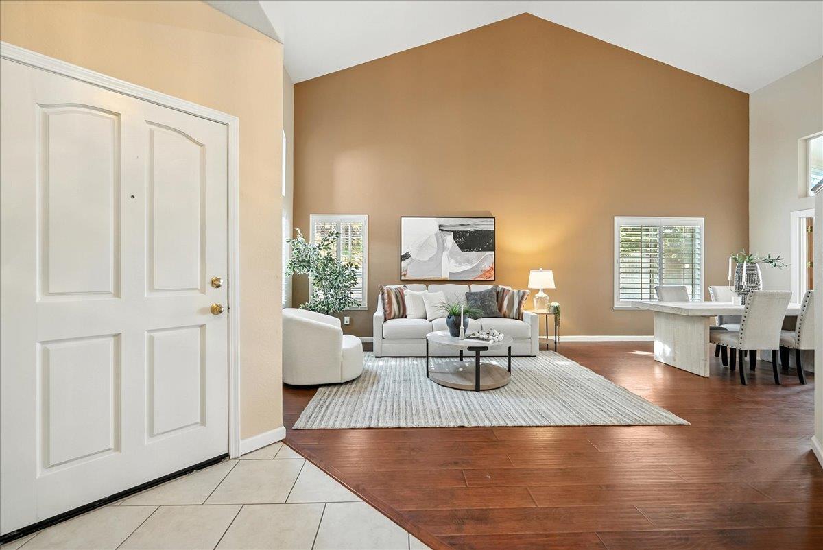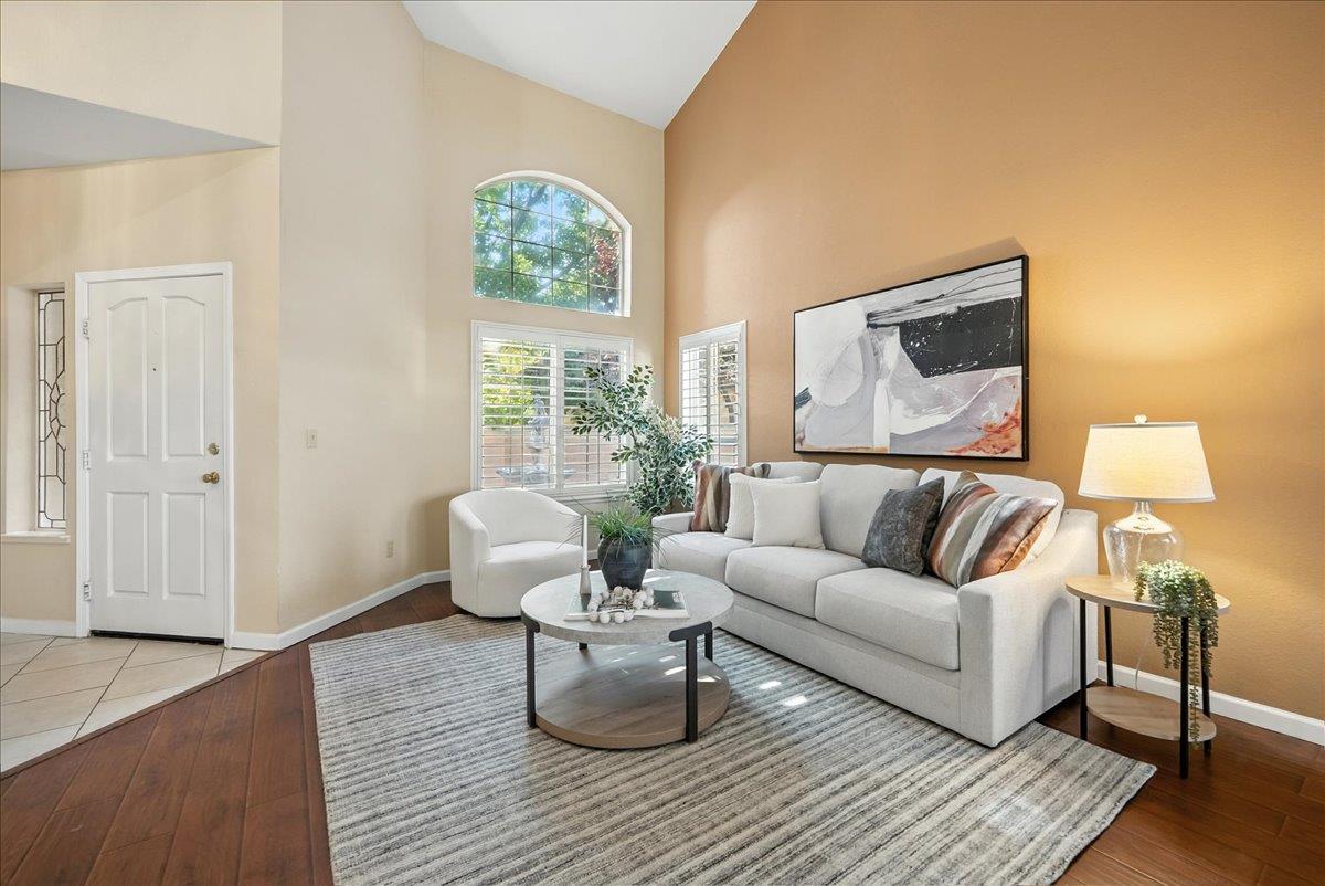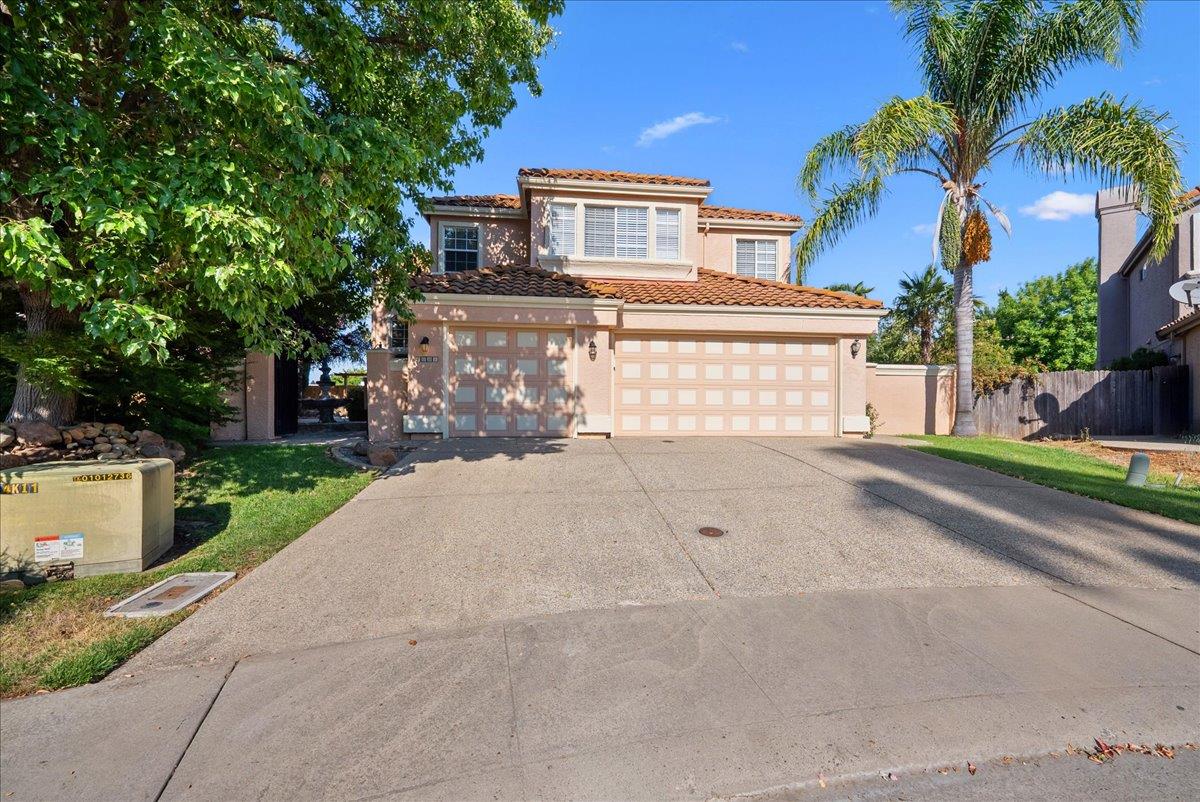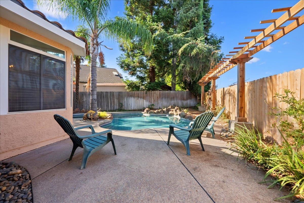 Tucked at the end of a court with no rear neighbor, this home offers the space, updates and location you've been looking for! A welcoming grand entry with soaring ceilings sets the tone, leading to a thoughtful layout with both formal and casual living areas. The great room style kitchen opens to the family room and an eat-in nook, creating an easy flow for daily life and entertaining. Enjoy generous amounts of counter space, SS appliances, updated cabinets and sleek quartz countertops. A bedroom and renovated full bath on the main level offer flexibility for guests or multigenerational living, plus you'll find a versatile flex space off the formal dining area, perfect for a home office, gym, playroom, or creative studio. Upstairs, the spacious primary suite invites you to unwind with raised ceilings, sitting area and great natural light. The tastefully updated ensuite bath offers a stall shower, soaking tub, dual vanities, walk-in closet and skylight. 3 more bedrooms plus a full bath with double sinks and shower over tub round out upstairs. Enjoy the lifestyle provided by the private backyard with a sparkling pool, lawn area, and fruit trees. 3-car garage, central air and a prime location close to amenities too! Come make this one yours!