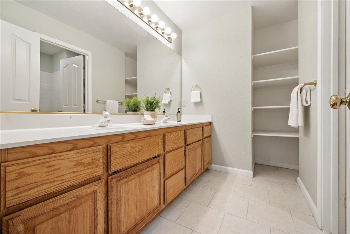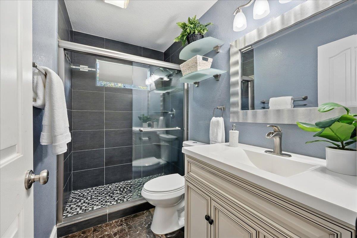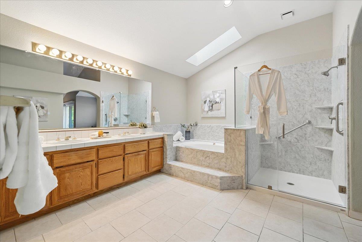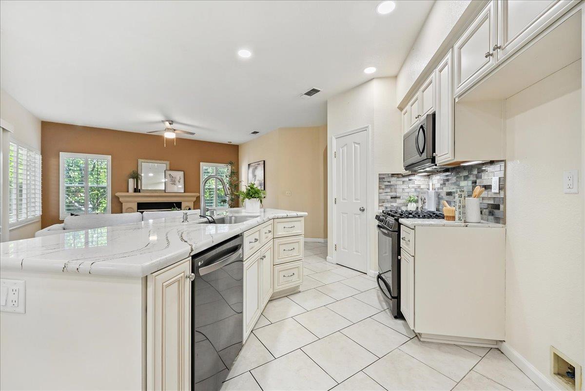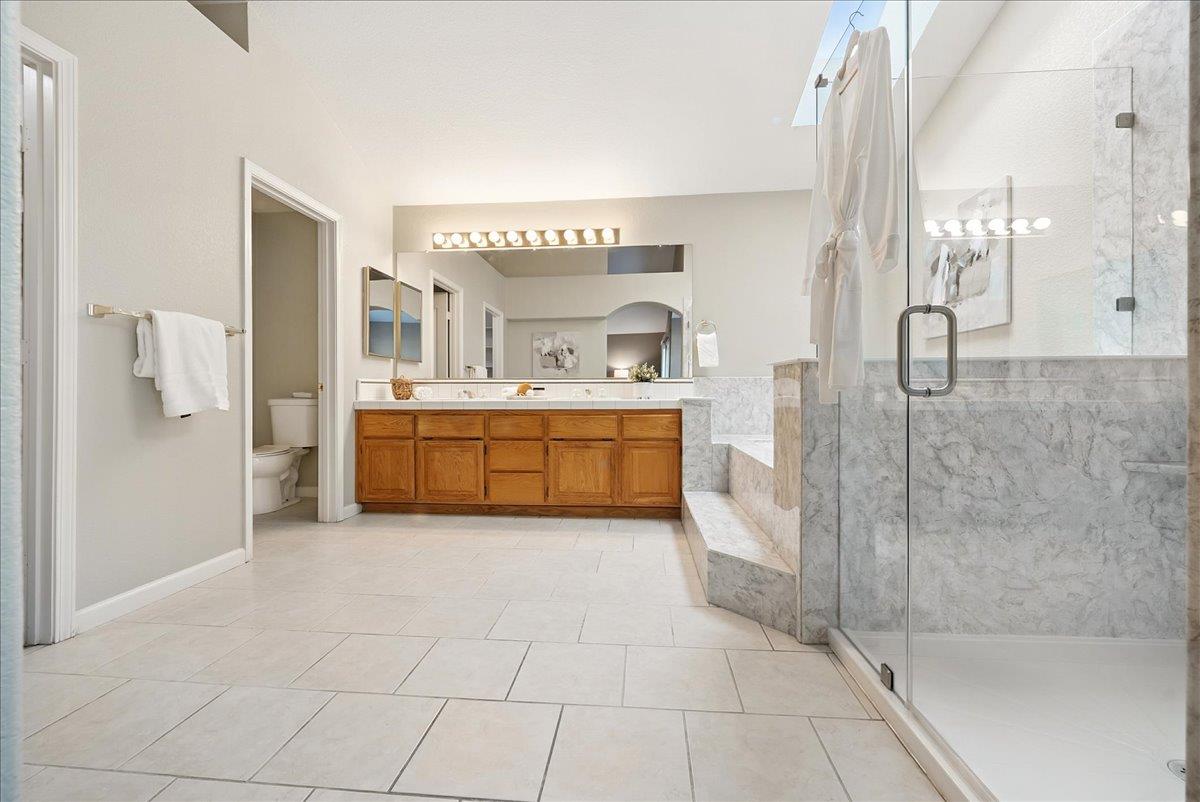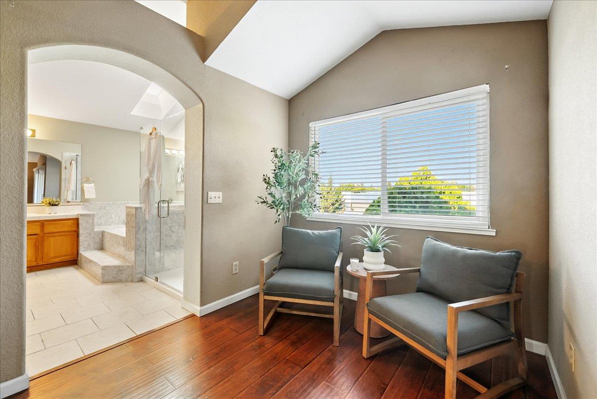 Tucked at the end of a court with no rear neighbor, this home offers the space, updates and location you've been looking for! A welcoming grand entry with soaring ceilings sets the tone, leading to a thoughtful layout with both formal and casual living areas. The great room style kitchen opens to the family room and an eat-in nook, creating an easy flow for daily life and entertaining. Enjoy generous amounts of counter space, SS appliances, updated cabinets and sleek quartz countertops. A bedroom and renovated full bath on the main level offer flexibility for guests or multigenerational living, plus you'll find a versatile flex space off the formal dining area, perfect for a home office, gym, playroom, or creative studio. Upstairs, the spacious primary suite invites you to unwind with raised ceilings, sitting area and great natural light. The tastefully updated ensuite bath offers a stall shower, soaking tub, dual vanities, walk-in closet and skylight. 3 more bedrooms plus a full bath with double sinks and shower over tub round out upstairs. Enjoy the lifestyle provided by the private backyard with a sparkling pool, lawn area, and fruit trees. 3-car garage, central air and a prime location close to amenities too! Come make this one yours!