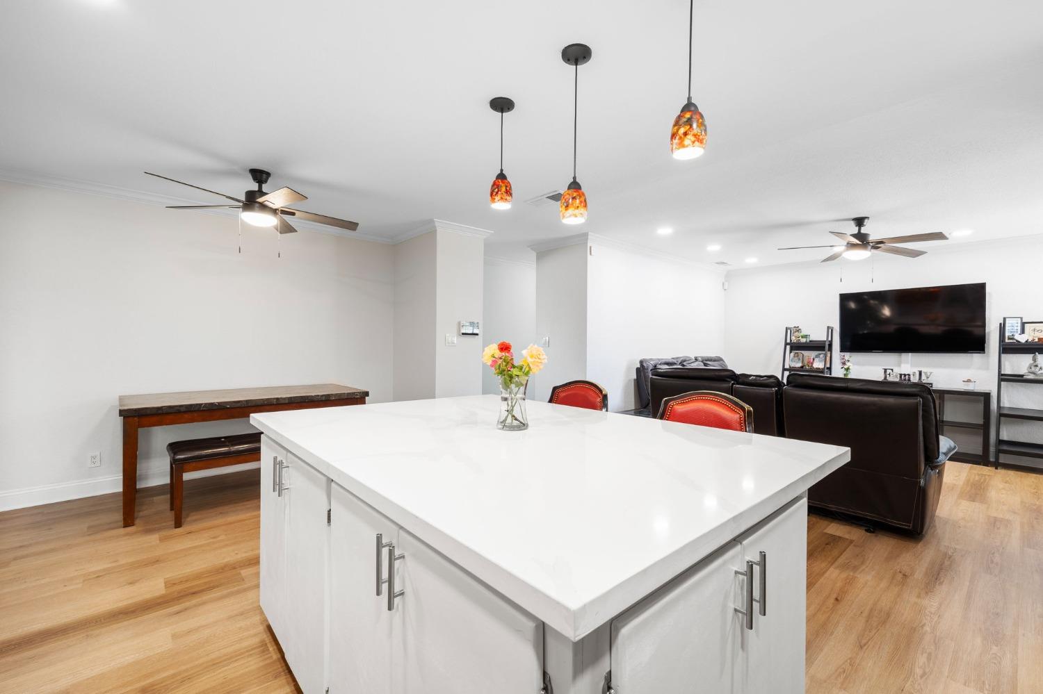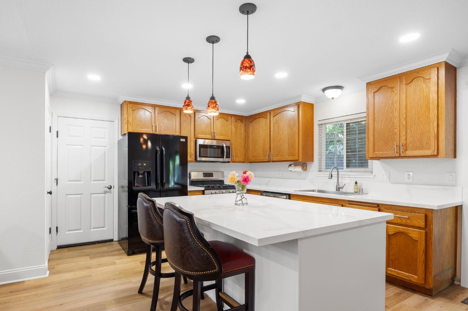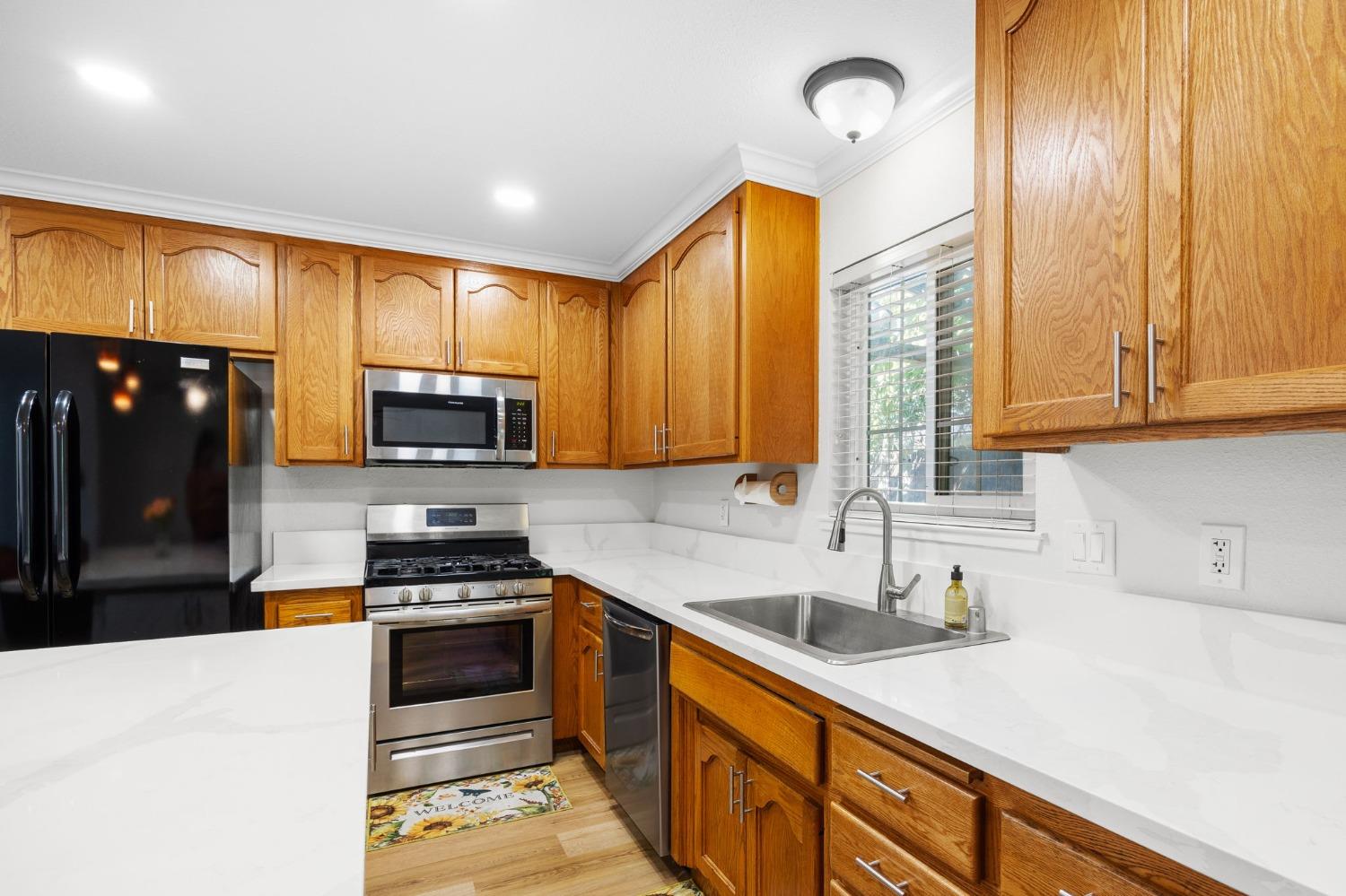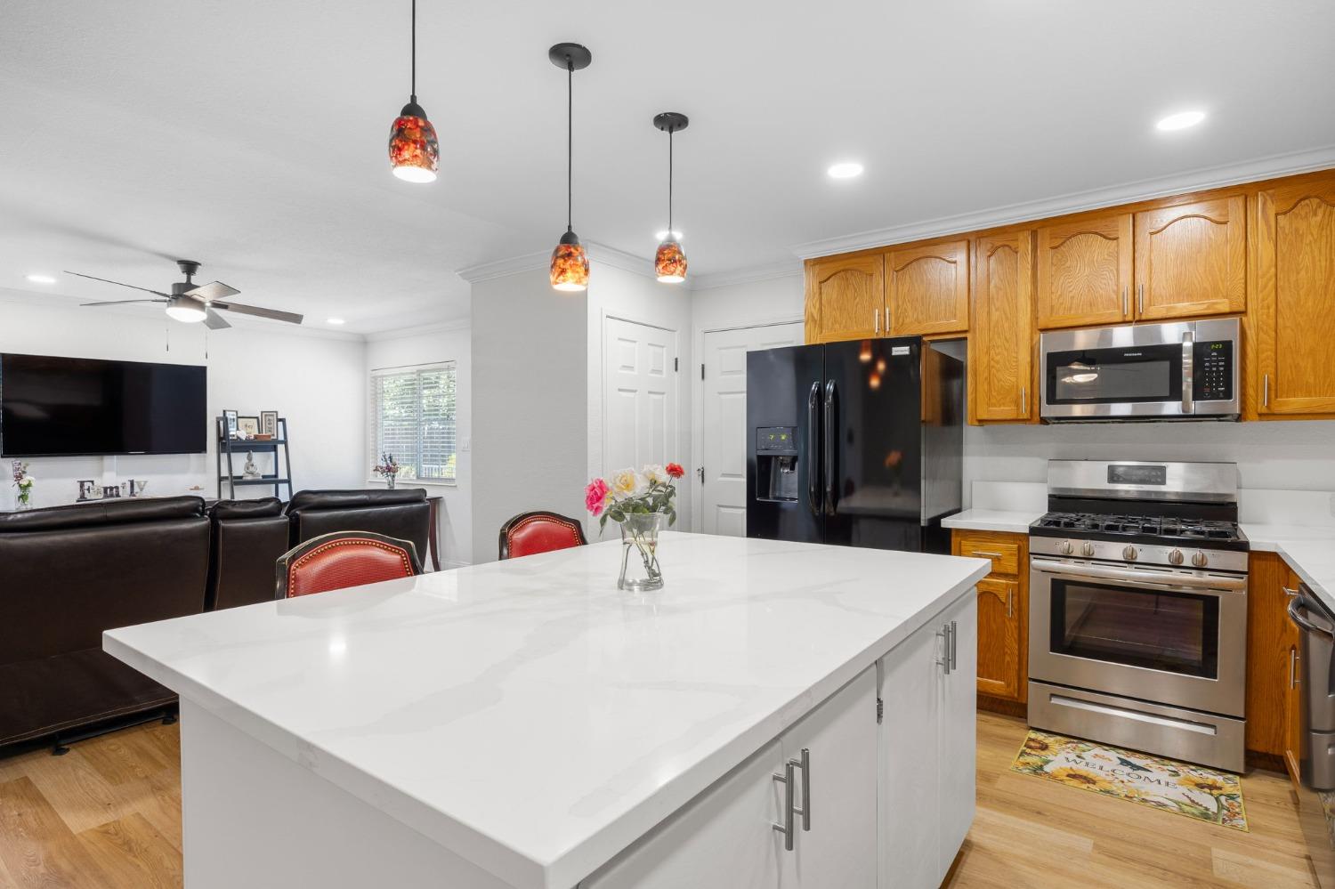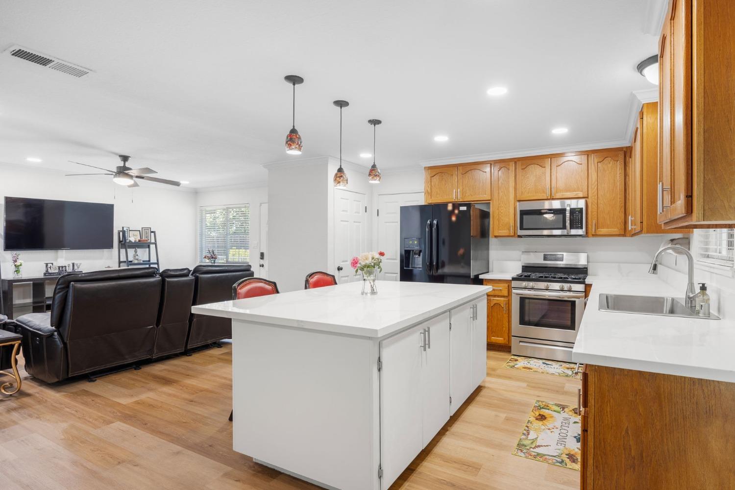 Remodeled & Move-in Ready! This single-story 4-bedroom, 2-bathroom home in central Citrus Heights offers exceptional value and space. It's rare to find a home w/ 4 bedrooms and such a stunning open-concept layout in this area. Nestled in a quiet neighborhood, this gem boasts a large driveway w/ room for an RV, boat, or multiple cars, along w/ a 2-car direct-access garage. The beautifully updated interior features wood plank flooring, quartz countertops, refinished cabinets, a kitchen island, gas range, fully remodeled bathrooms w/ custom tile, neutral paint, crown molding, Tesla solar, & more! The open-concept kitchen, dining, & living areas are perfect for entertaining, highlighted by the large island, stainless steel appliances, a spacious pantry, & a massive sliding glass door leading to a patio. The fully fenced backyard is spacious & level, w/ room for a small ADU, pool, or play area for kids & pets. Centrally located, this home is walking distance to schools & shopping, w/ quick access to I-80 for easy commutes or weekend trips to Tahoe!