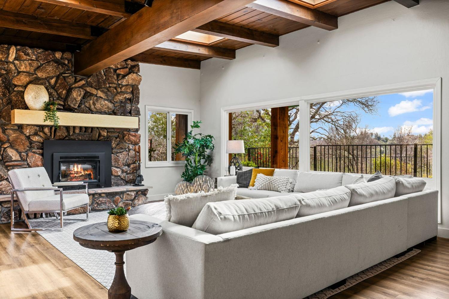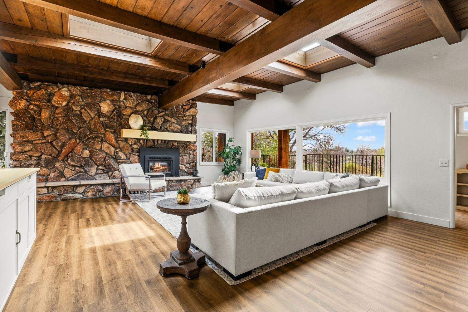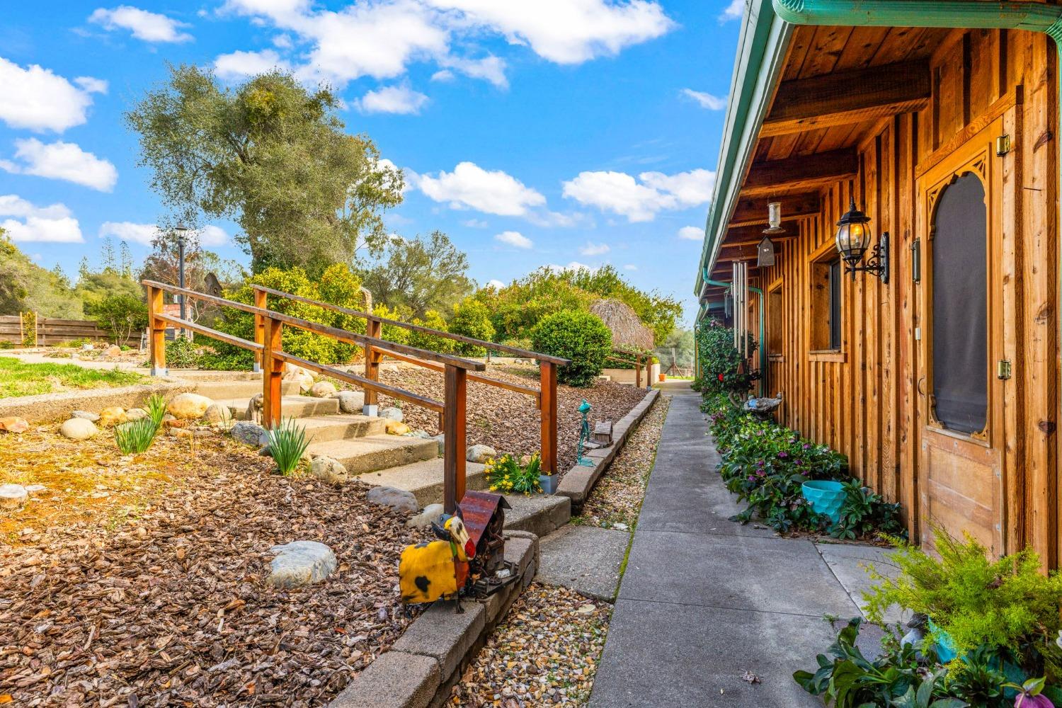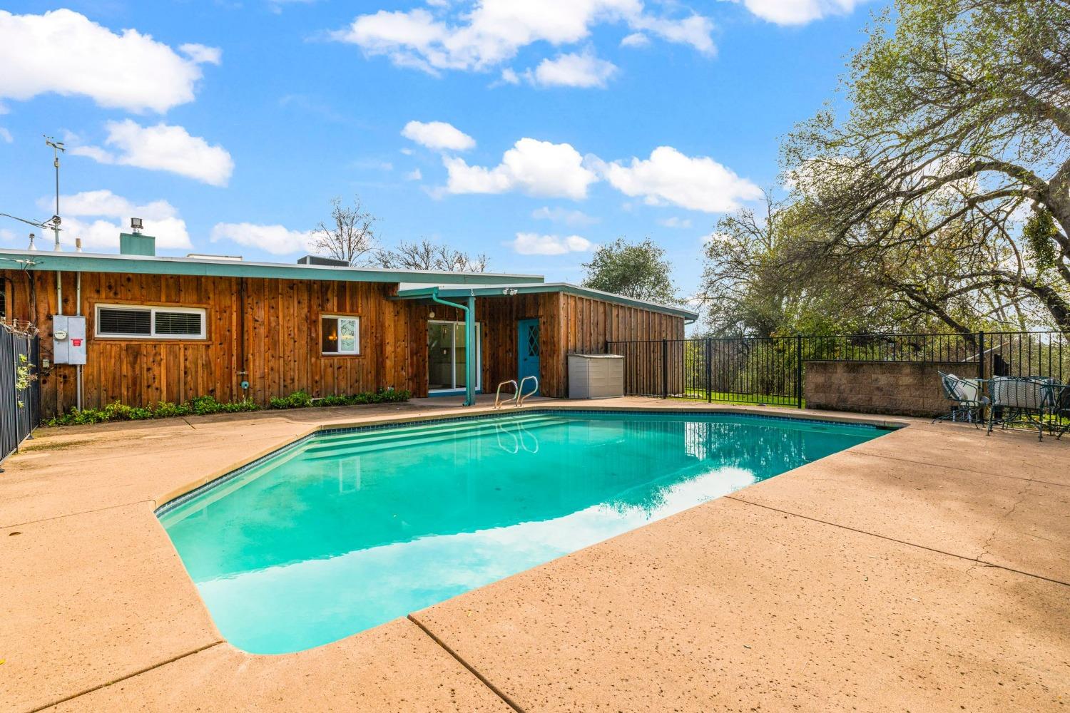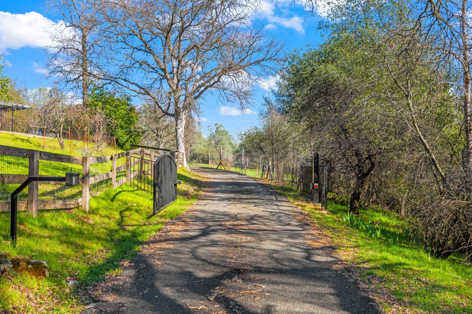 Discover the perfect opportunity for a multi-family, homesteading estate on a private, tree-lined expanse with breathtaking pastoral views. Formerly a cattle ranch, this property features 4 1/2 acres, lush pastures, a 3-stall barn, and an approx. 900 sqft Ponderosa-style second home. Conveniently located close to Historic Placerville, this Mid-Century modern home boasts a charming knotty pine & wood beam ceiling, a stone fireplace, and a bright atrium. The remodeled kitchen is equipped with a chef's 6-burner range, custom cabinetry, granite countertops, and stainless-steel appliances, complemented by new laminate floors throughout. Outside, enjoy and a saltwater pool, fenced orchard & chicken coop & 3-stall barn. The property is gated, offering RV parking and dump facilities along with owned field mounted solar.