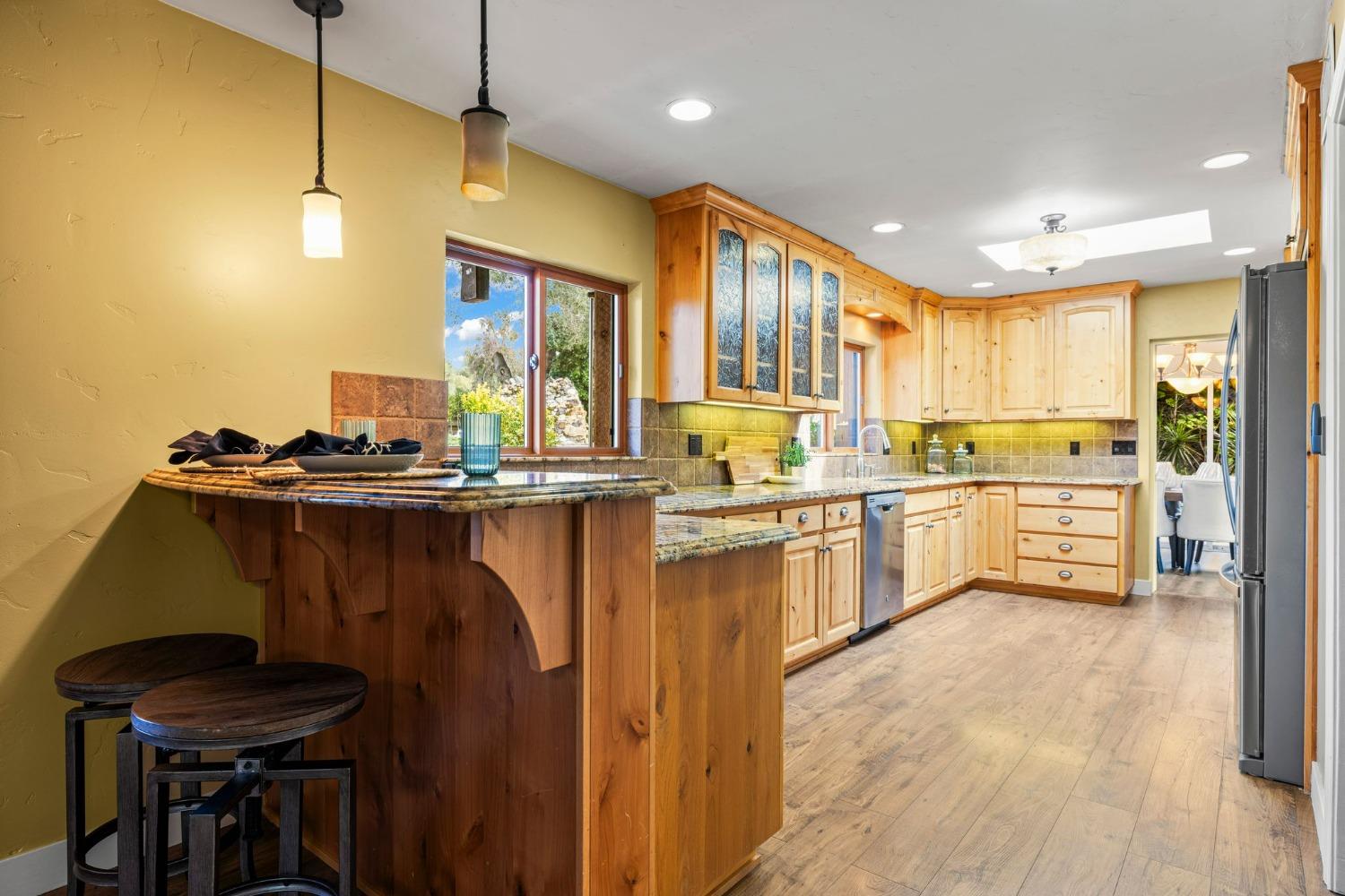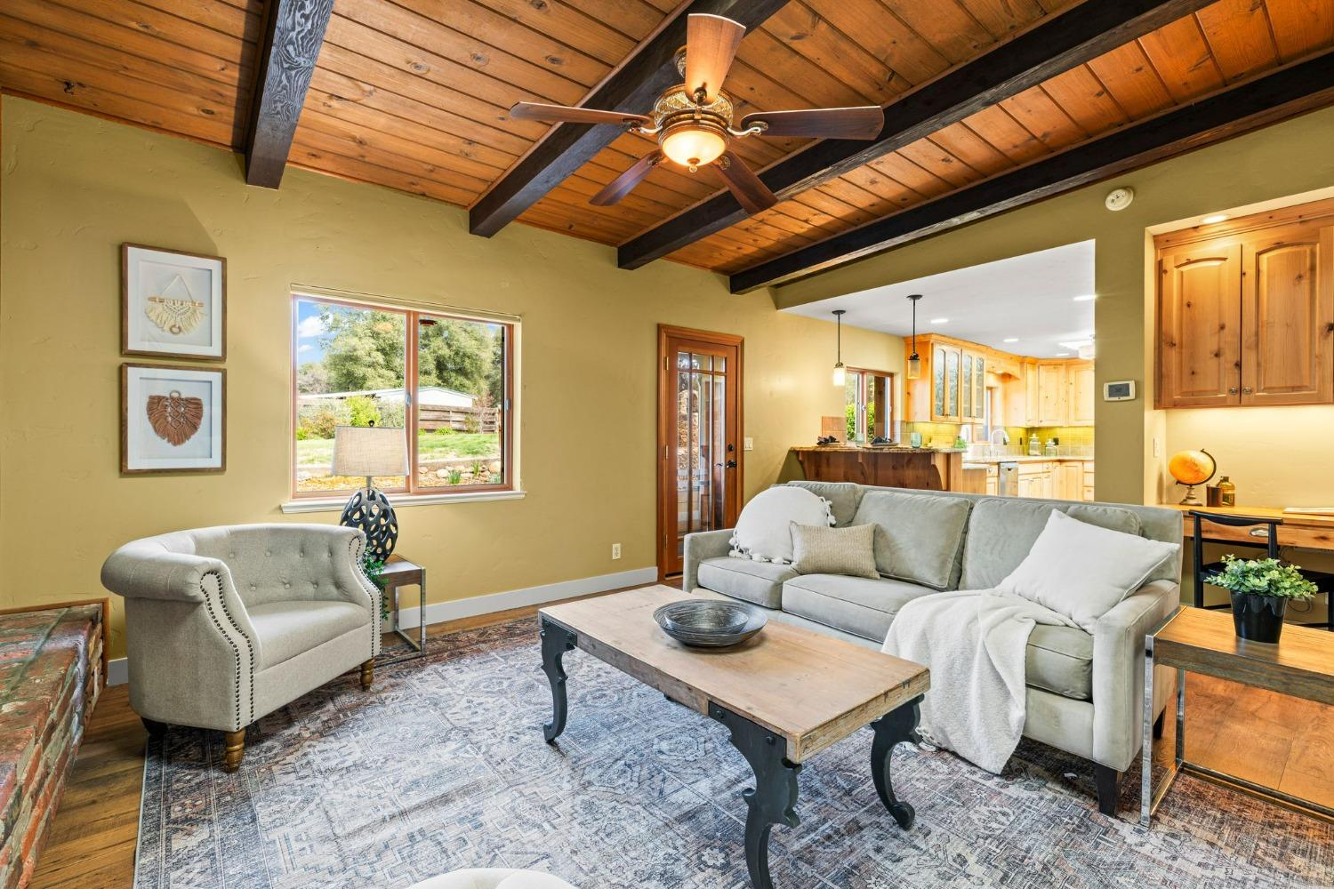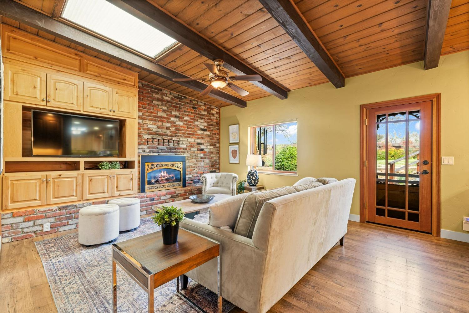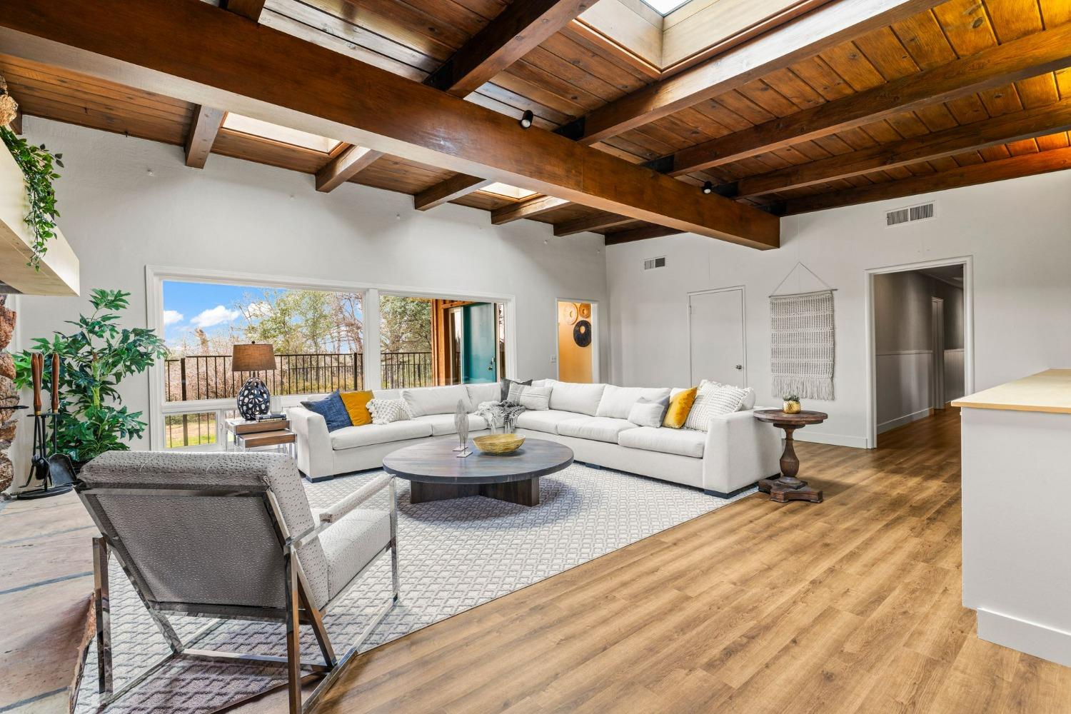 Discover the perfect opportunity for a multi-family, homesteading estate on a private, tree-lined expanse with breathtaking pastoral views. Formerly a cattle ranch, this property features 4 1/2 acres, lush pastures, a 3-stall barn, and an approx. 900 sqft Ponderosa-style second home. Conveniently located close to Historic Placerville, this Mid-Century modern home boasts a charming knotty pine & wood beam ceiling, a stone fireplace, and a bright atrium. The remodeled kitchen is equipped with a chef's 6-burner range, custom cabinetry, granite countertops, and stainless-steel appliances, complemented by new laminate floors throughout. Outside, enjoy and a saltwater pool, fenced orchard & chicken coop & 3-stall barn. The property is gated, offering RV parking and dump facilities along with owned field mounted solar.