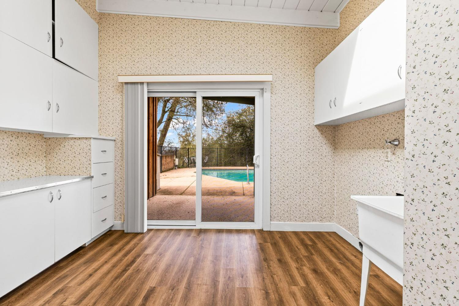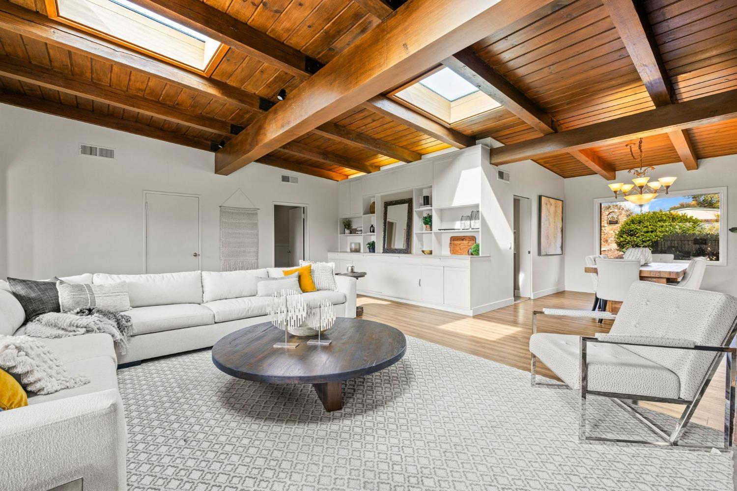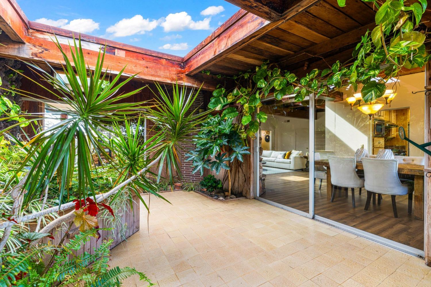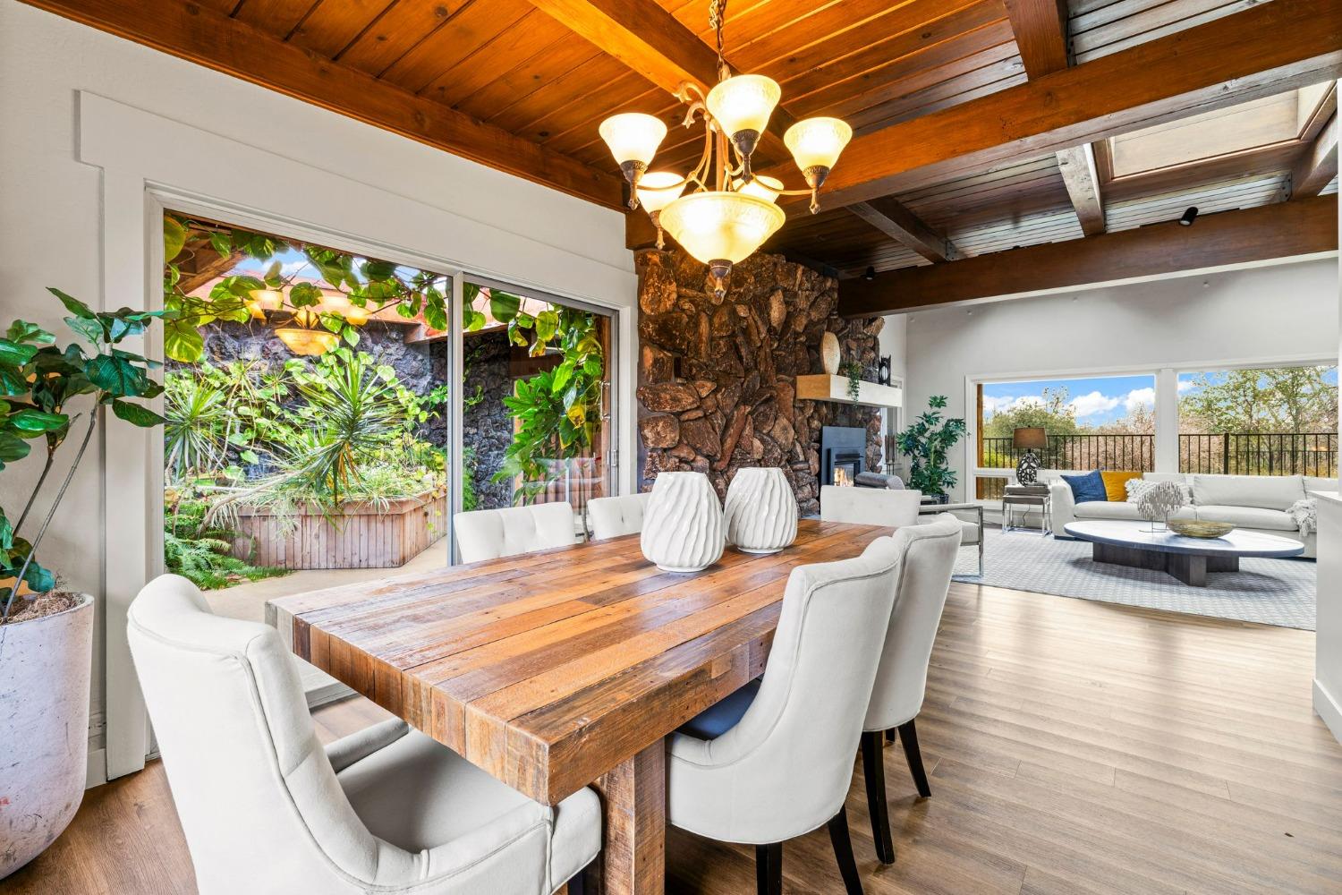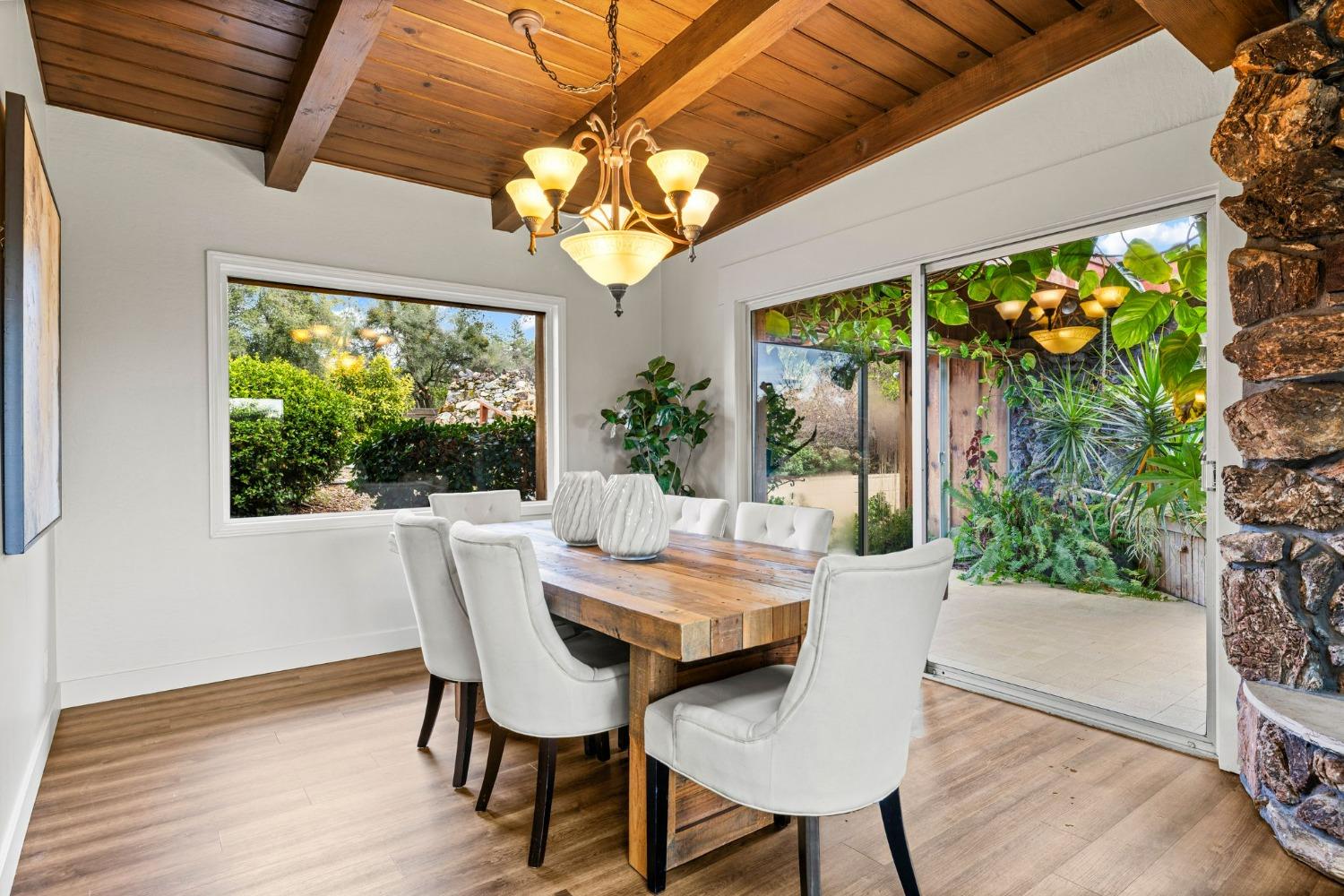 Discover the perfect opportunity for a multi-family, homesteading estate on a private, tree-lined expanse with breathtaking pastoral views. Formerly a cattle ranch, this property features 4 1/2 acres, lush pastures, a 3-stall barn, and an approx. 900 sqft Ponderosa-style second home. Conveniently located close to Historic Placerville, this Mid-Century modern home boasts a charming knotty pine & wood beam ceiling, a stone fireplace, and a bright atrium. The remodeled kitchen is equipped with a chef's 6-burner range, custom cabinetry, granite countertops, and stainless-steel appliances, complemented by new laminate floors throughout. Outside, enjoy and a saltwater pool, fenced orchard & chicken coop & 3-stall barn. The property is gated, offering RV parking and dump facilities along with owned field mounted solar.