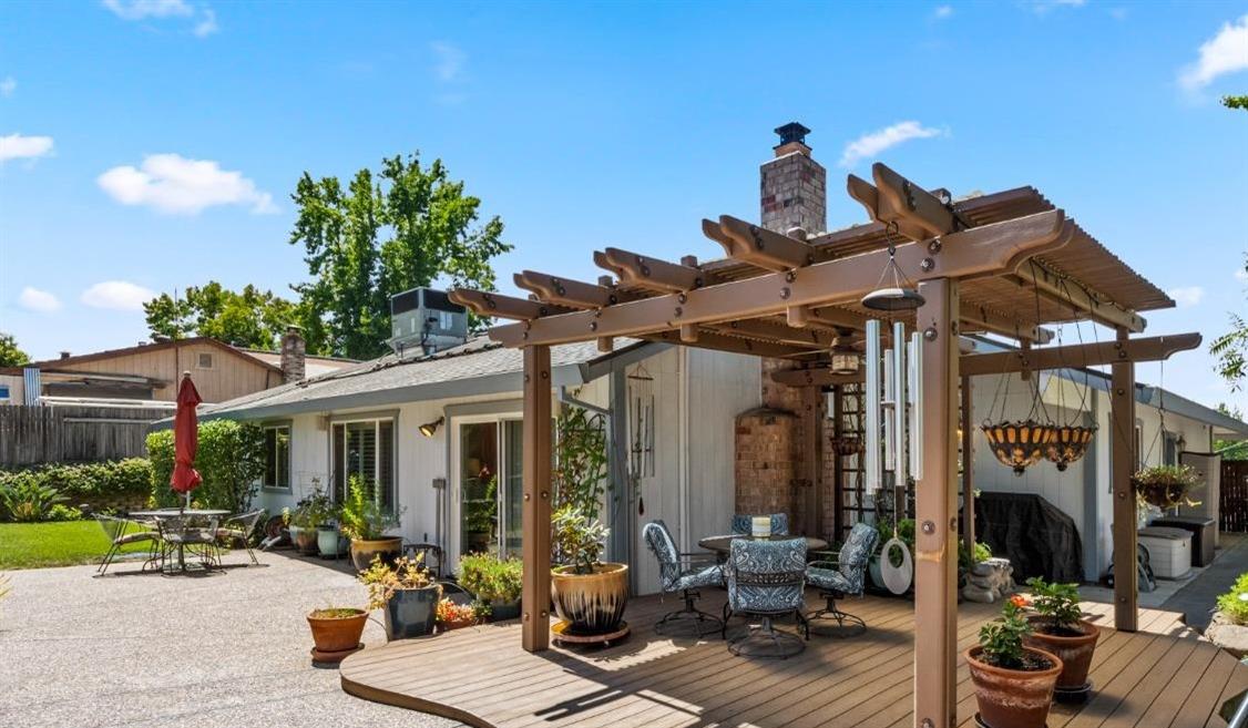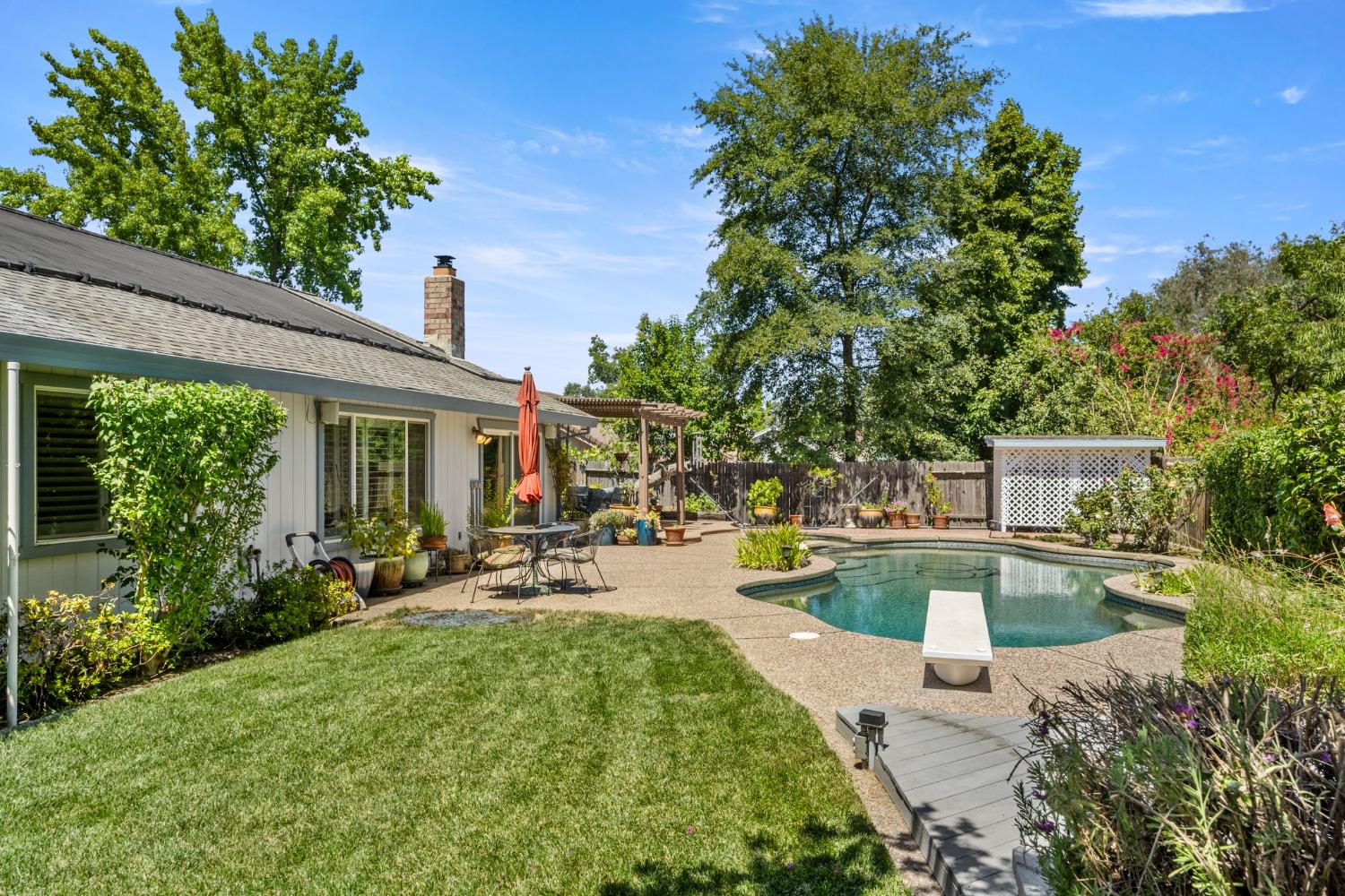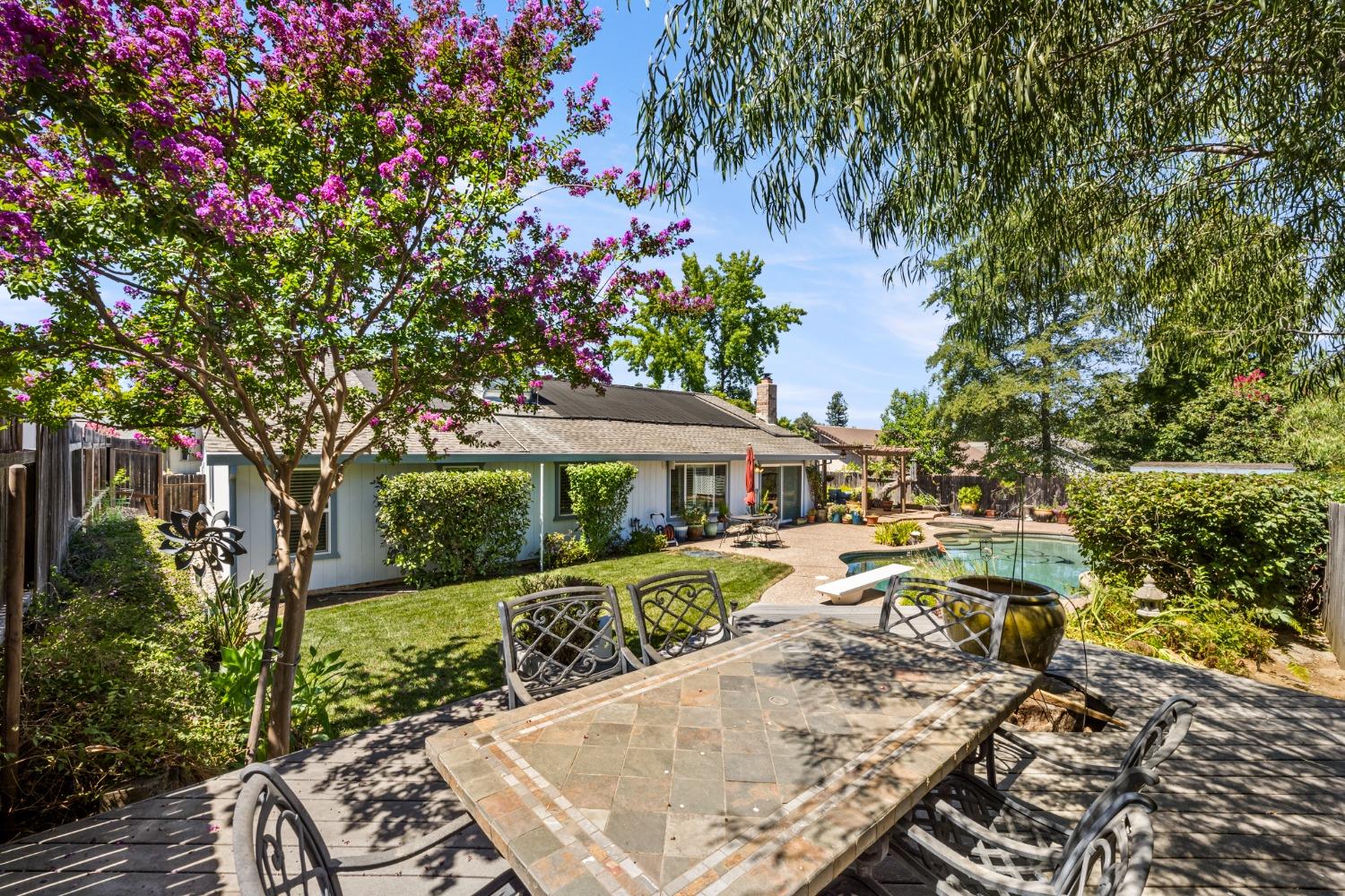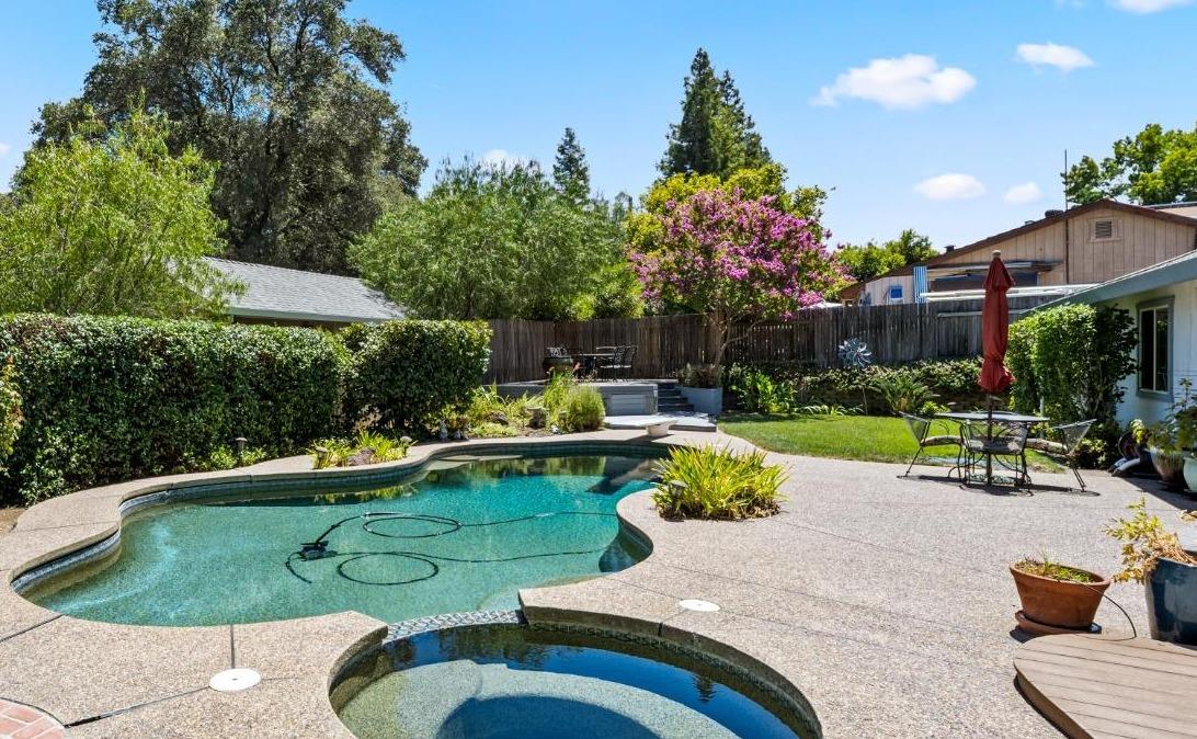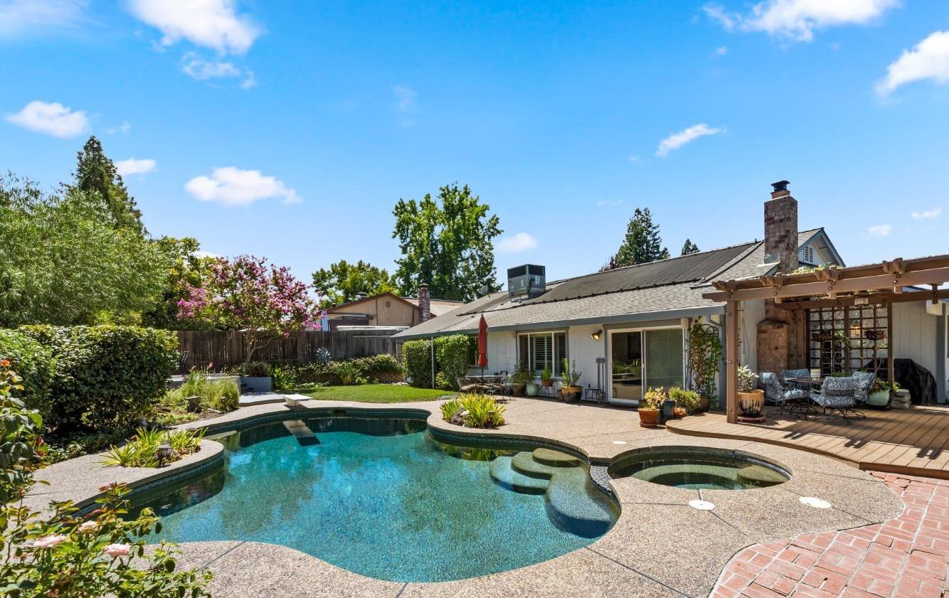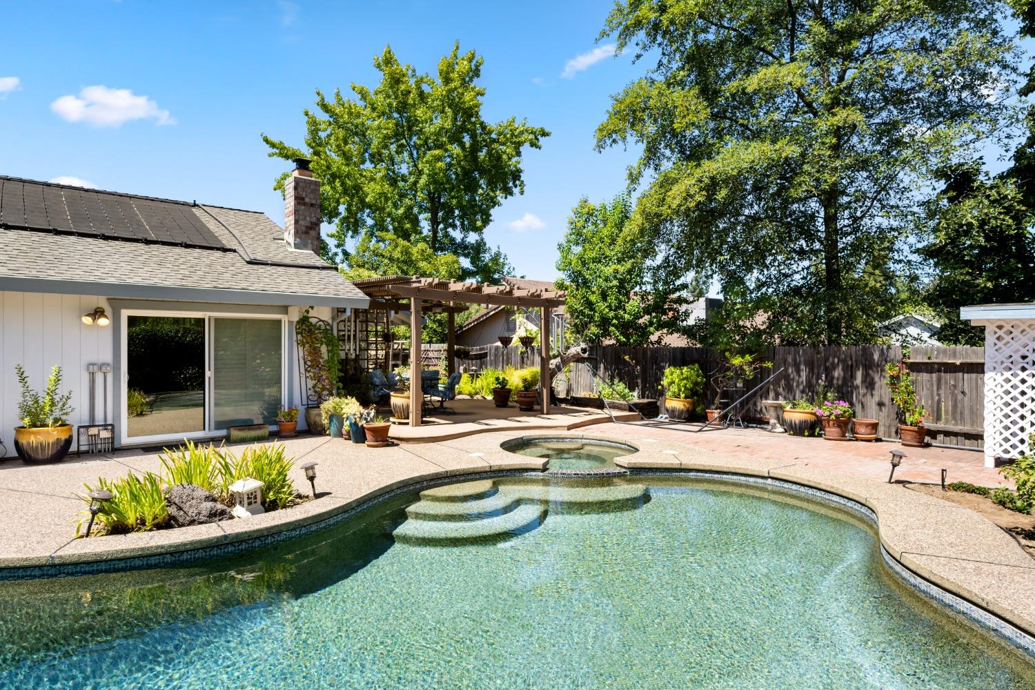 Welcome to 8690 Gaines Avenue, located in the esteemed Almond Orchard Estates neighborhood of Orangevale. This elegant residence offers a smart and sophisticated living experience, all nestled on a generous lot, with mature landscaping. Upon entering, you'll be greeted by an inviting interior that seamlessly blends style and functionality. The upgraded kitchen is a true culinary haven, boasting modern amenities and ample storage. The prep sink in the kitchen island is perfect for creating delicious meals to be enjoyed casually at the counter or in the dining area. Natural light dances through the windows adorned with shutters, creating a warm and welcoming atmosphere throughout the home. Step outside to your private oasis, where you'll find a solar-heated pool and spa, providing the perfect setting for relaxation and entertainment. The expansive backyard features two decks and varying levels of shade for your comfort. RV parking offers convenience and versatility for your lifestyle needs. Don't miss the opportunity to make 8690 Gaines Avenue your new home, where elegance, functionality, and fun come together to create an exceptional living experience. Schedule your private tour today and discover the endless possibilities that await in this remarkable Orangevale property.